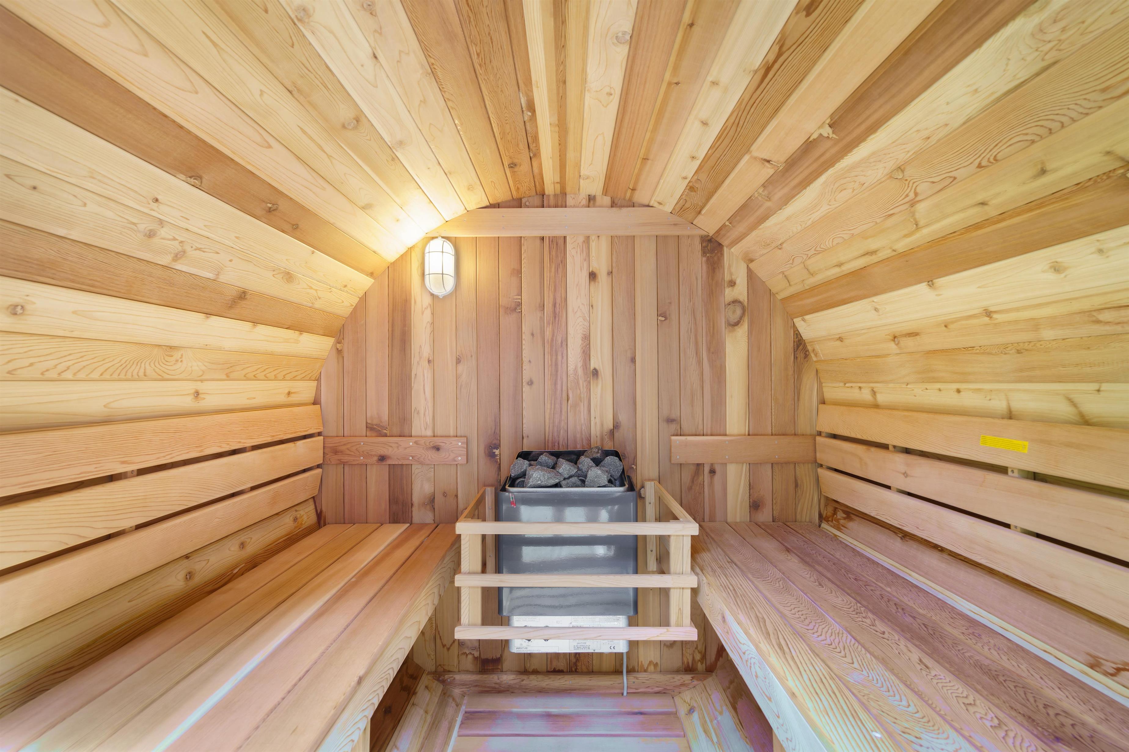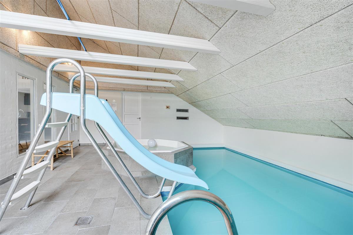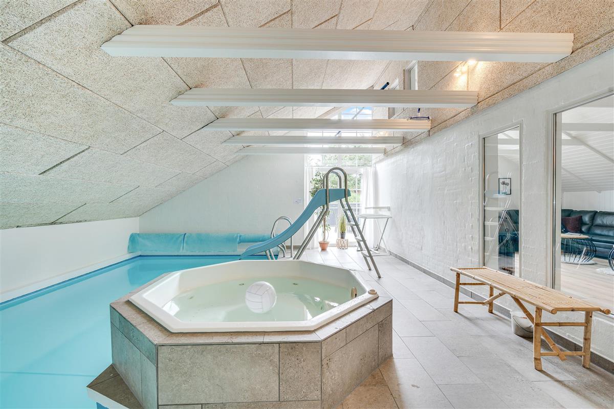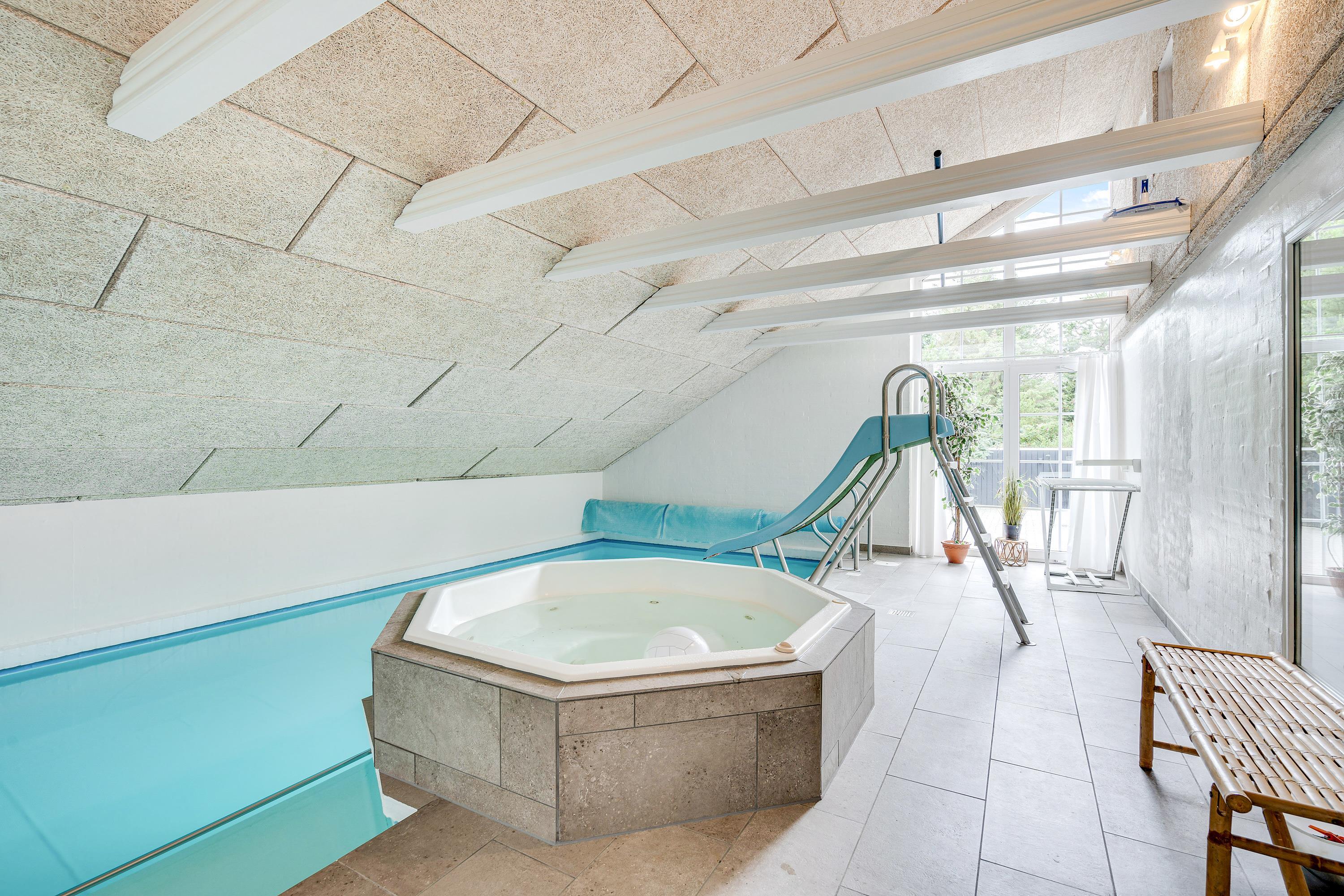 The pool area features a large swimming pool perfect for both play and exercise, alongside a hot tub - particularly appealing for wellness enthusiasts. Adjacent to this is a bathroom with washing machine and tumble dryer. From the pool area, you can access the terrace and outdoor sauna directly - perfect for a complete wellness experience.