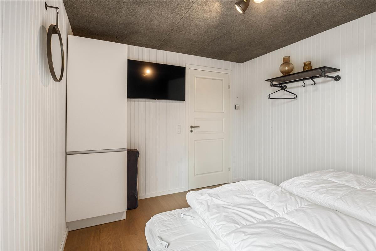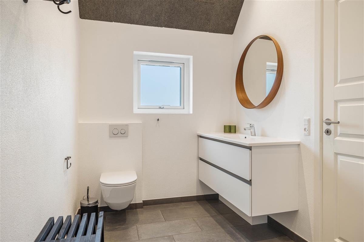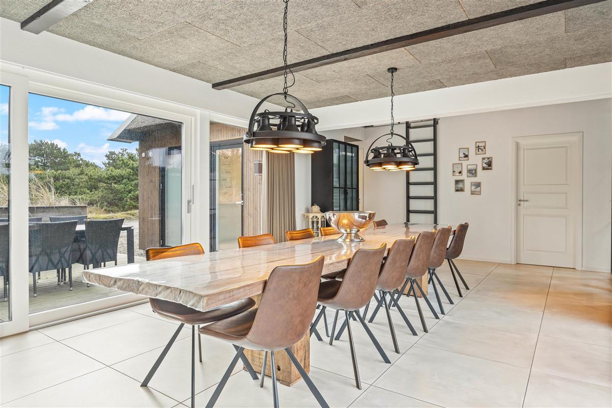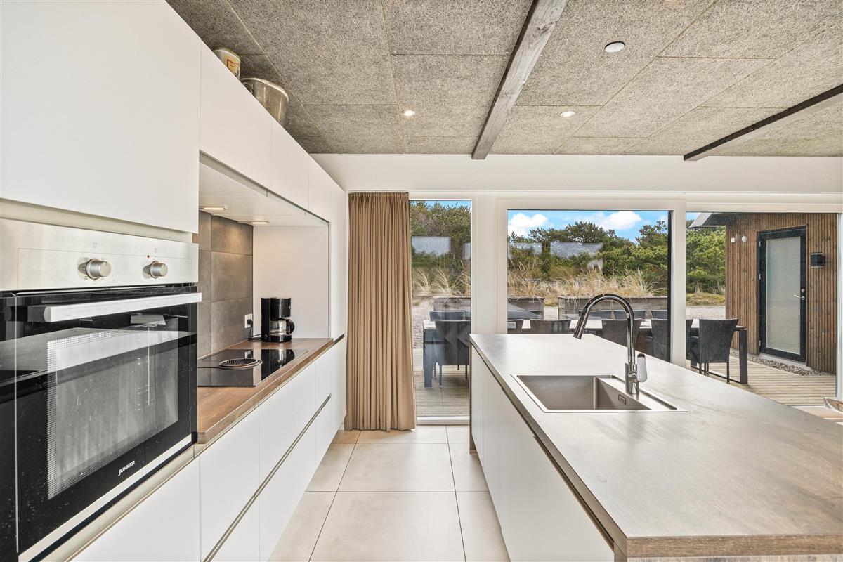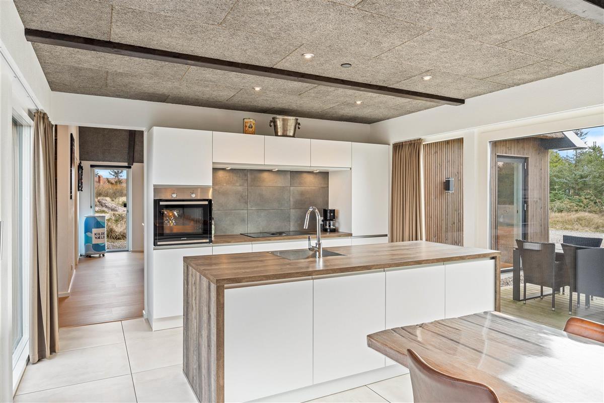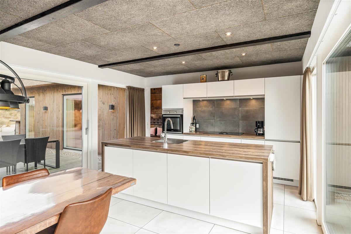 On the other side, you'll find the spacious kitchen with its cooking island and modern appliances. Here you can cook together and dine at the large dining table - perhaps try your hand at Danish recipes. The entire holiday home is heated by an energy-efficient heat pump powering the underfloor heating system.