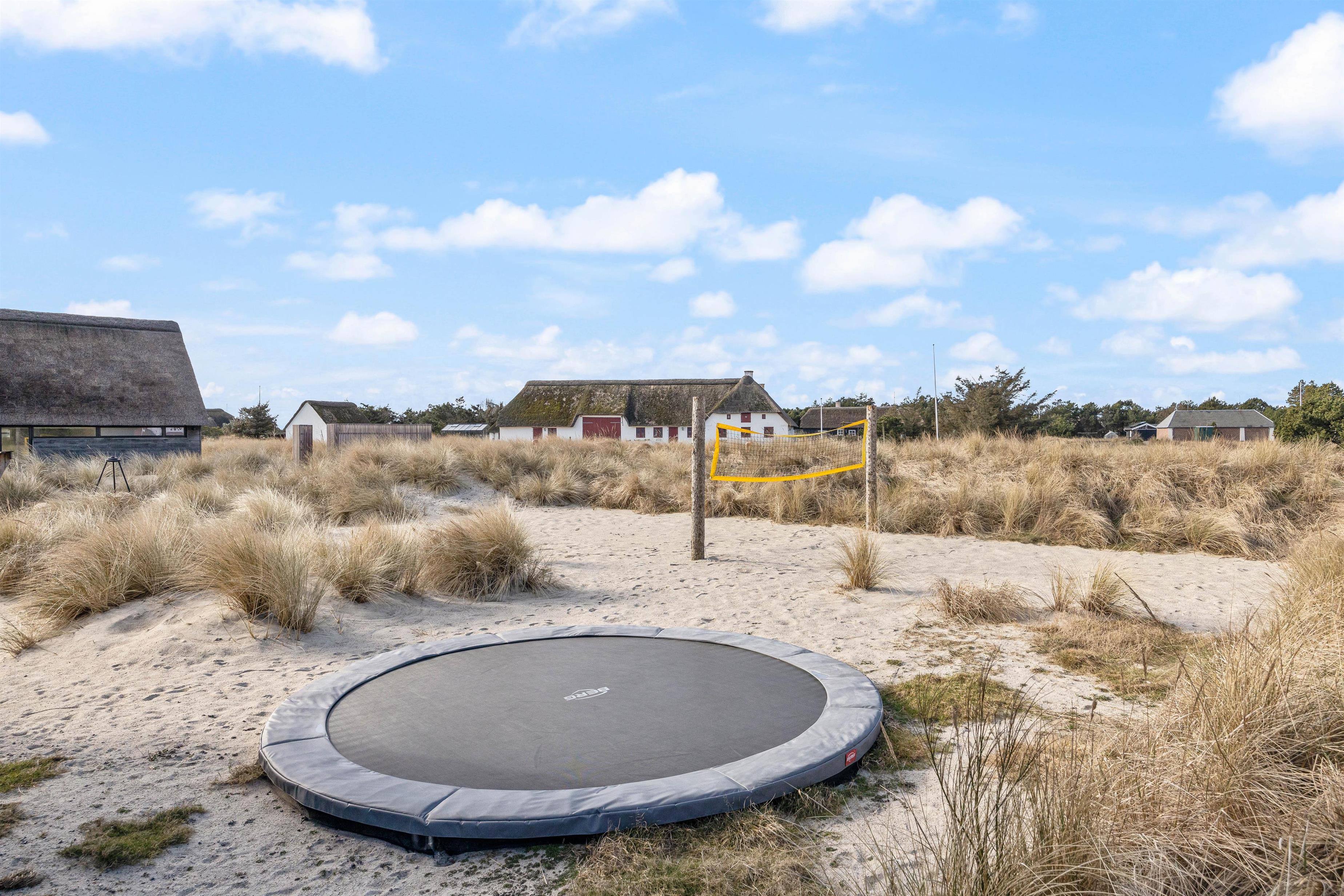 There's also a large outdoor dining table where you can enjoy barbecues prepared on the modern gas grill. You can even bake bread on sticks at the fire pit. For active entertainment, there's a trampoline and volleyball court to show off your skills.