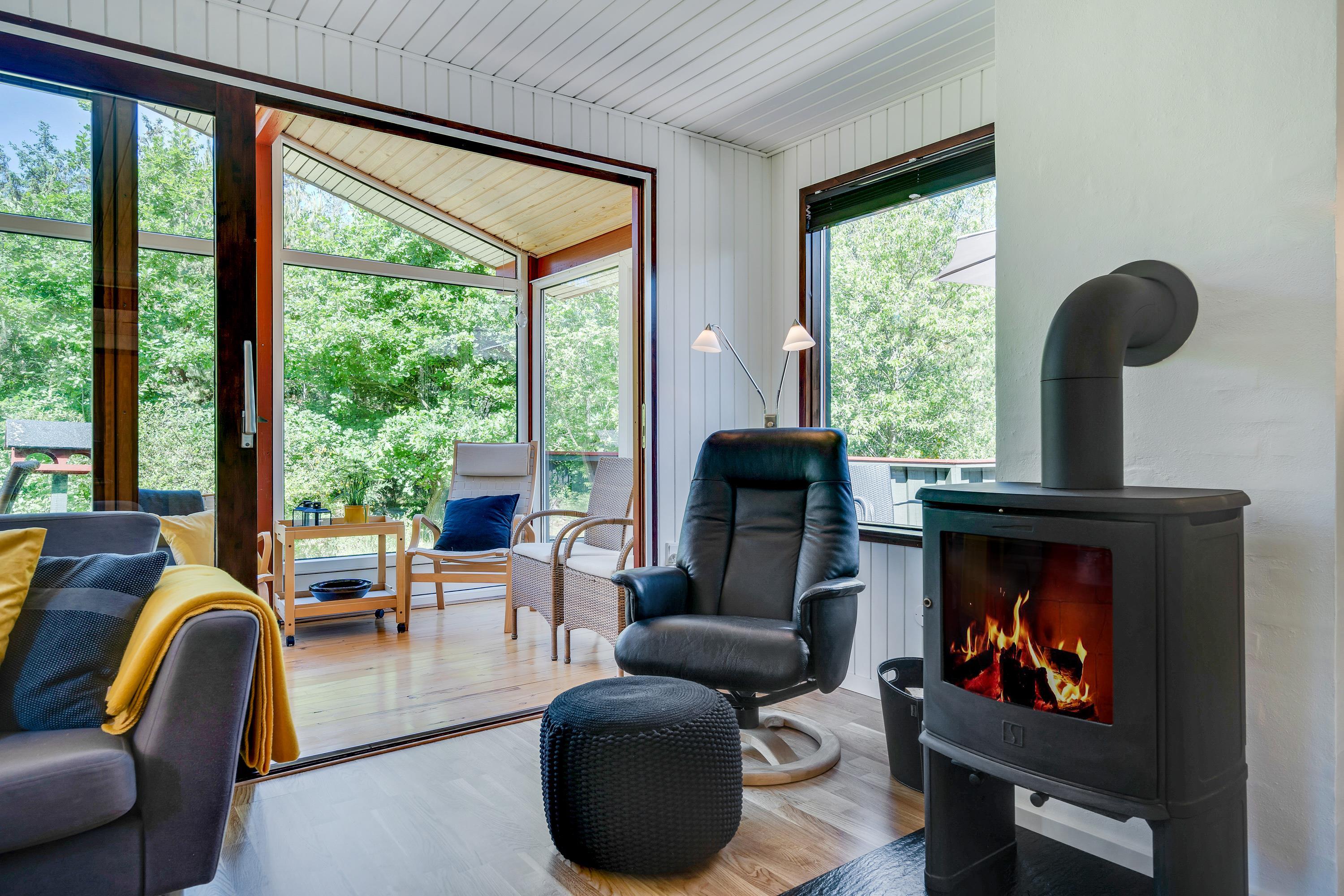 Both a traditional fireplace and an energy-efficient heat pump help maintain pleasant temperatures throughout. You can choose between a crackling fire or simply switching on the heat pump.