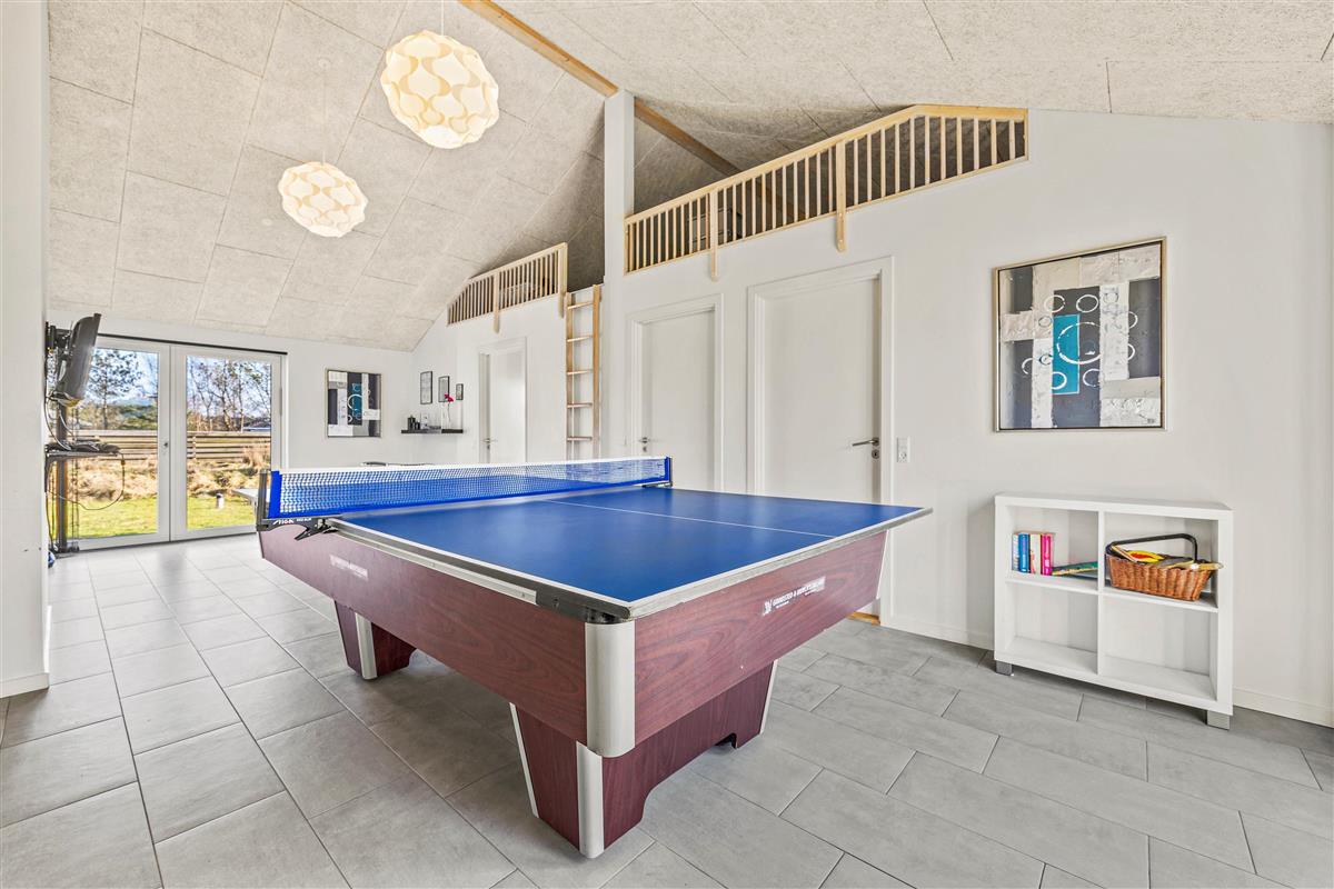 A dedicated room invites everyone to gather for friendly billiards or table tennis tournaments. This space is all about fun and games. A ladder leads to the converted loft level.