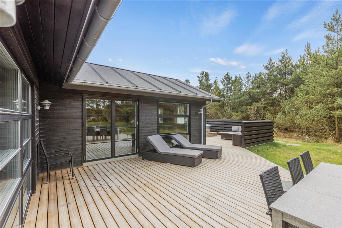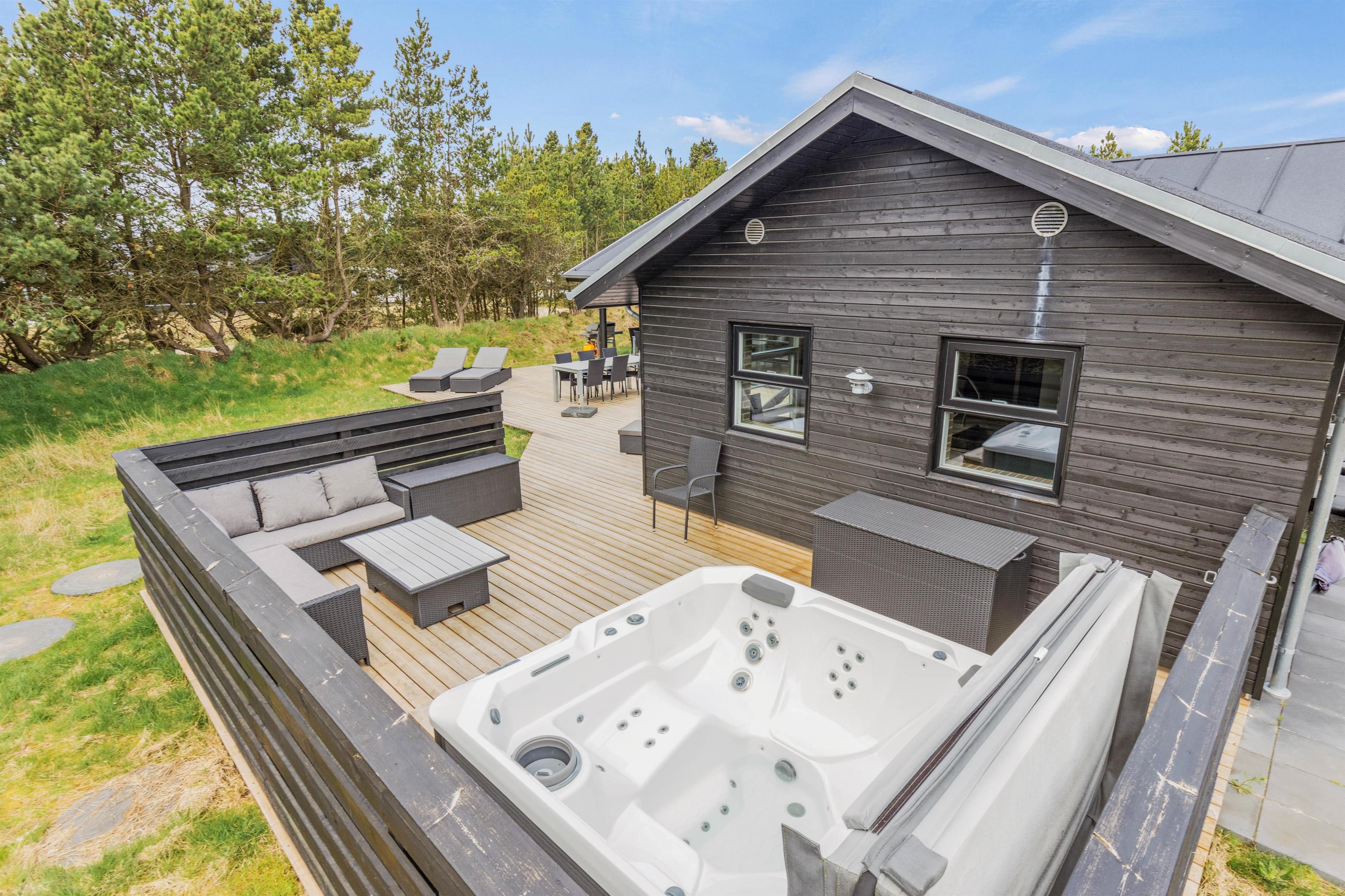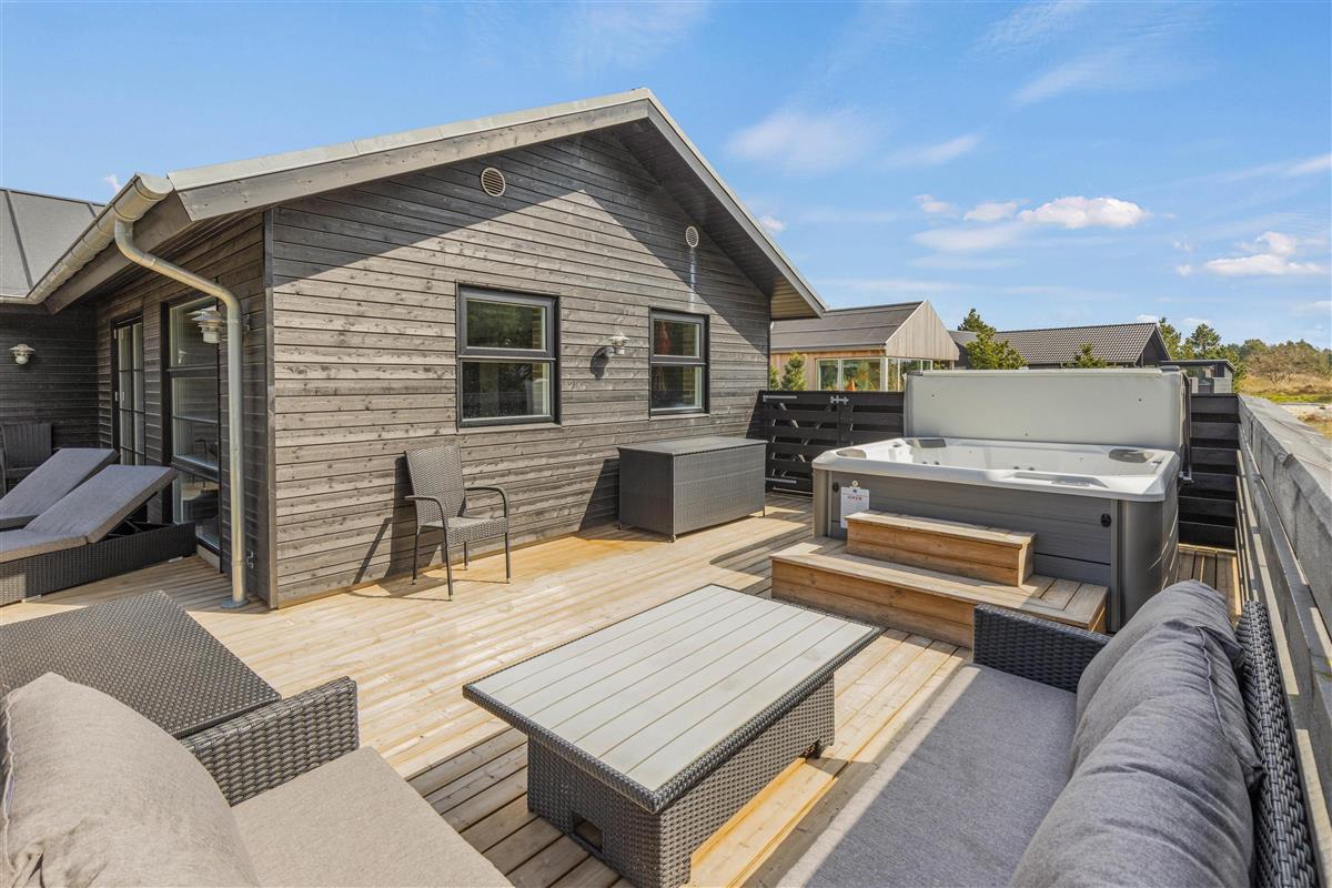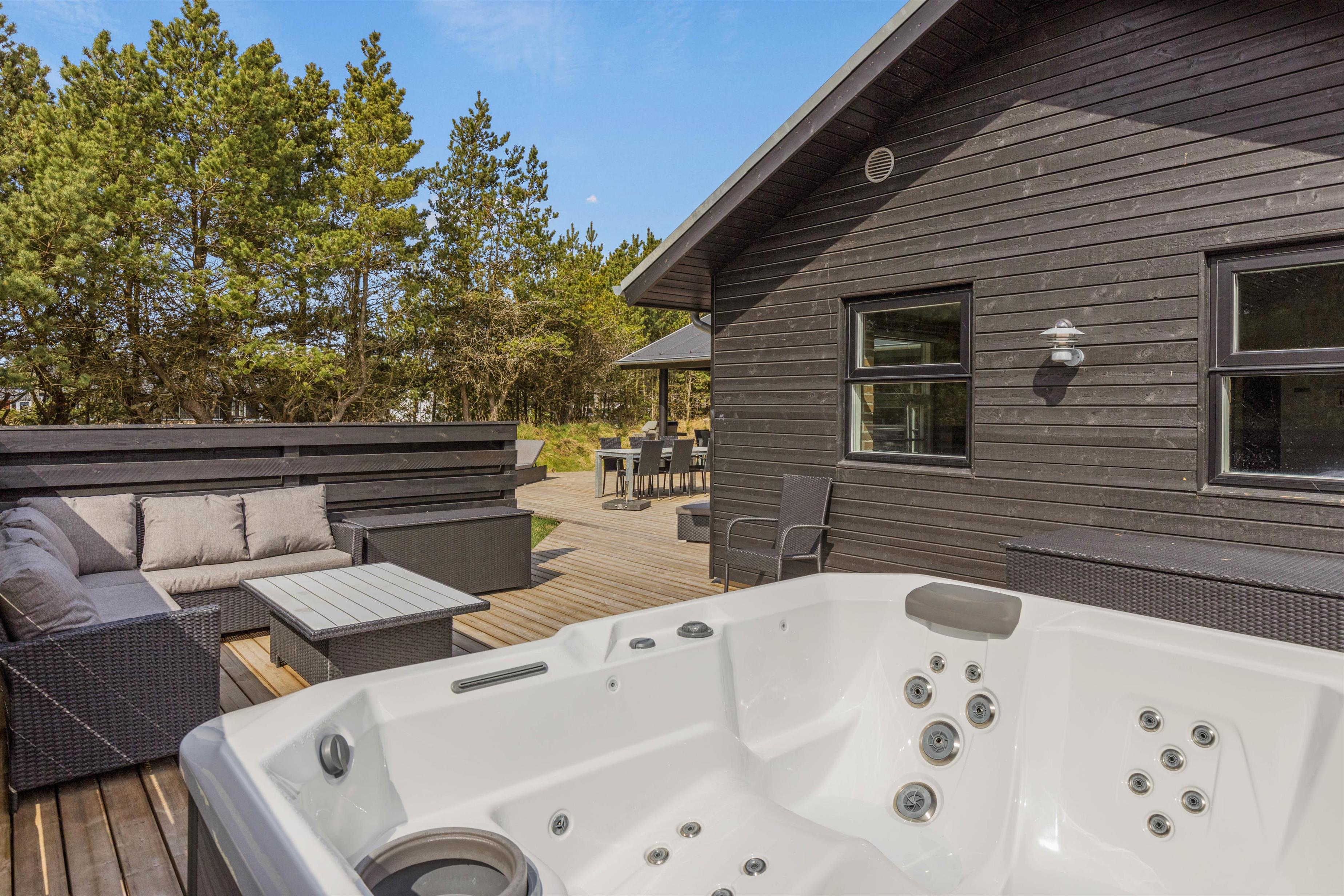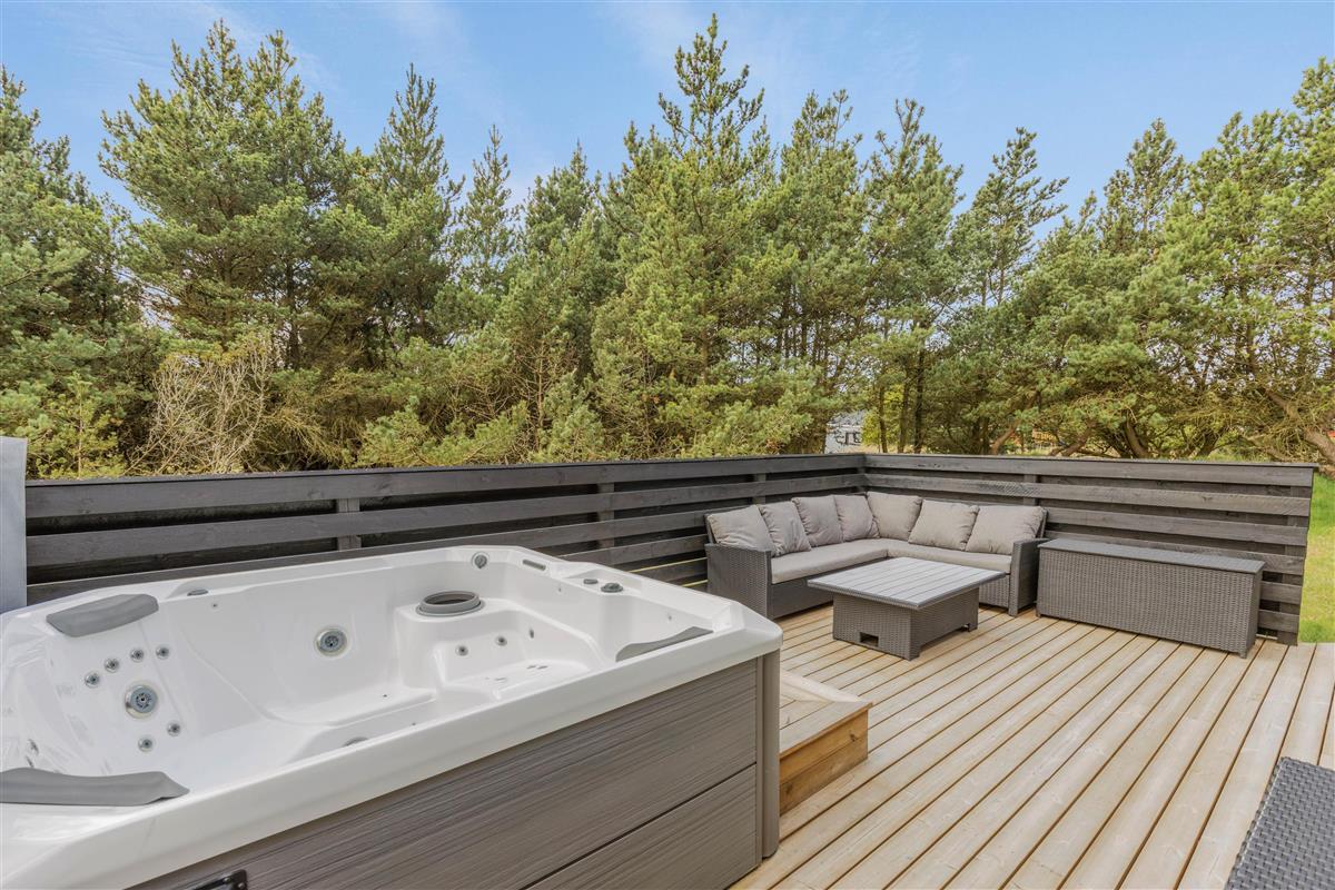 The pool area leads onto the holiday home's beautiful terrace. With its partially covered design, you'll always have shelter while enjoying the fresh air and picturesque surroundings of Blåvand. The terrace features a large outdoor hot tub, perfect for outdoor wellness experiences.