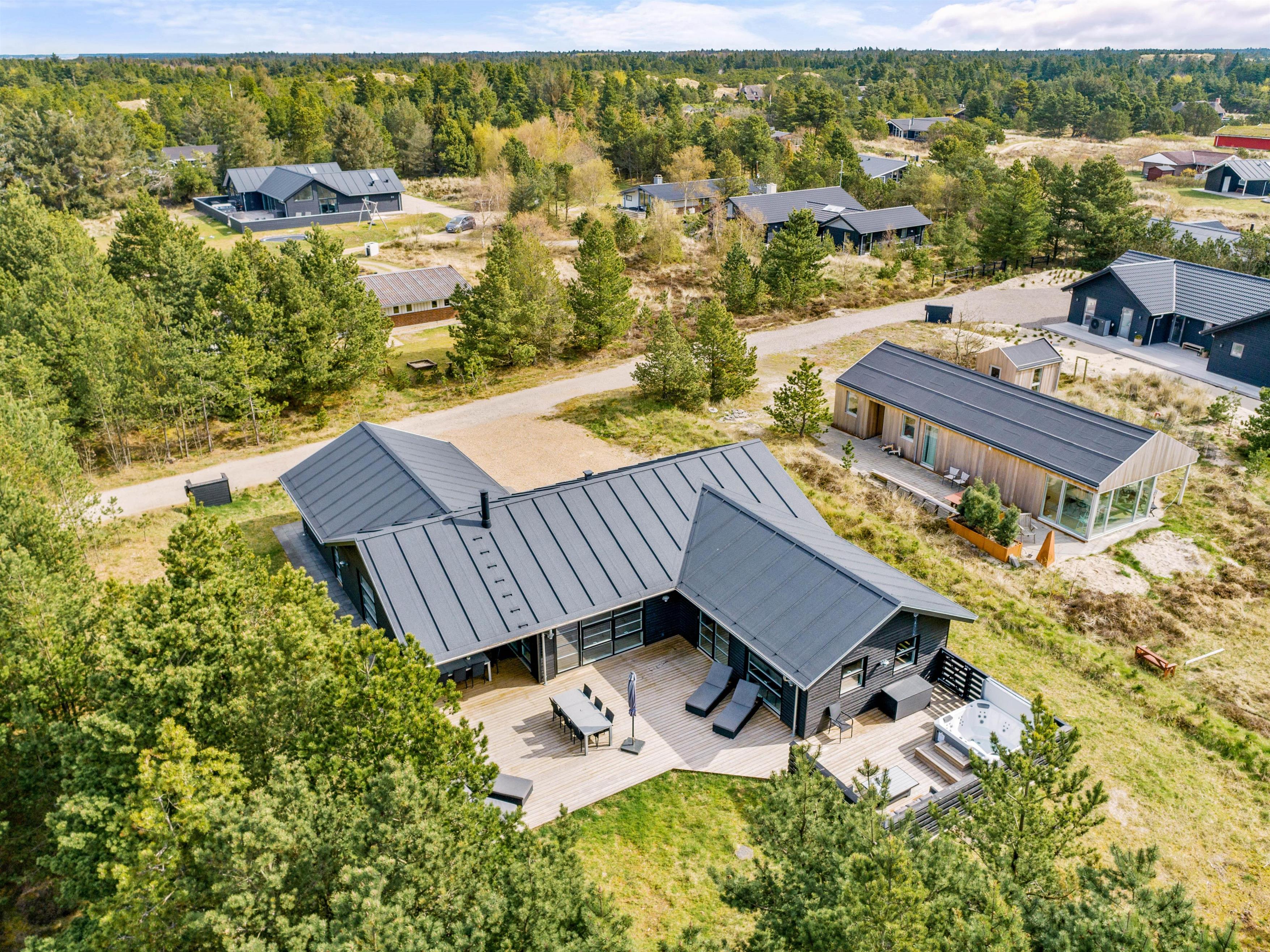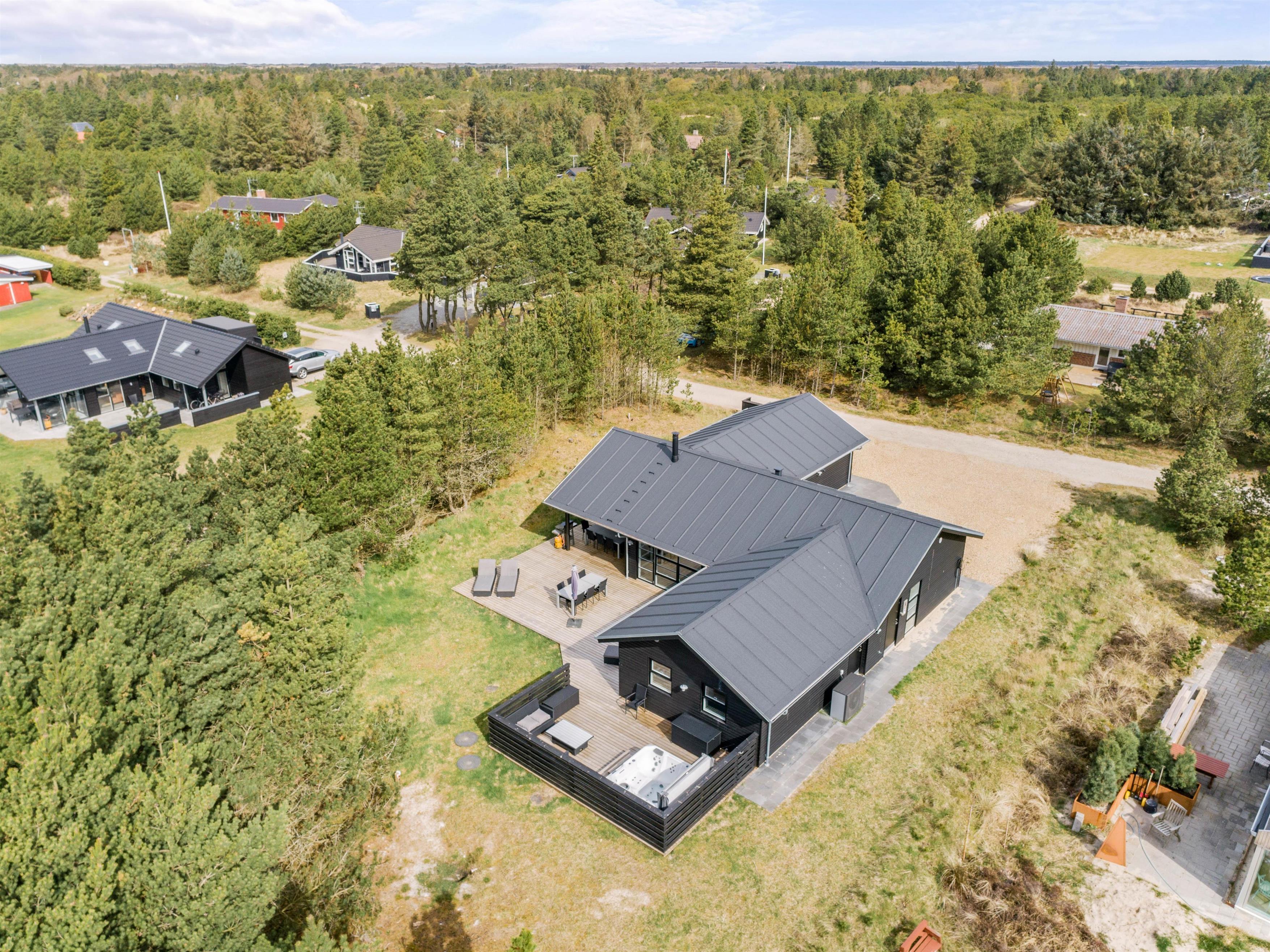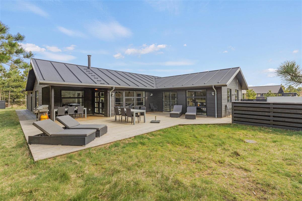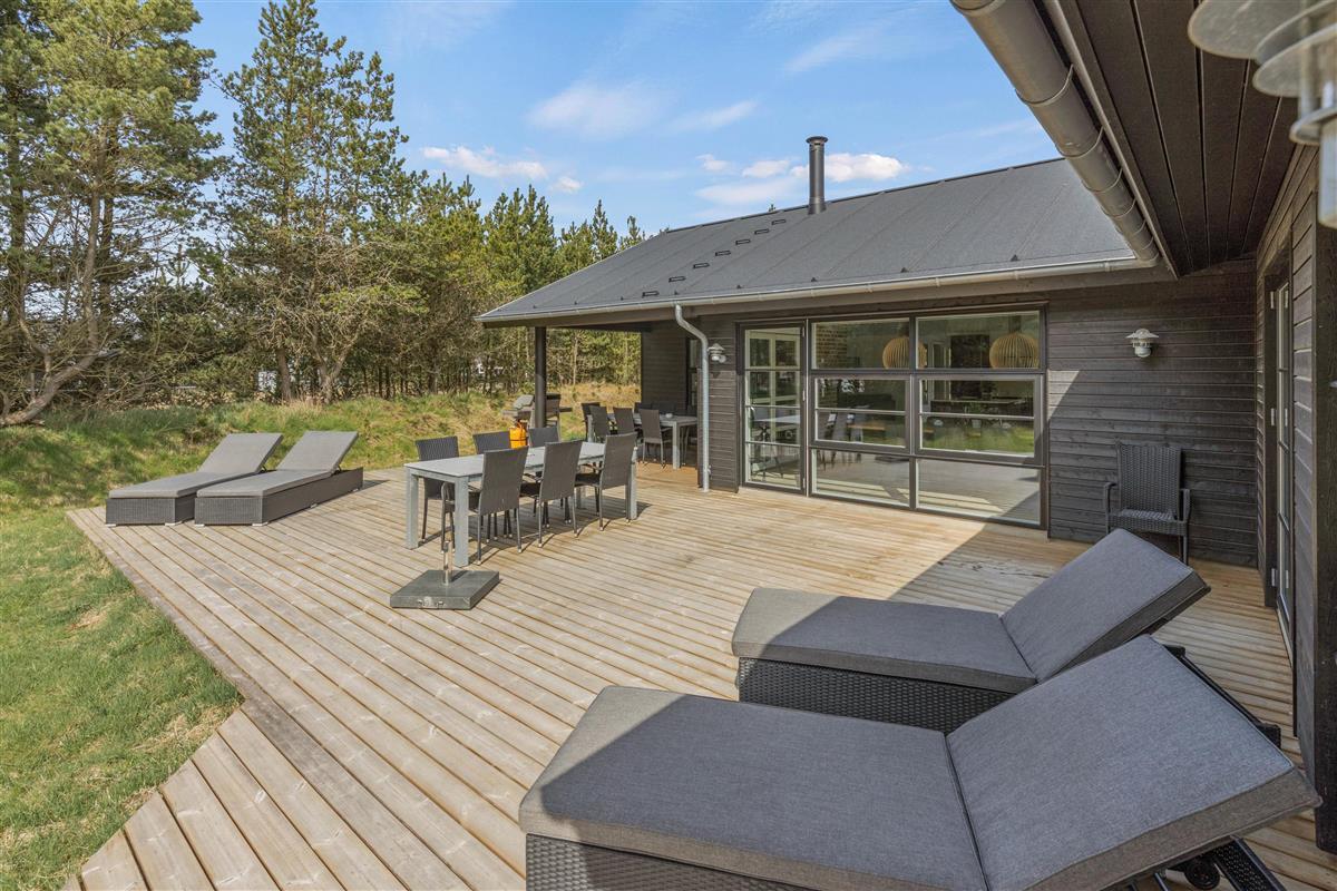 The pool area leads onto the holiday home's beautiful terrace. With its partially covered design, you'll always have shelter while enjoying the fresh air and picturesque surroundings of Blåvand. The terrace features a large outdoor hot tub, perfect for outdoor wellness experiences.