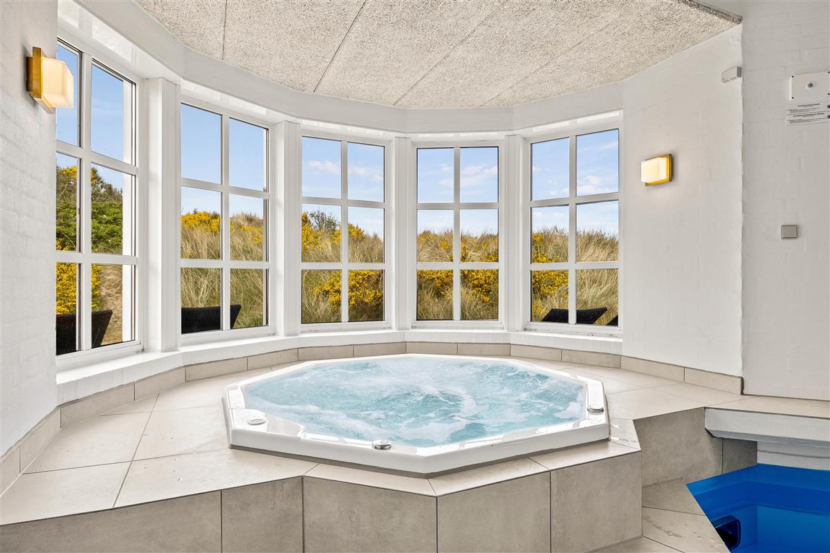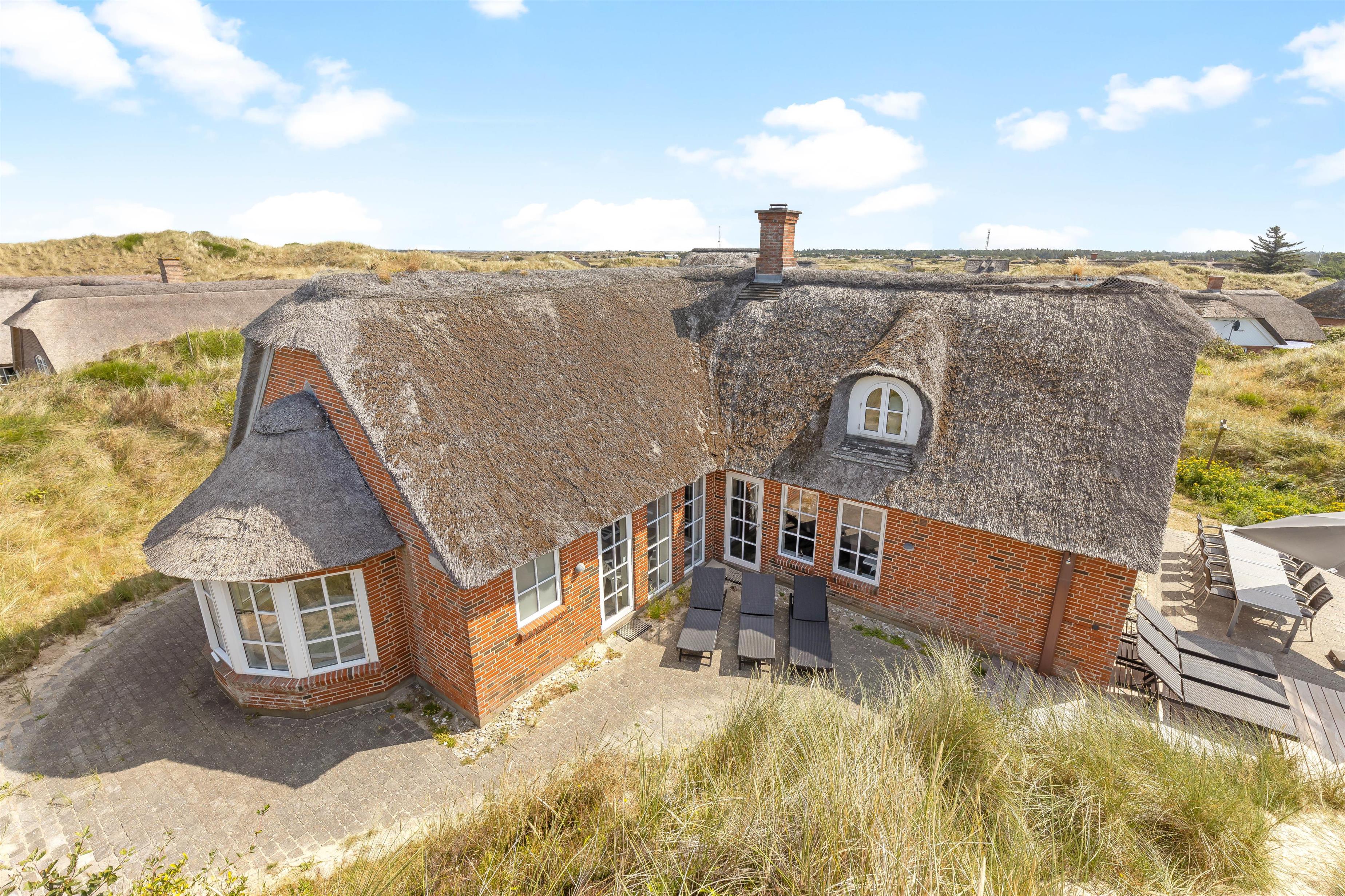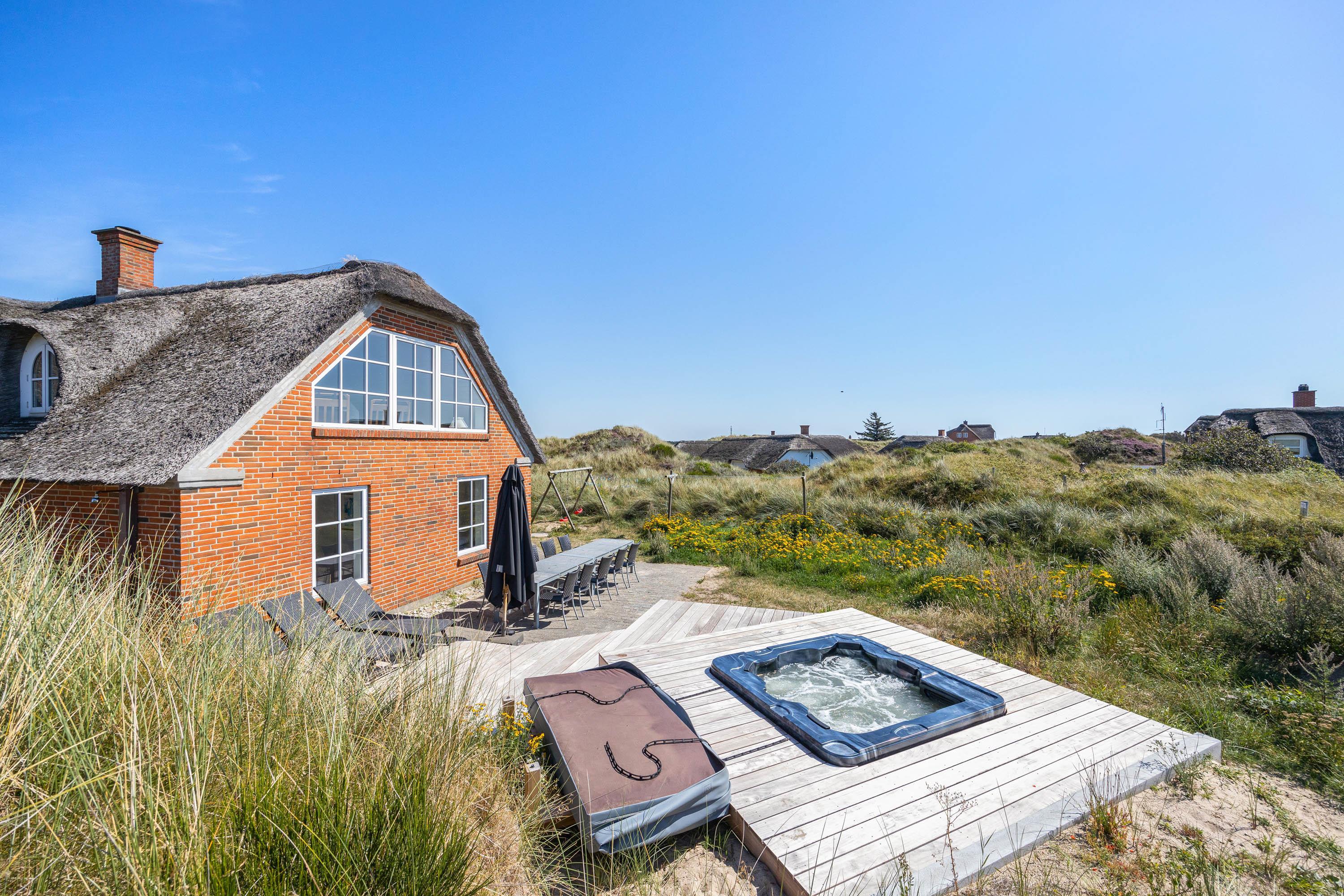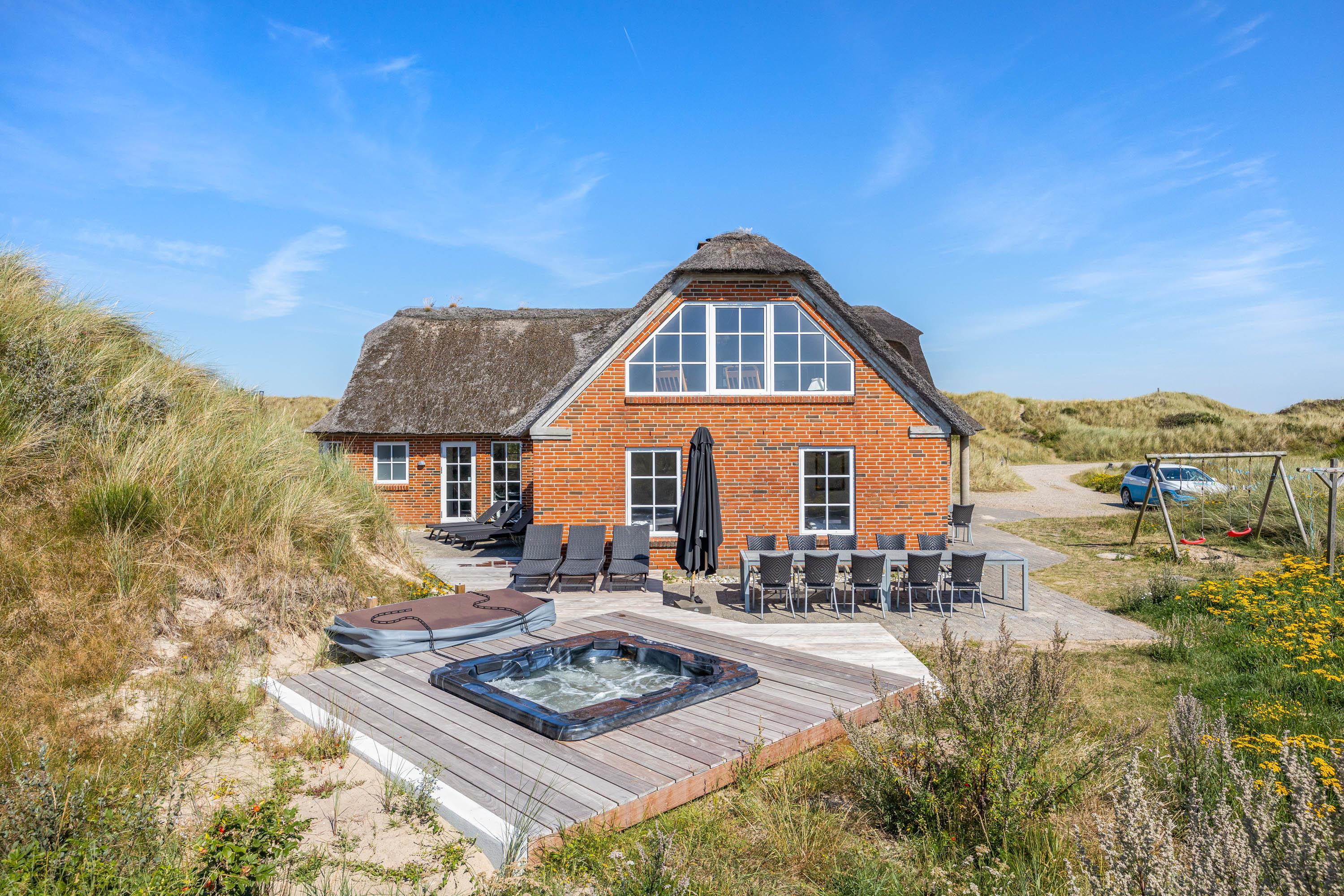 Located at Horns Rev 95 in Blåvand, this thatched-roof pool house sits on beautiful grounds nestled in the dunes. Accommodating up to 12 people, it's perfect for family holidays or groups of couples holidaying together. The 228-square-metre living space offers plenty of room for socialising and entertainment. A swimming pool with counter-current system, large hot tub and sauna provide a luxury wellness experience. The beach is just 200 metres away through the beautiful dune landscape.