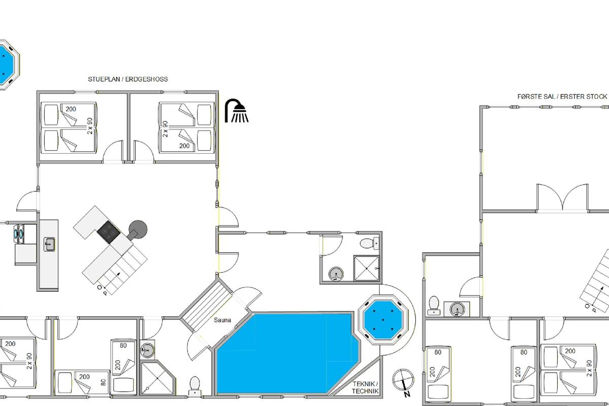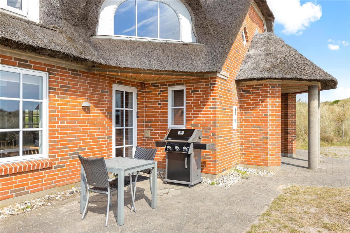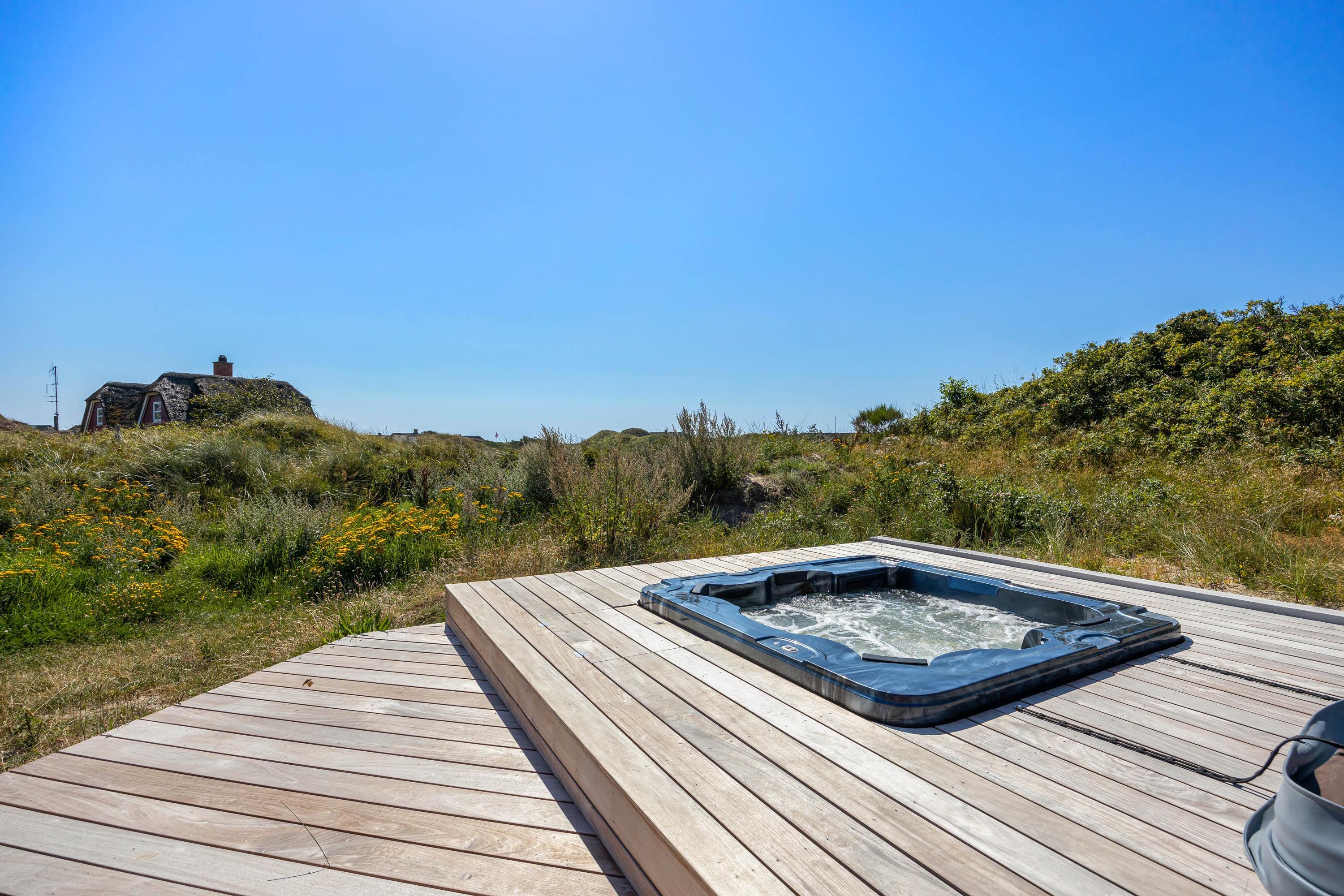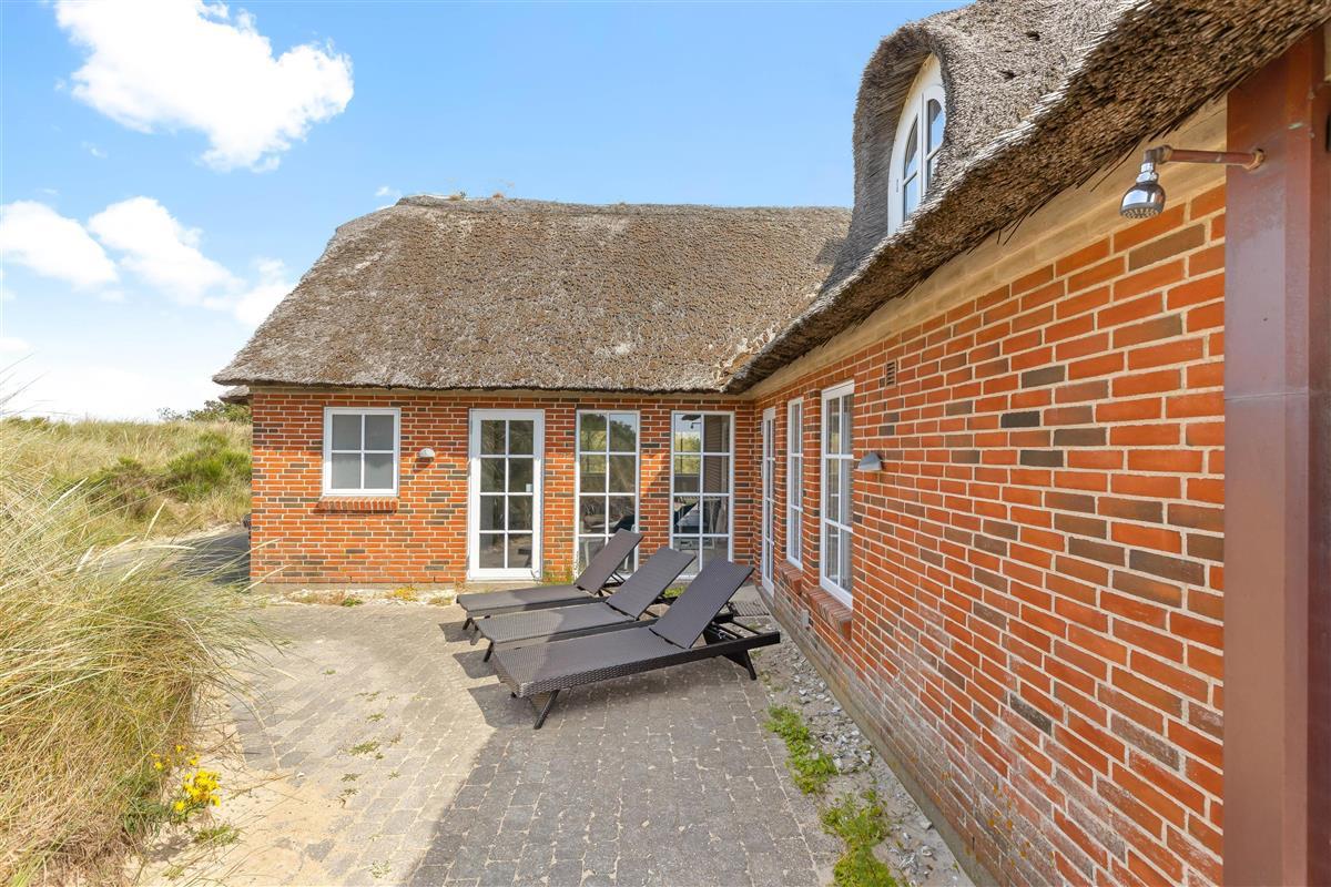 Located at Horns Rev 95 in Blåvand, this thatched-roof pool house sits on beautiful grounds nestled in the dunes. Accommodating up to 12 people, it's perfect for family holidays or groups of couples holidaying together. The 228-square-metre living space offers plenty of room for socialising and entertainment. A swimming pool with counter-current system, large hot tub and sauna provide a luxury wellness experience. The beach is just 200 metres away through the beautiful dune landscape.