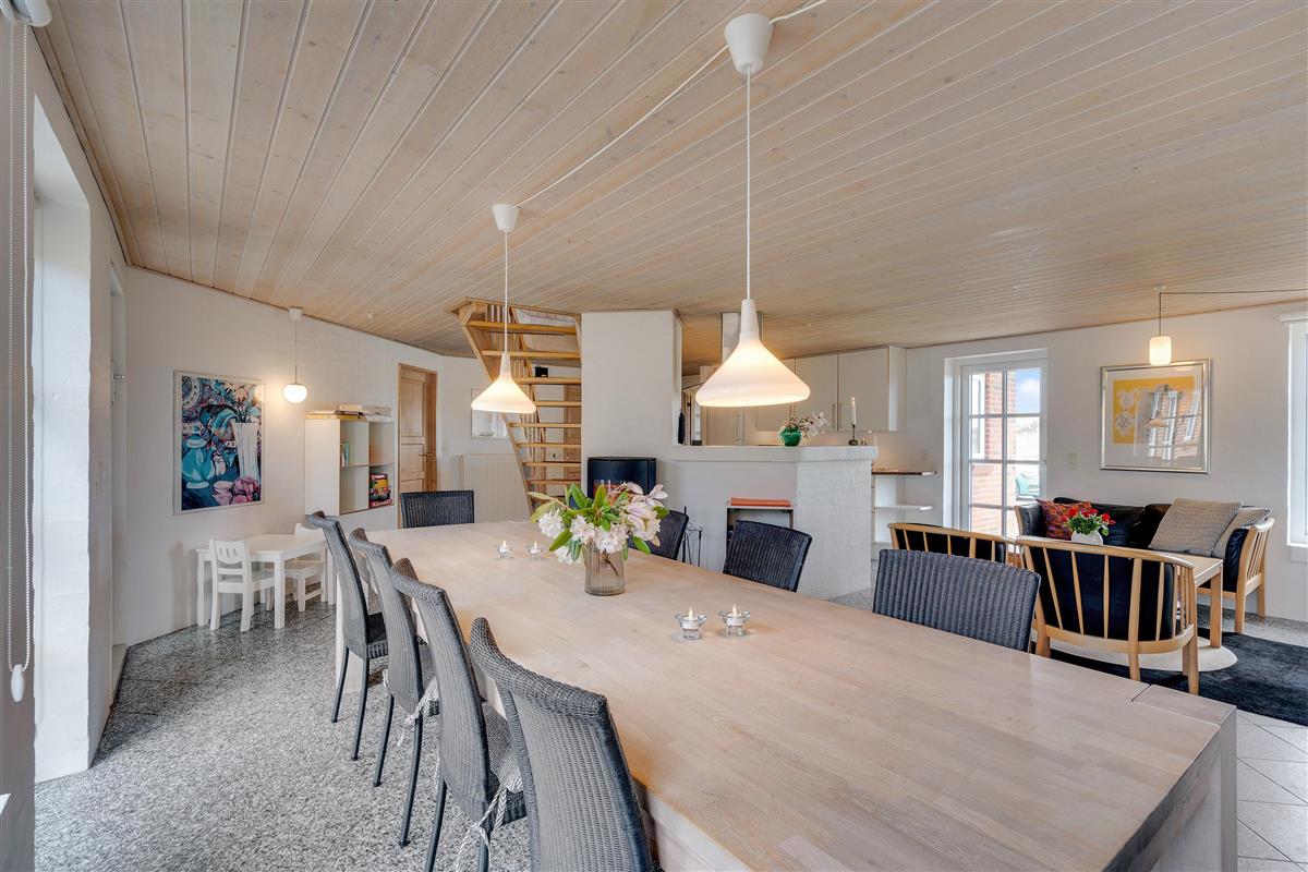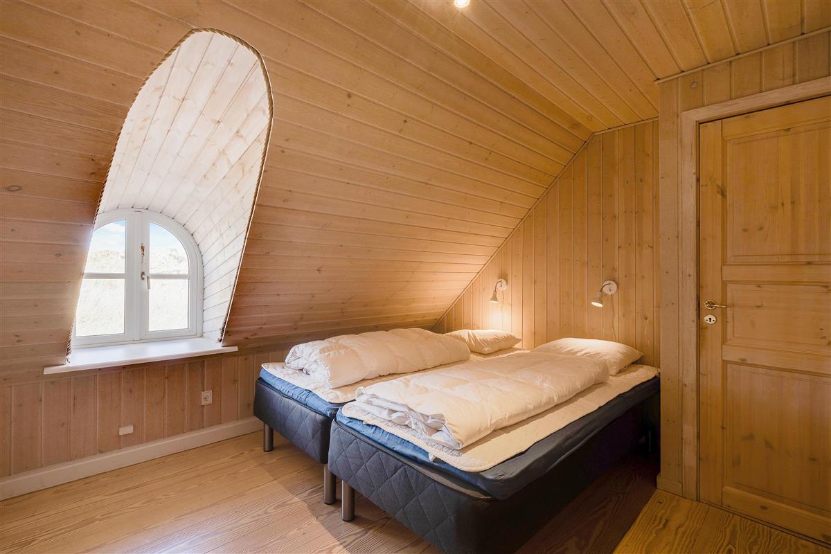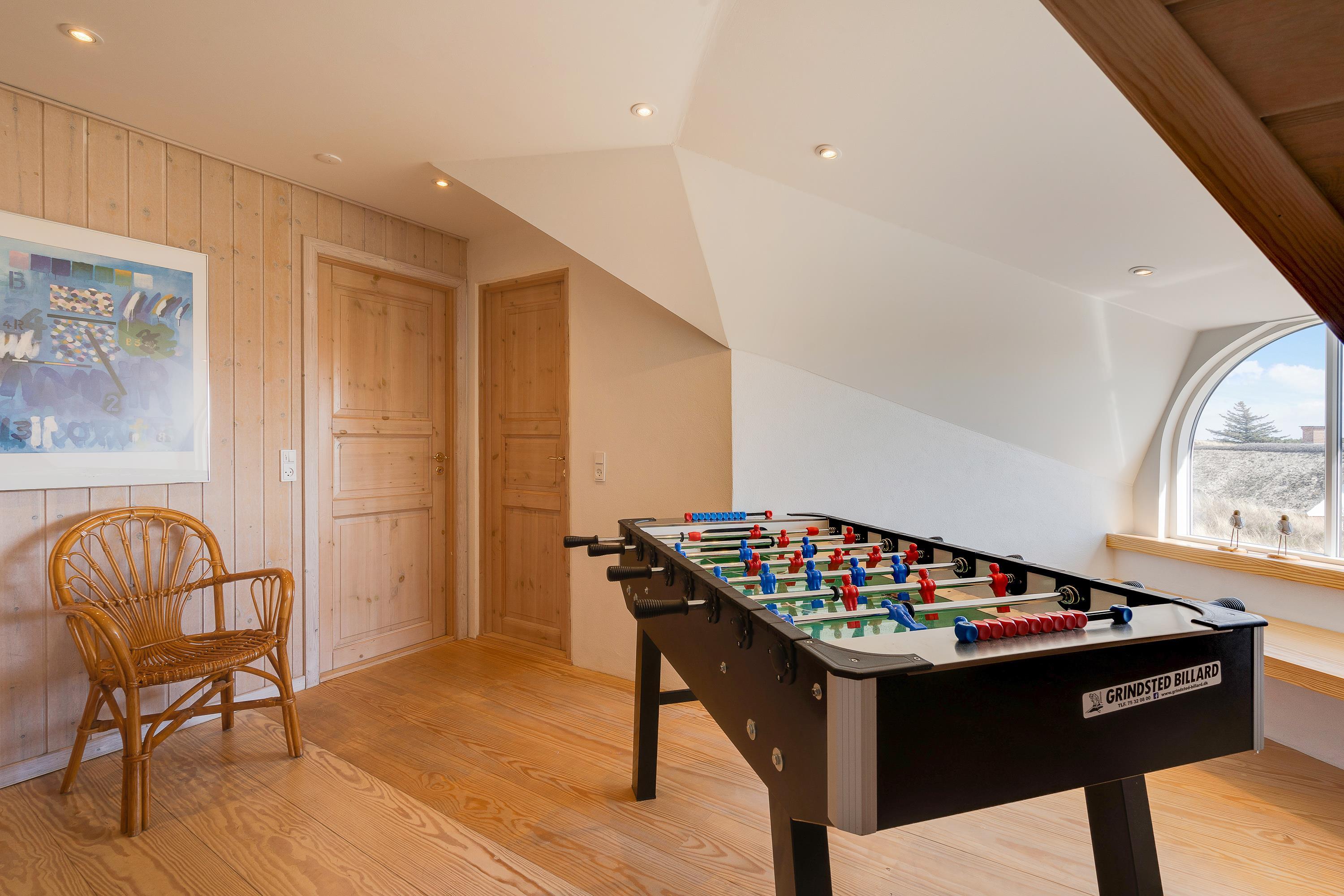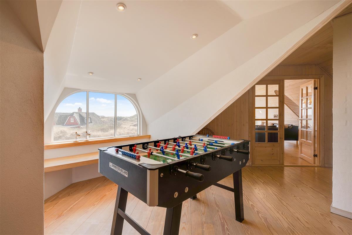 The upper floor features a small sitting area with large windows offering magnificent panoramic views over the beautiful dune landscape and lighthouse. Here you'll also find 2 of the 6 bedrooms. For those seeking entertainment, there's a table football in the stairway area.