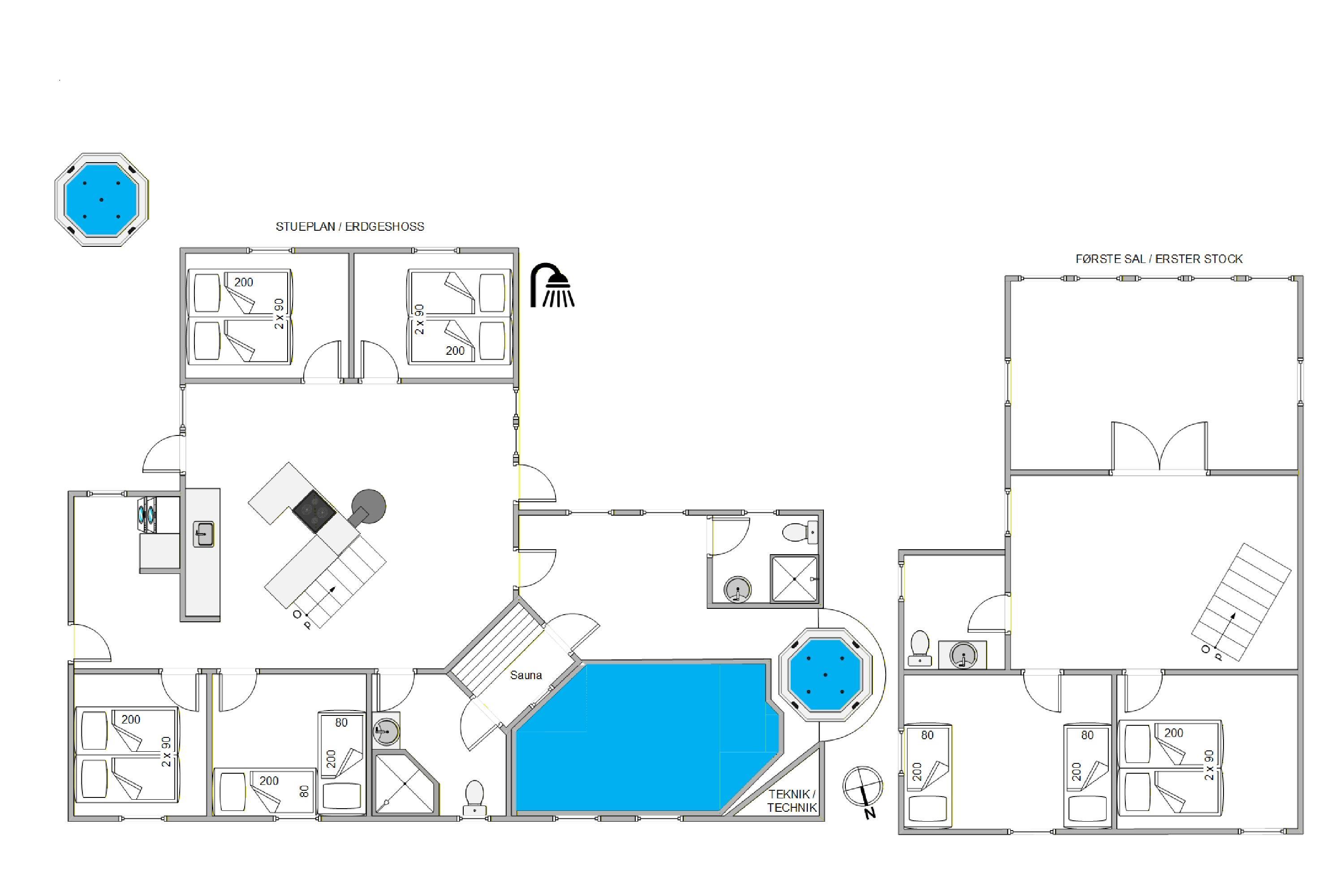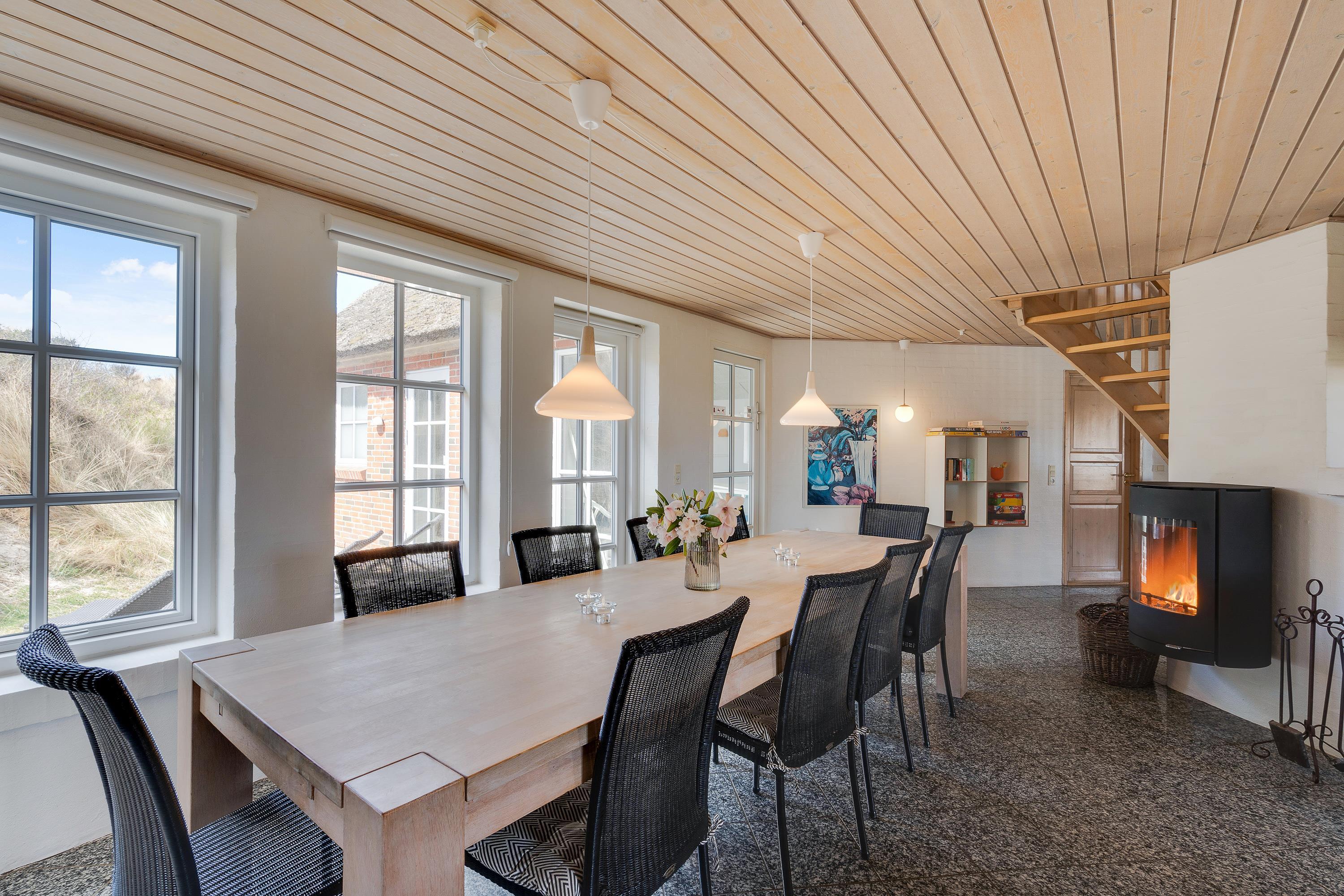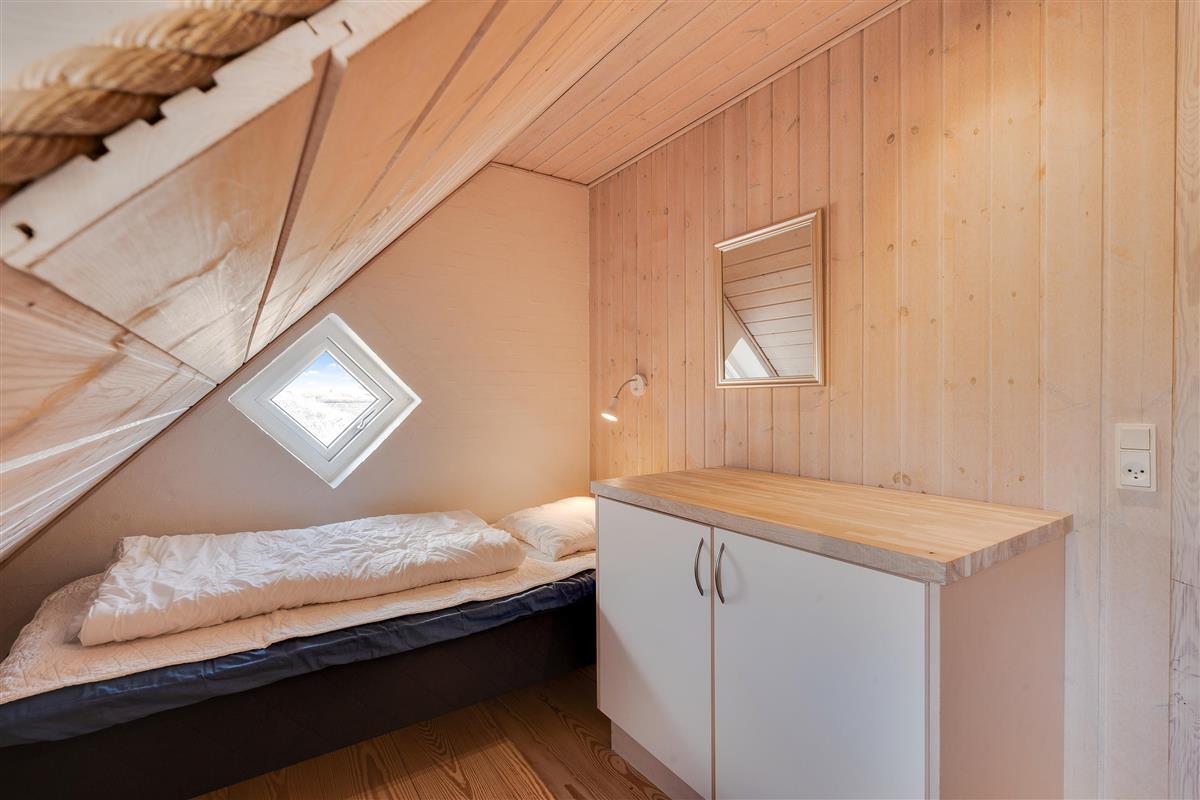 The upper floor features a small sitting area with large windows offering magnificent panoramic views over the beautiful dune landscape and lighthouse. Here you'll also find 2 of the 6 bedrooms. For those seeking entertainment, there's a table football in the stairway area.