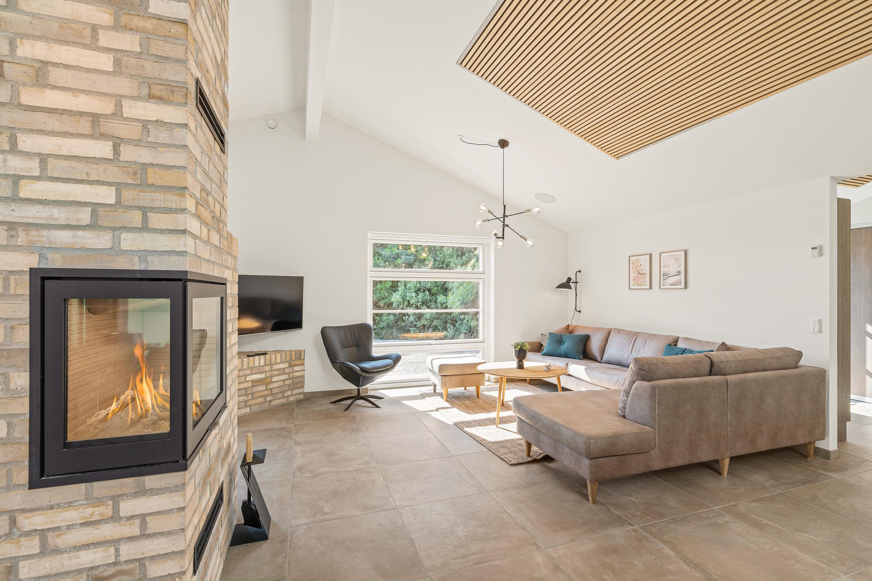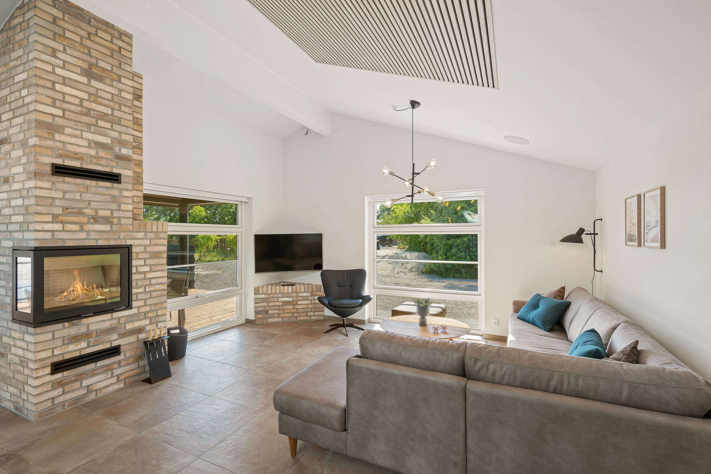 The built-in fireplace with its brick chimney serves as a striking focal point, providing not only warmth but authentic Nordic 'hygge' with its dancing flames. It's positioned in the living area to be visible from all angles.