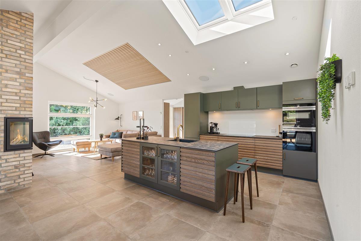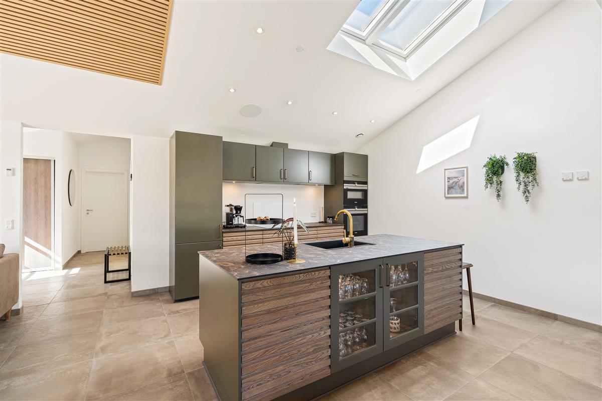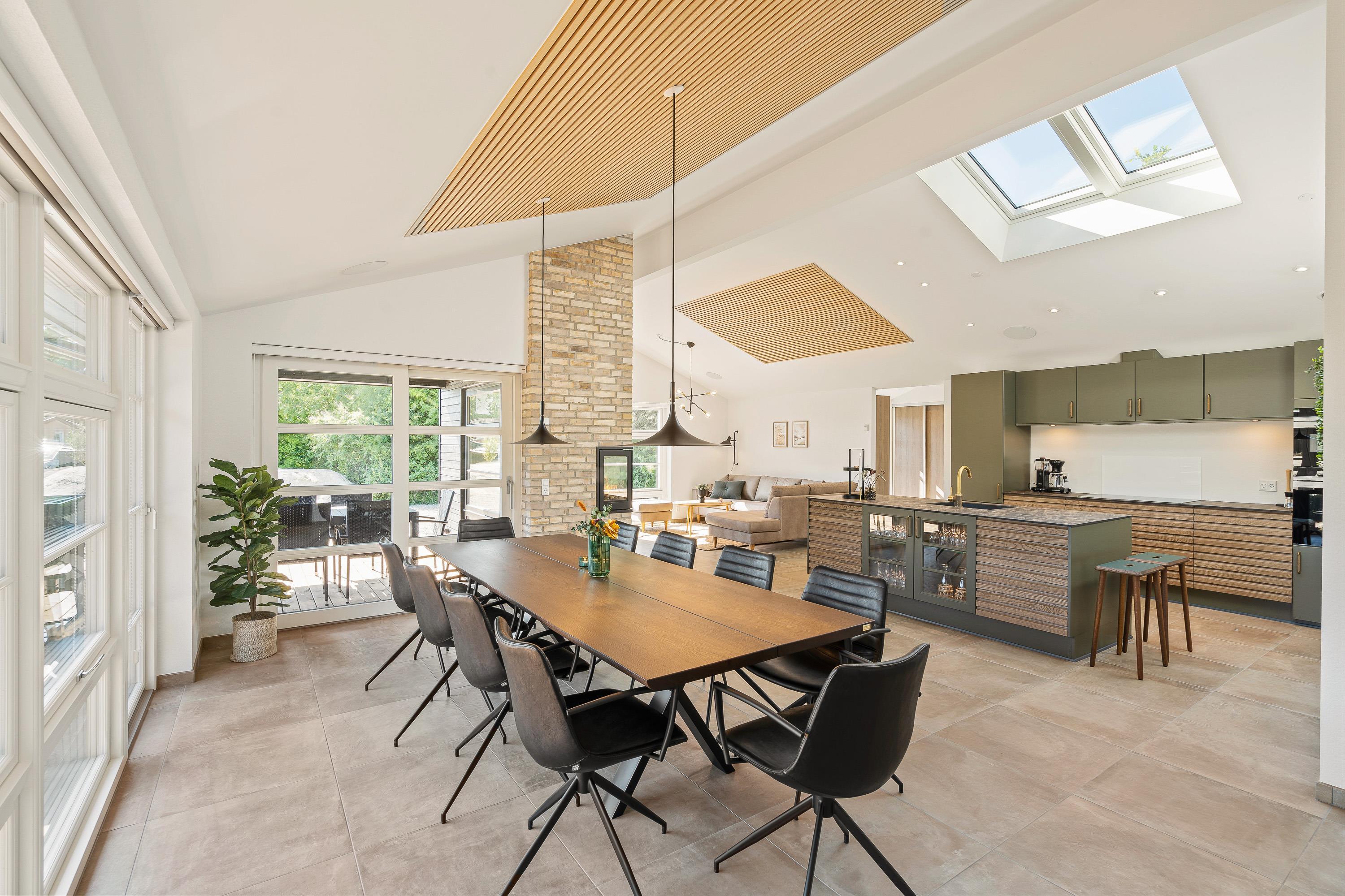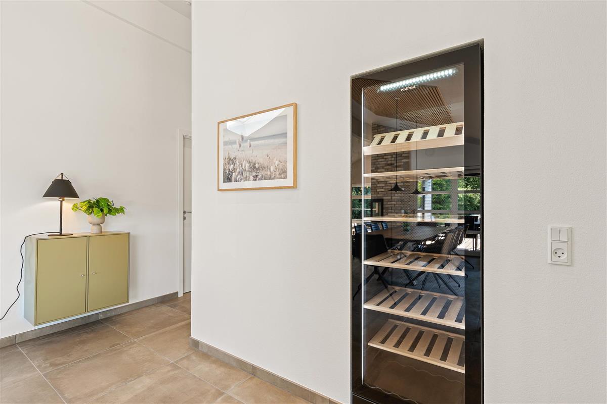 The modern kitchen showcases exceptional design and comes with everything you could need. Cooking becomes a pleasure here. The long dining table offers beautiful views of nature while you dine together. Enjoy a perfectly chilled glass of your favourite wine from the dedicated wine fridge.