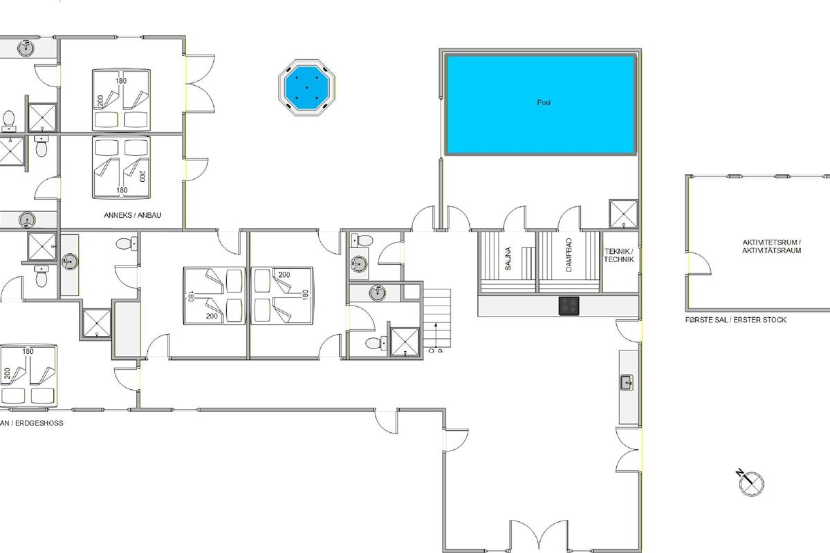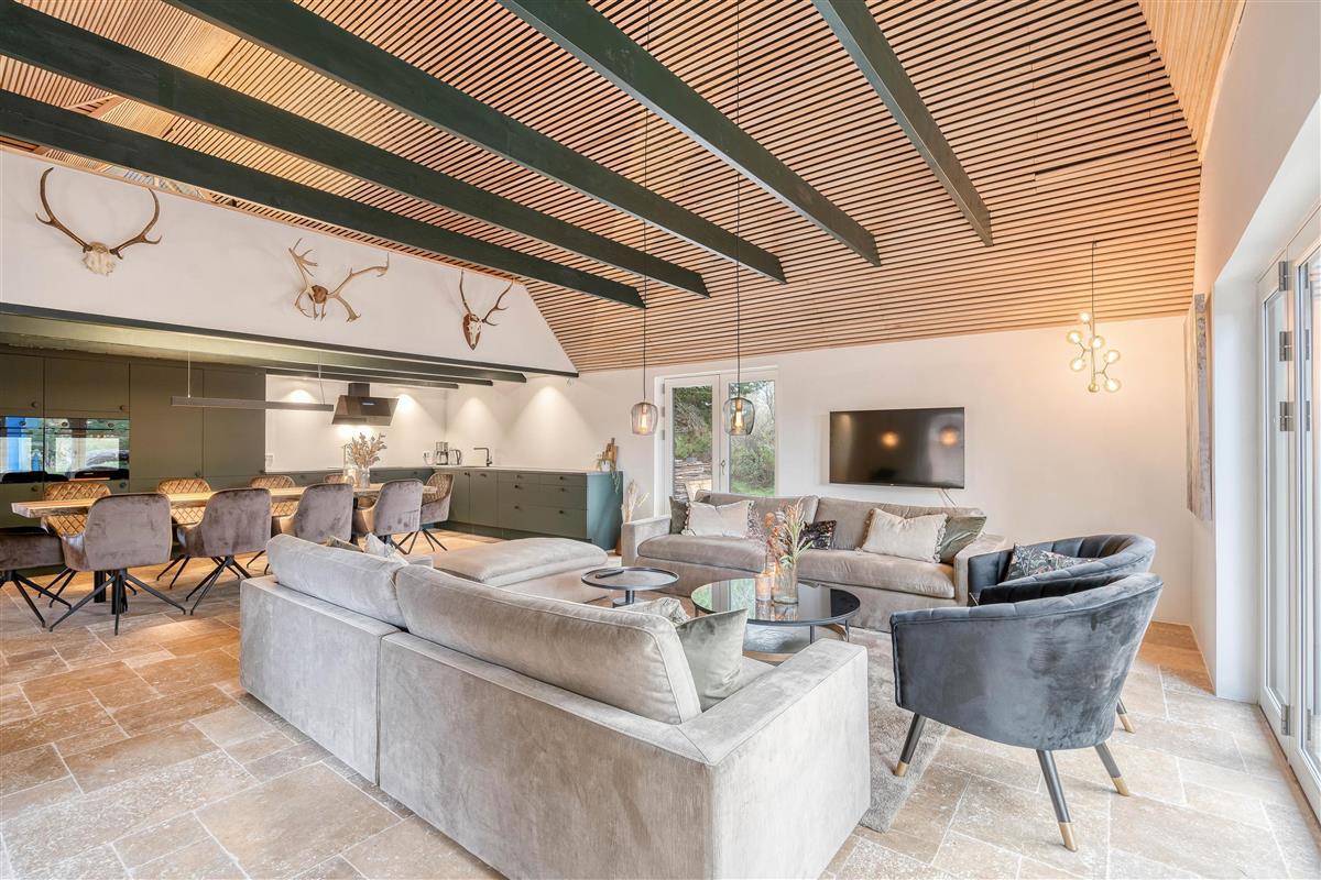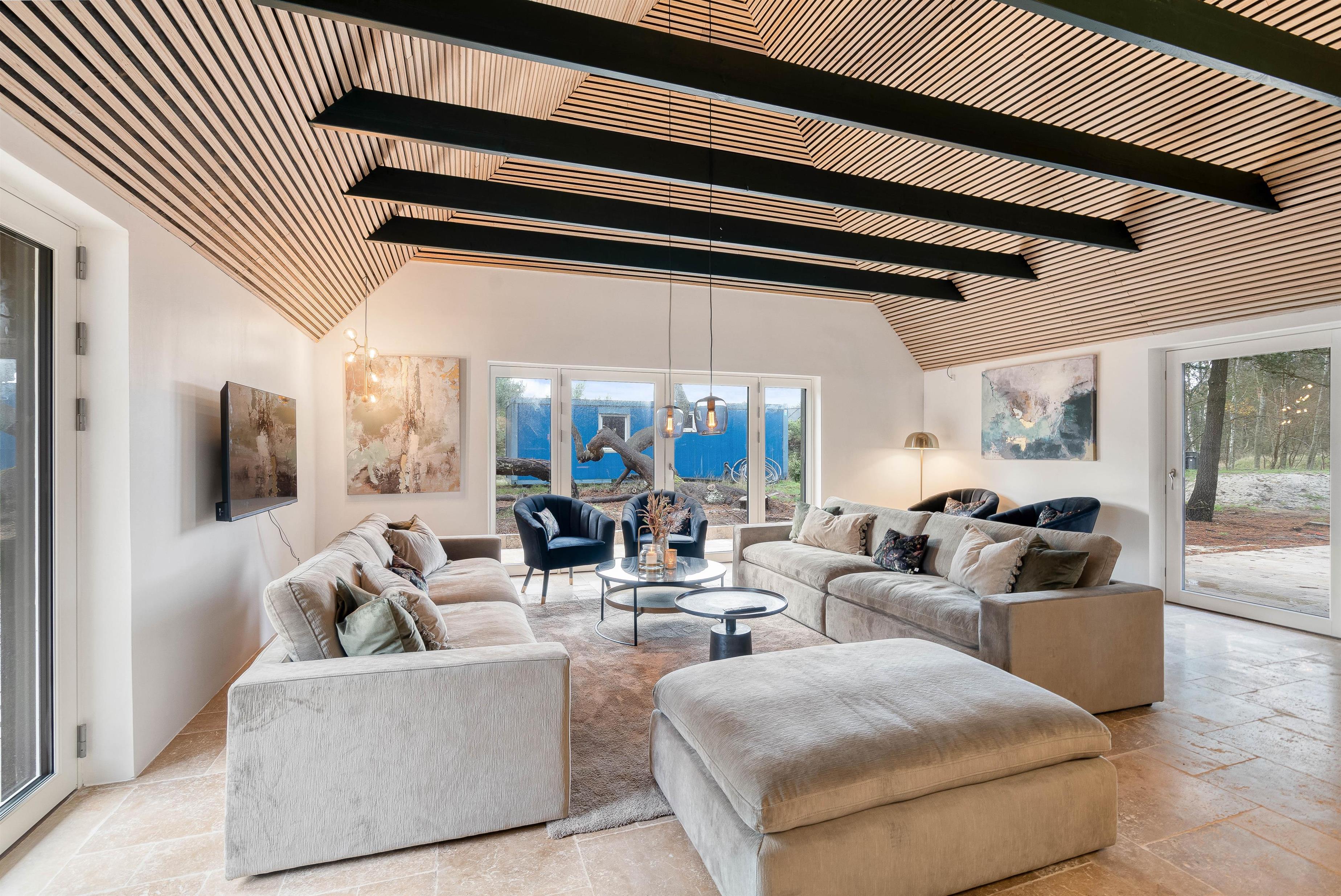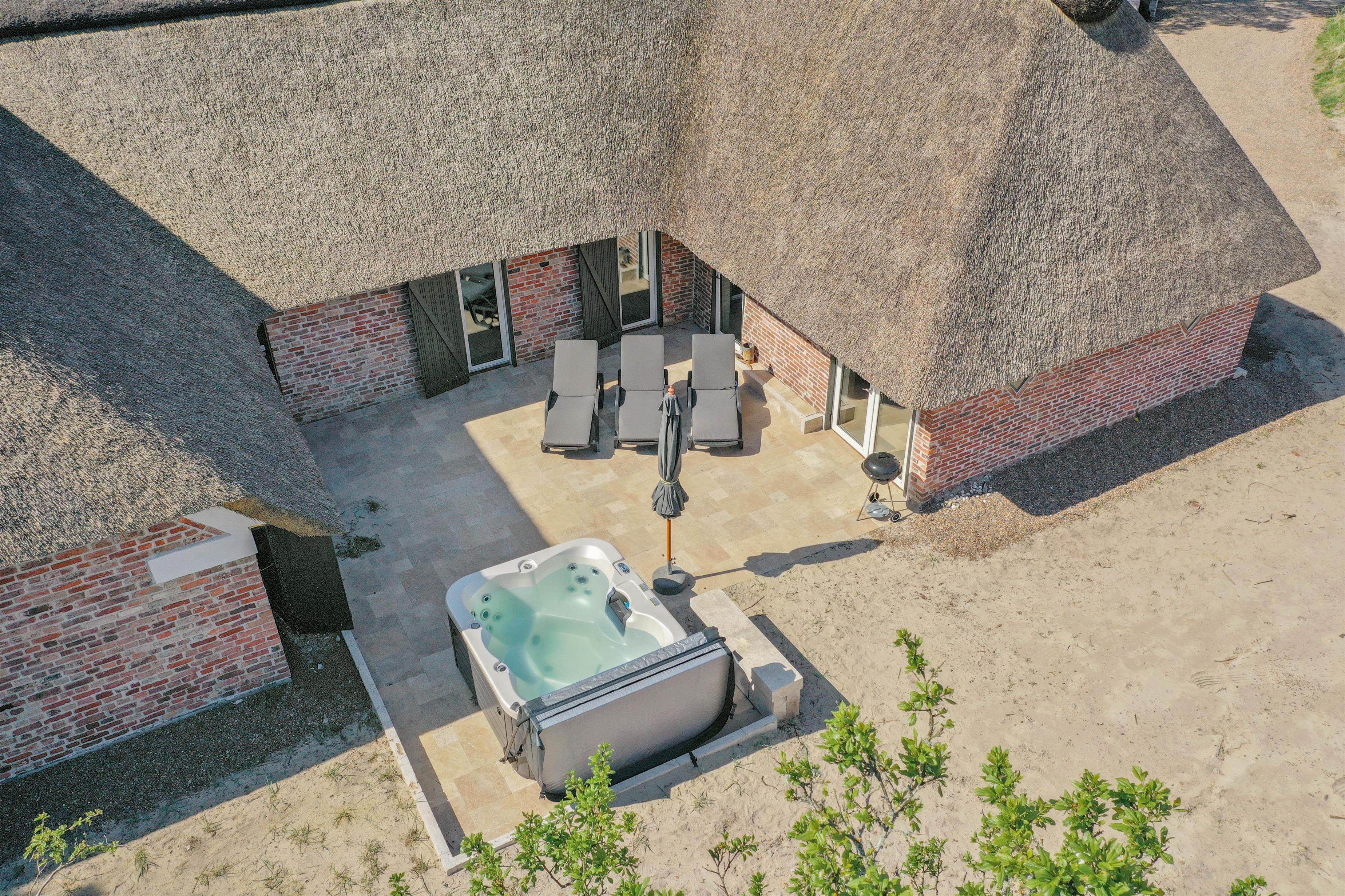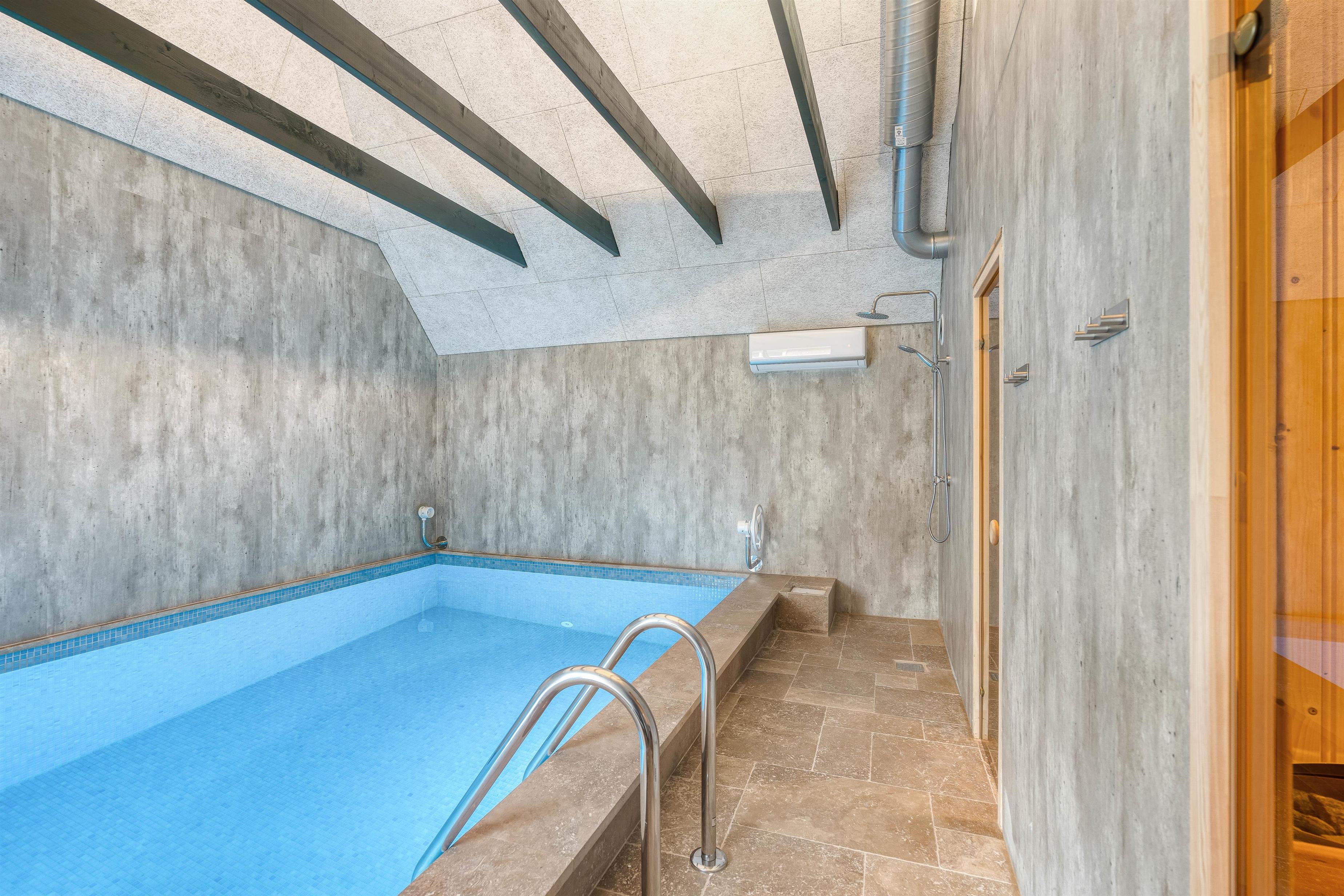 One of the highlights of this newly built holiday home is its beautiful wellness area. The 22-square-metre pool, with a depth of 1.55 metres, allows for a morning swim before starting your day. The pool room leads directly to the sauna and steam room, offering something for everyone. For the perfect spa day, spend your evening in the outdoor hot tub. What could be better than relaxing in warm, bubbling water under a starlit sky?
