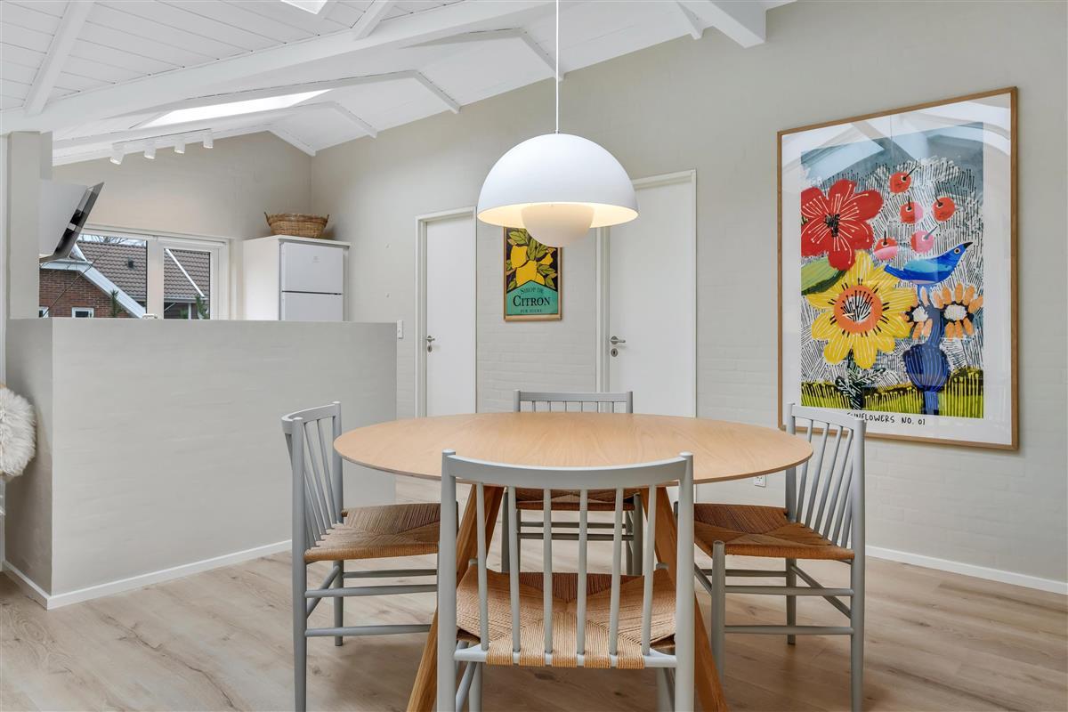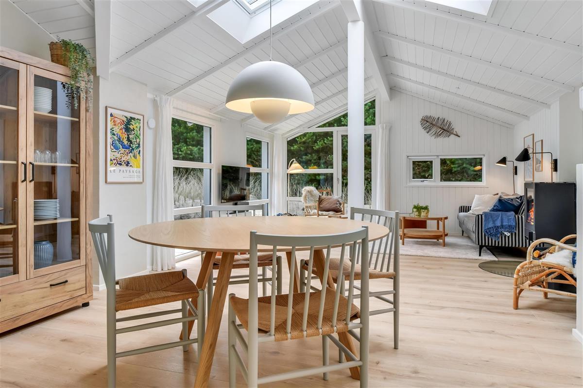 The heart of this 98-square-metre West Jutland gem is the open-plan living area with kitchen and dining space. Here you're invited to relax with your loved ones, play games, enjoy meals together, or simply read an engaging book with the wood-burning stove crackling in the background.