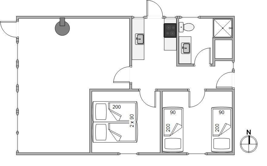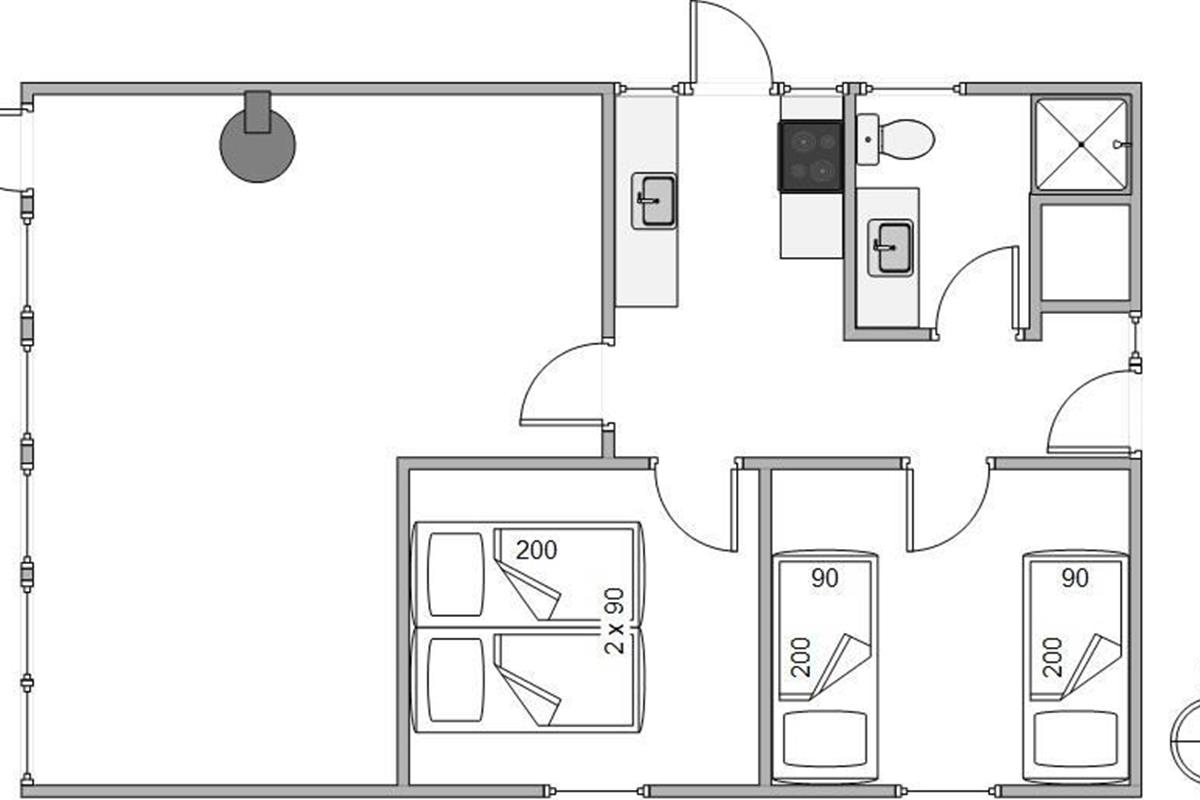 In addition, the holiday home has 1 bathroom with shower and 2 large bedrooms with closet space – one bedroom has 1 double bed, the other 2 single beds.