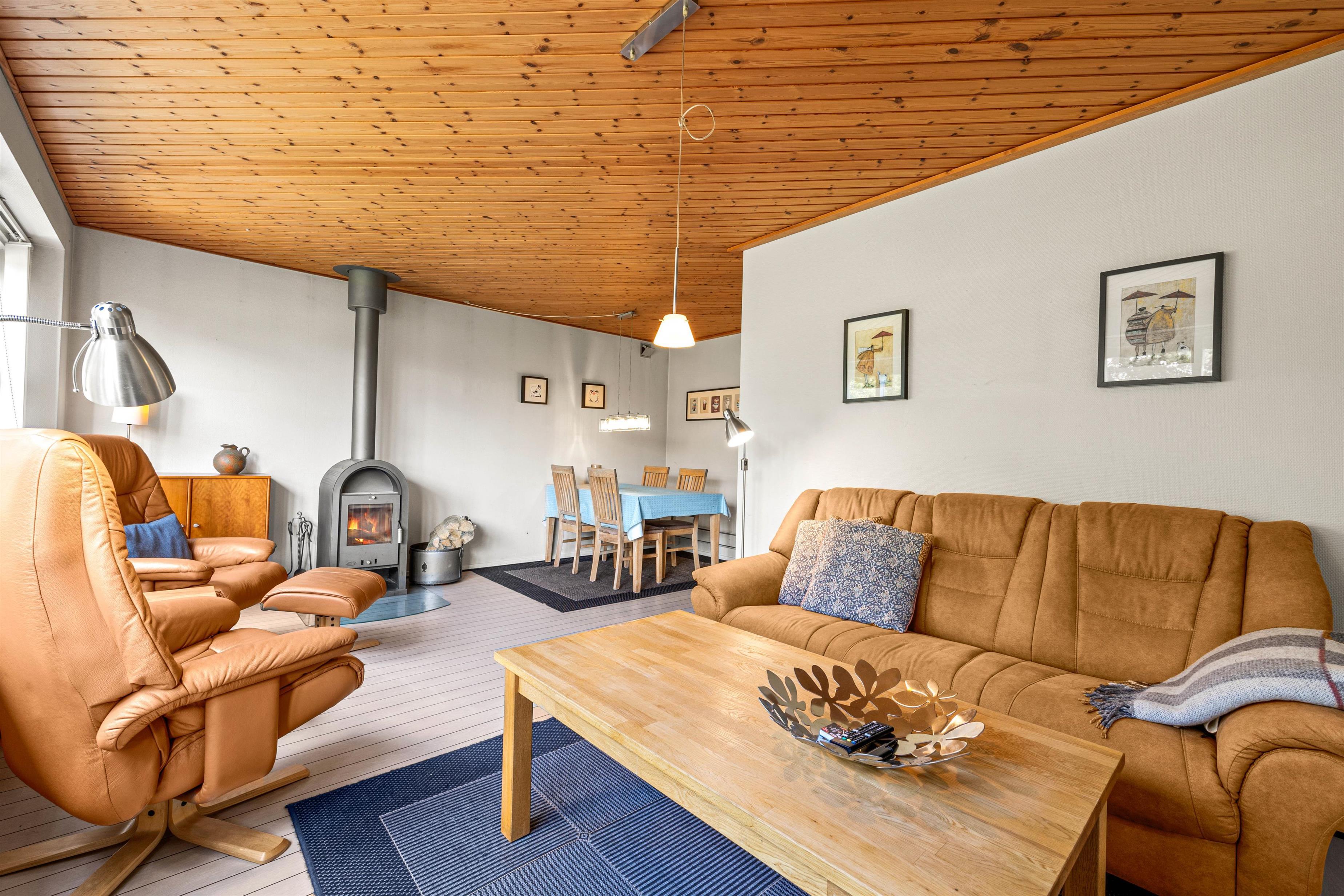 The living room with dining area is the main room in the holiday home – here you can make yourselves comfortable, watch a film together and light the wood-burning stove to keep warm on cold days. The separate kitchen is well equipped, including a dishwasher and microwave, of course, and here you can prepare delicious holiday meals.