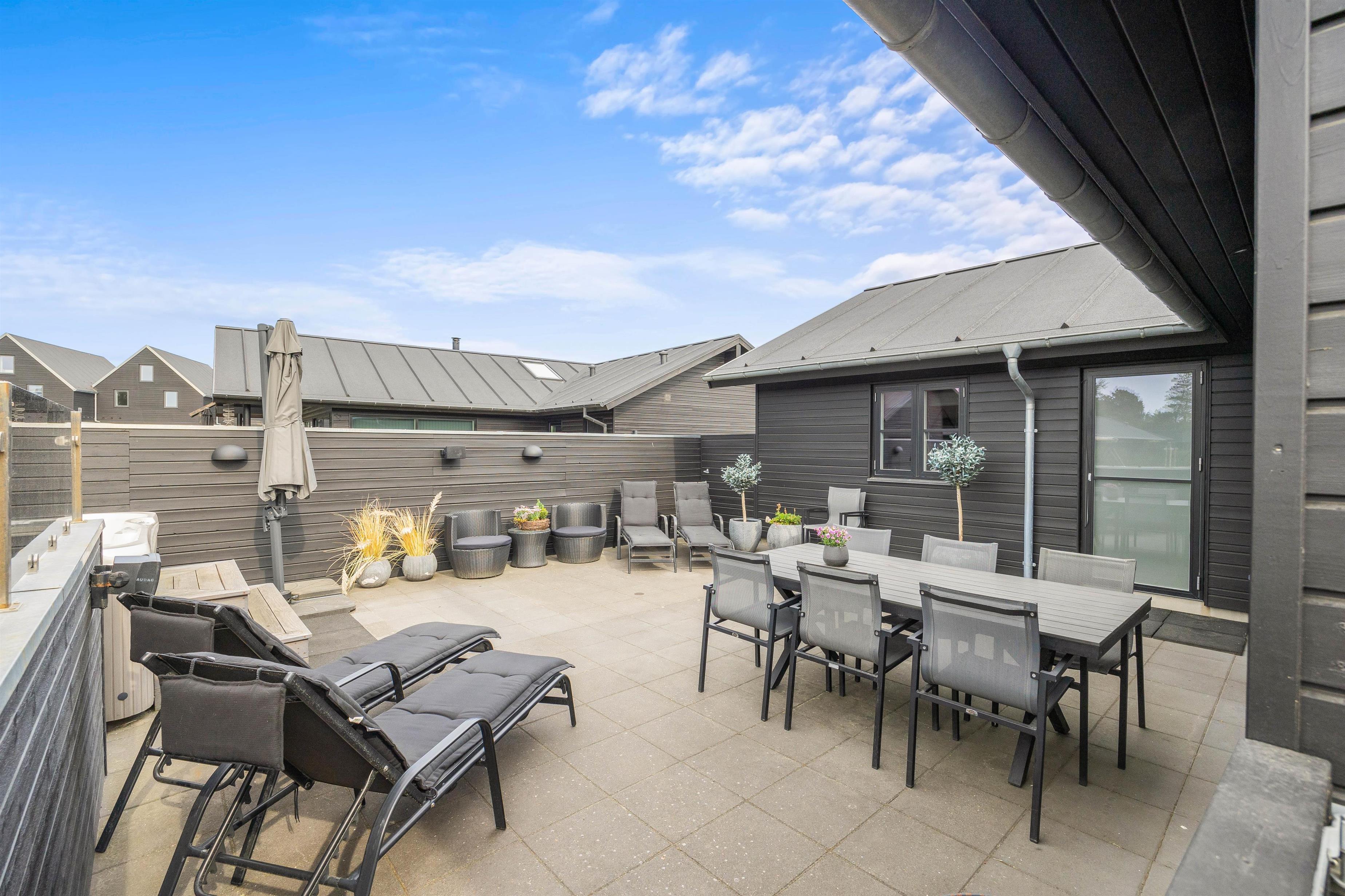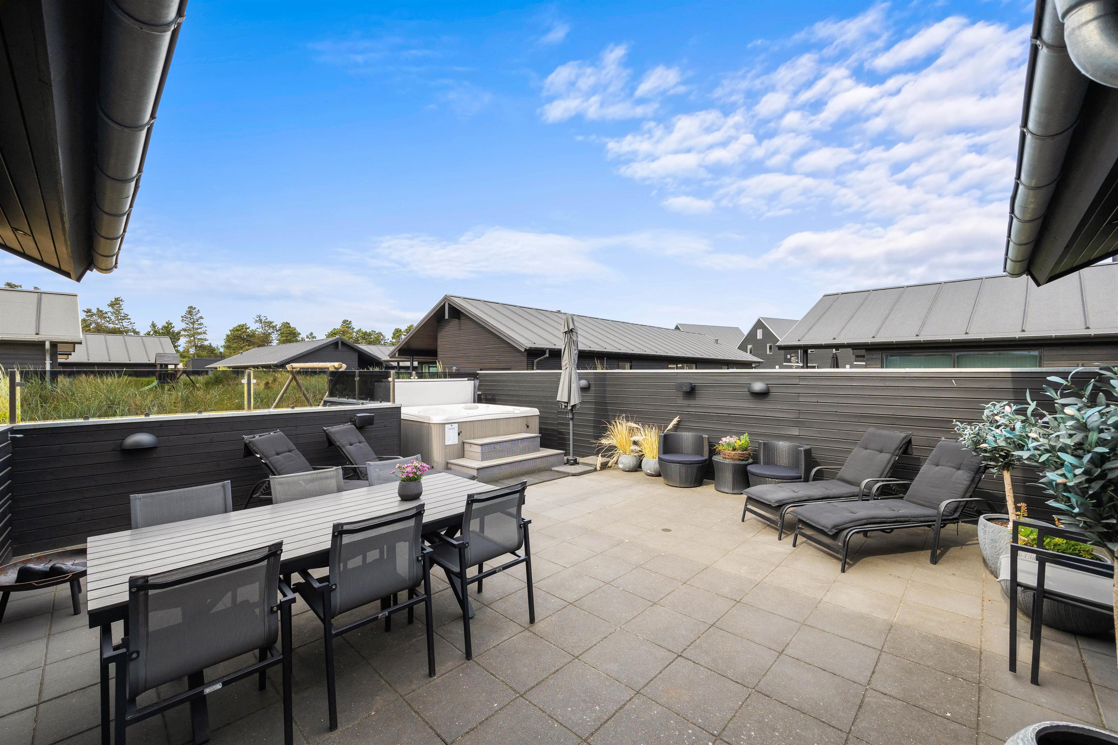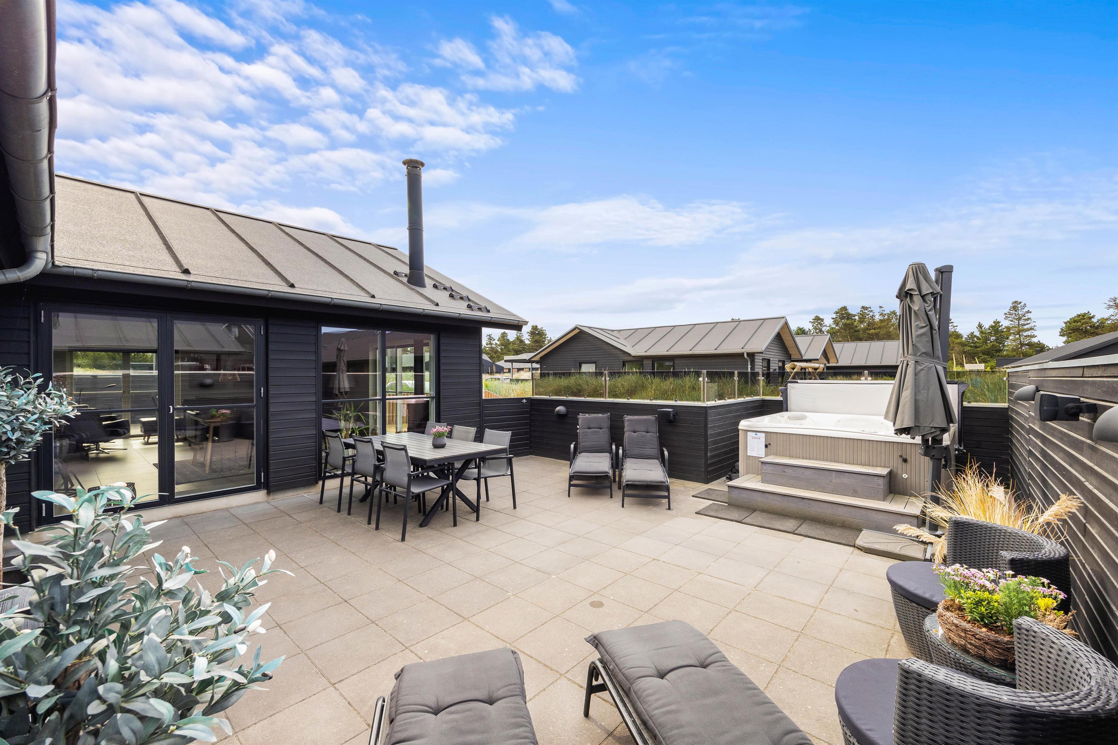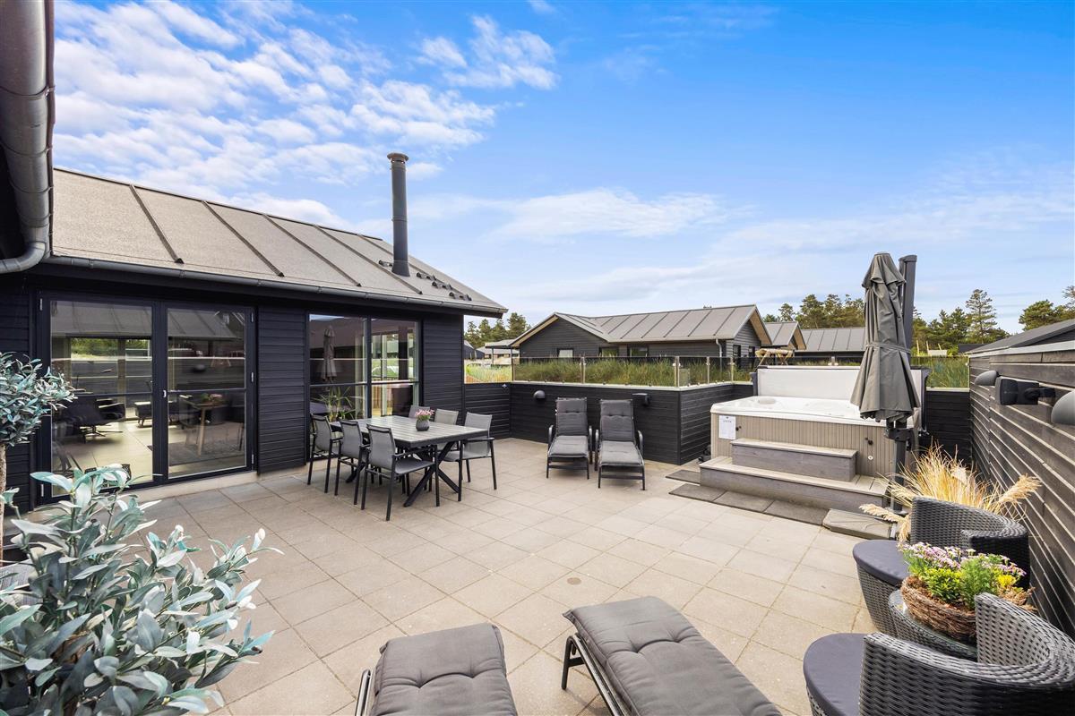 The fenced terrace houses one of the holiday home's absolute highlights: a large outdoor hot tub accommodating 4-6 people. Don't forget your swimwear - you can enjoy the warm hot tub under the open sky all year round!