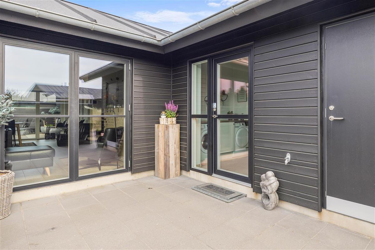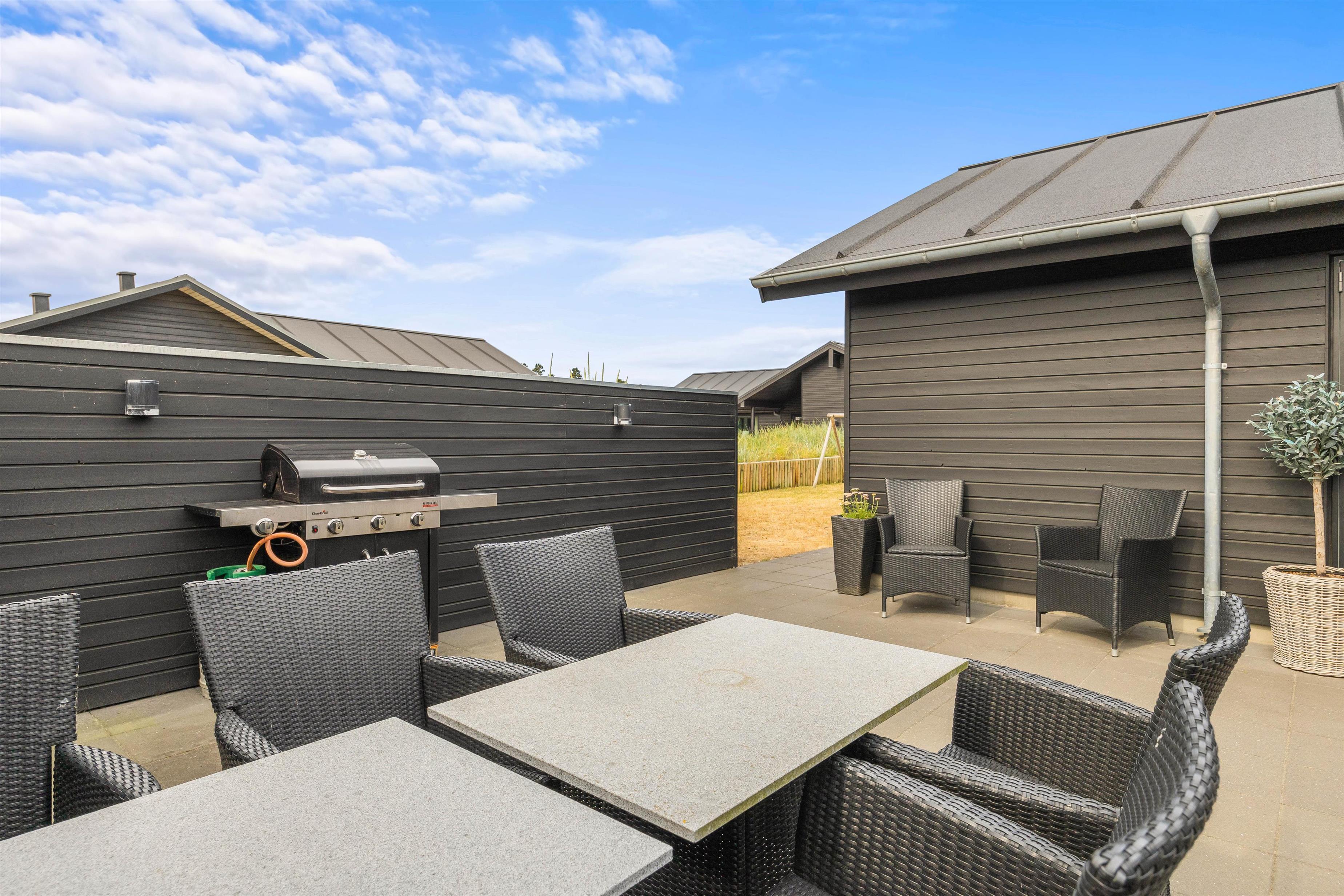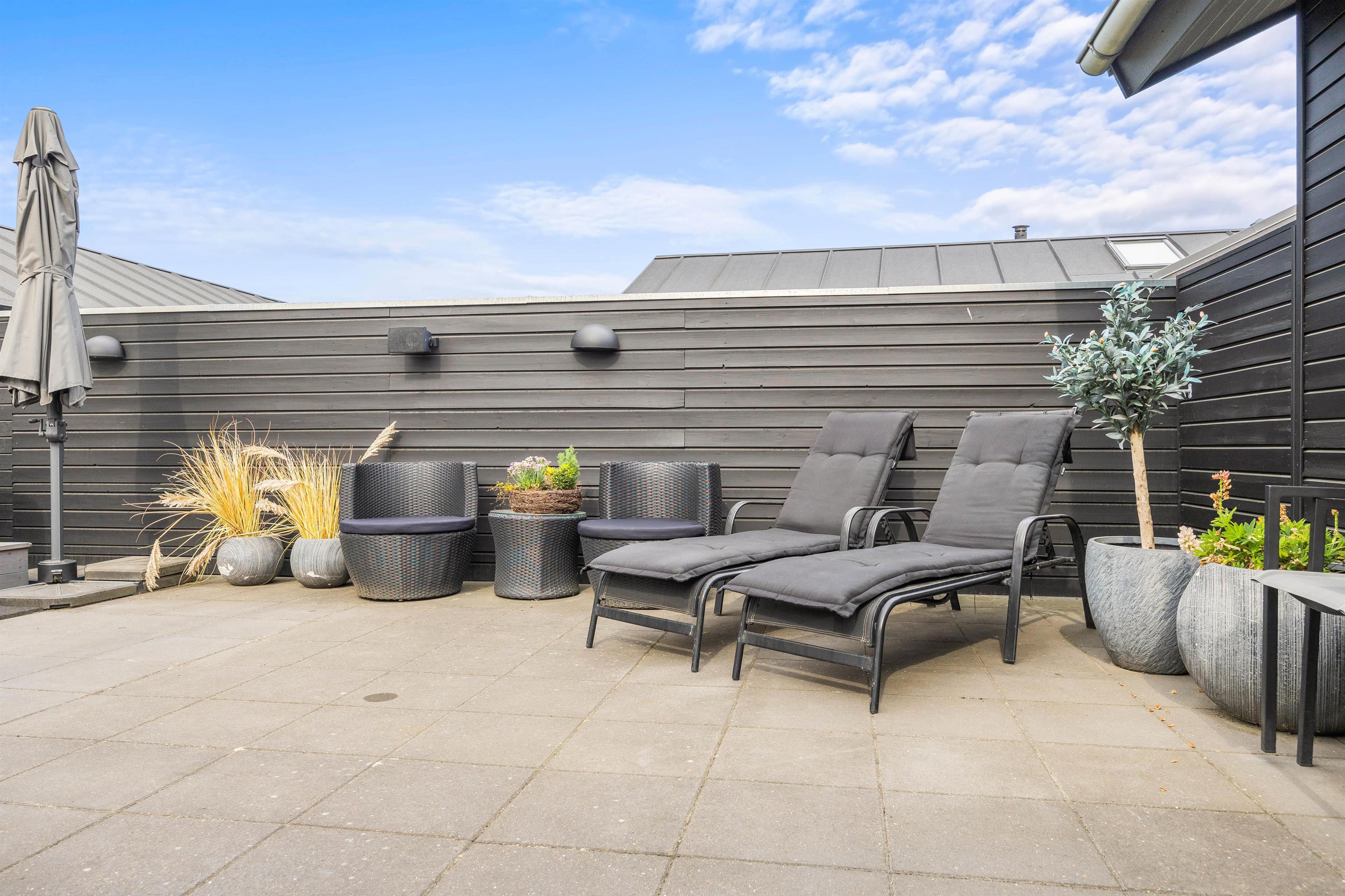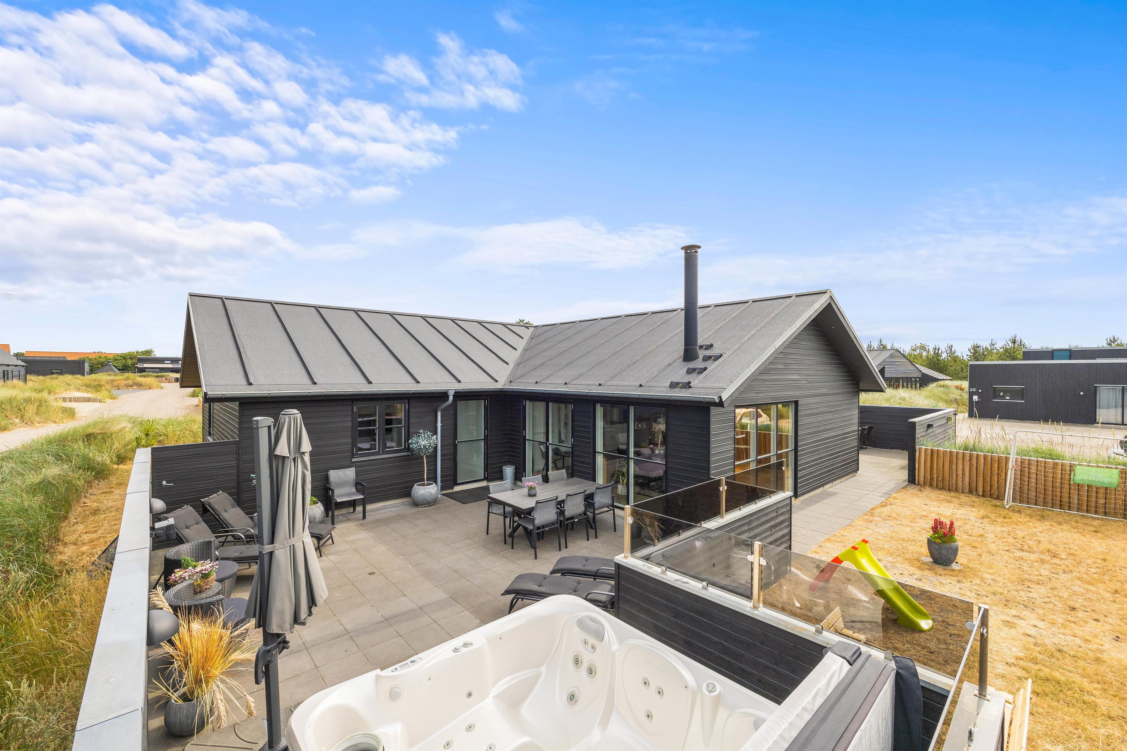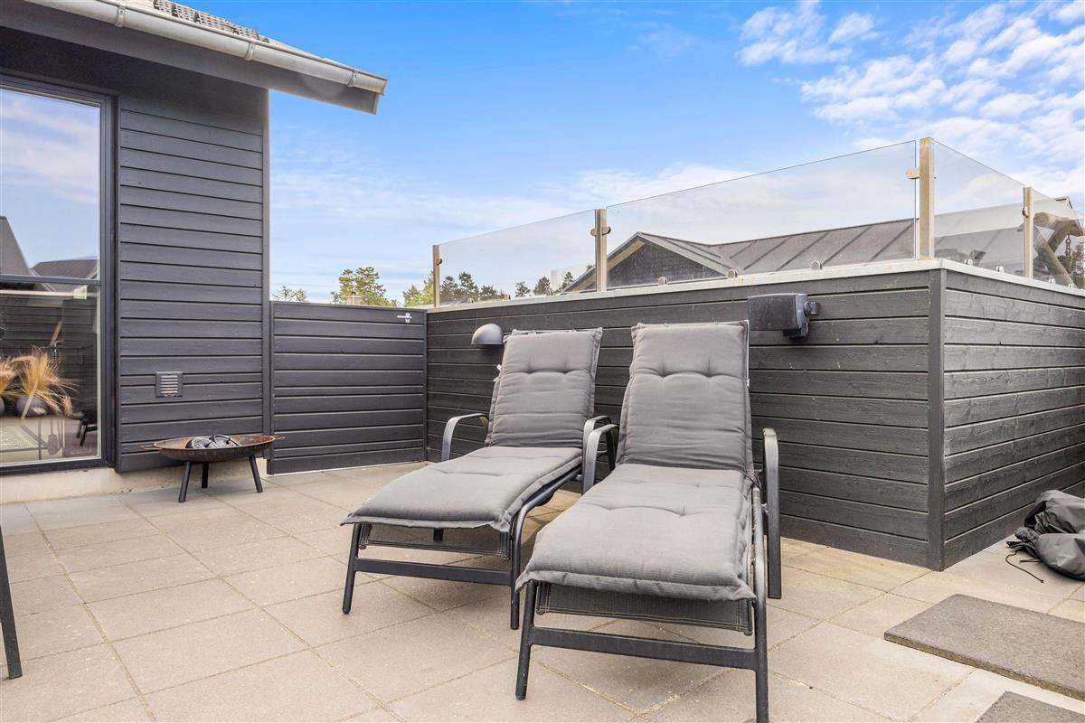 The fenced terrace houses one of the holiday home's absolute highlights: a large outdoor hot tub accommodating 4-6 people. Don't forget your swimwear - you can enjoy the warm hot tub under the open sky all year round!