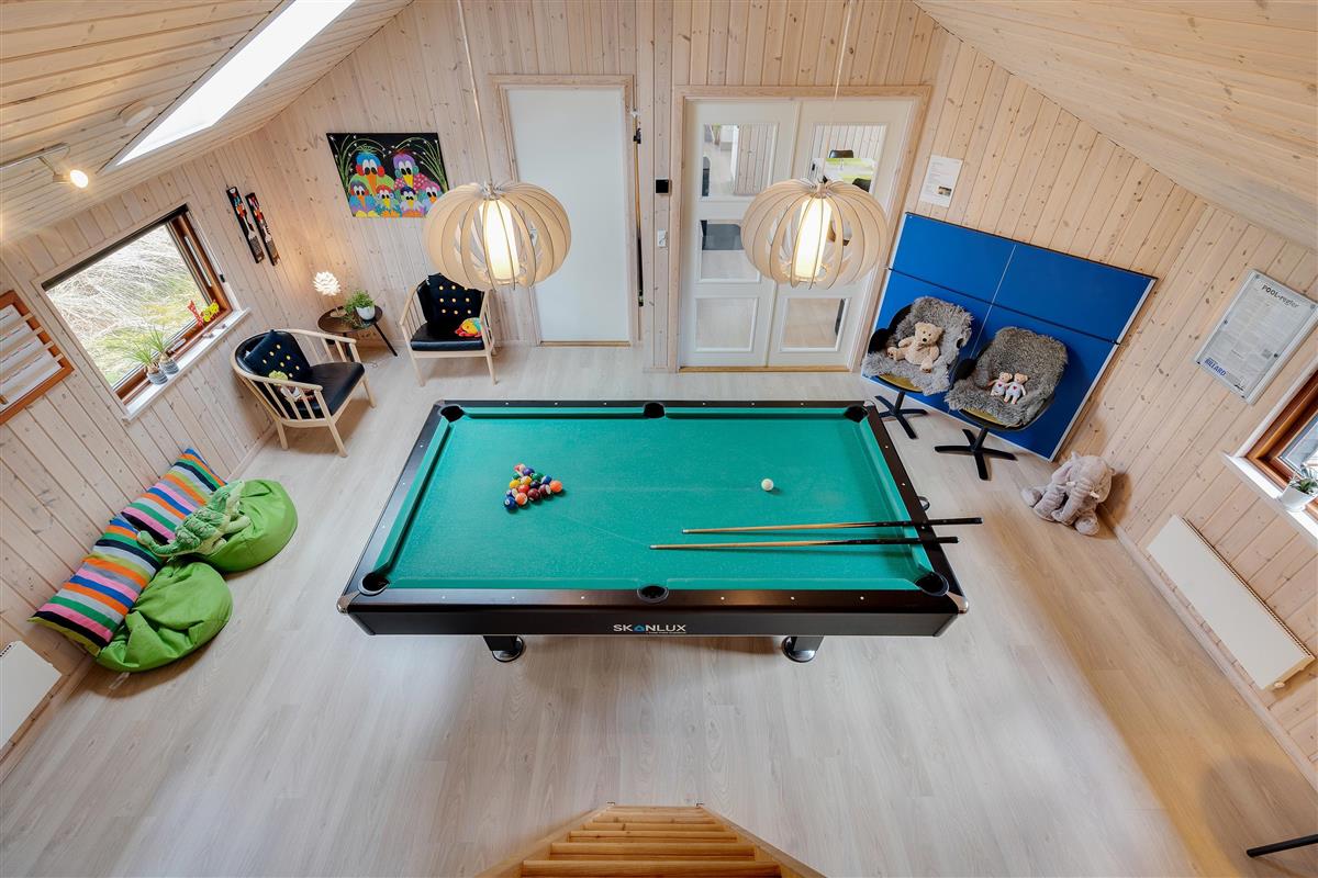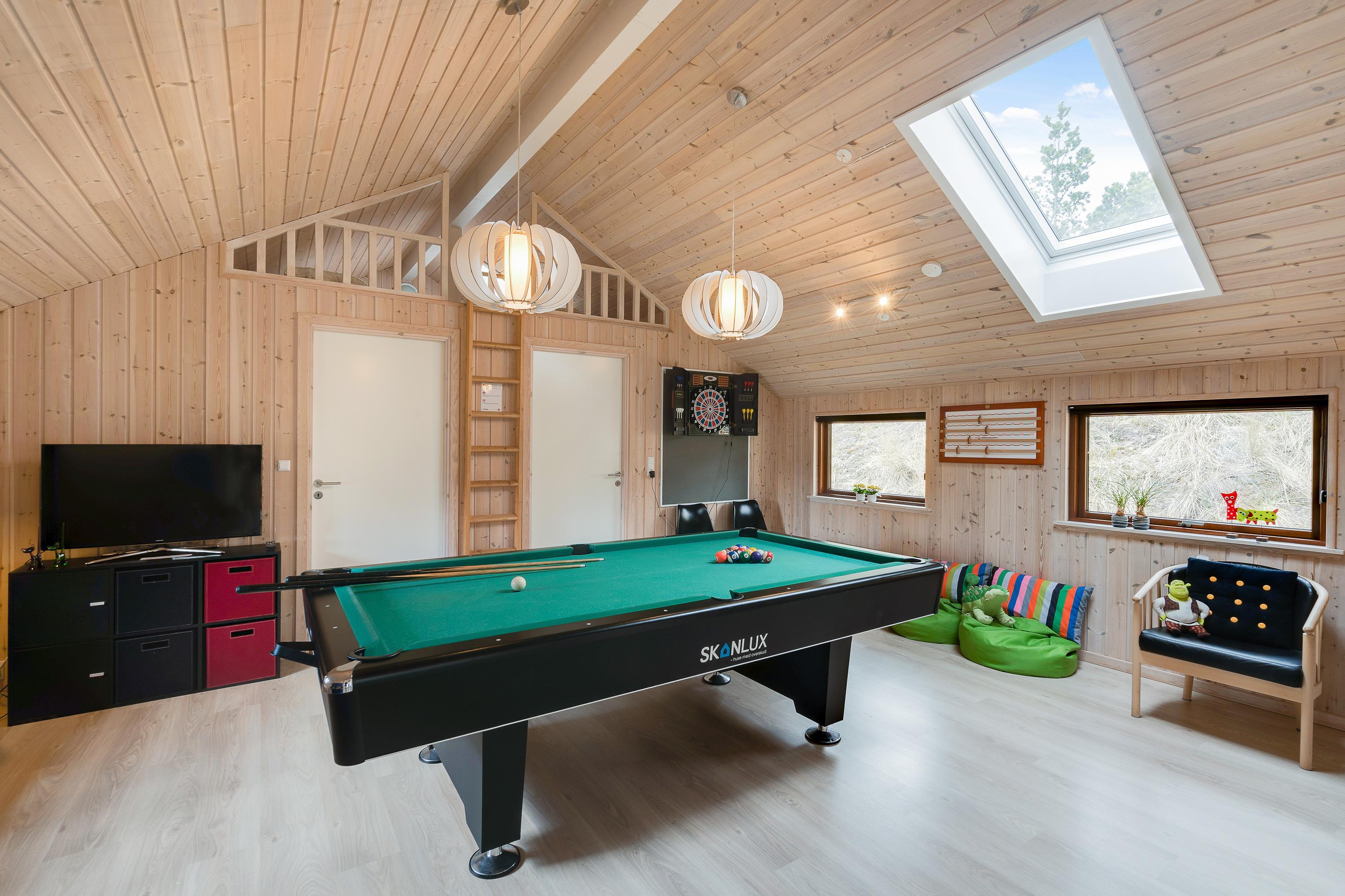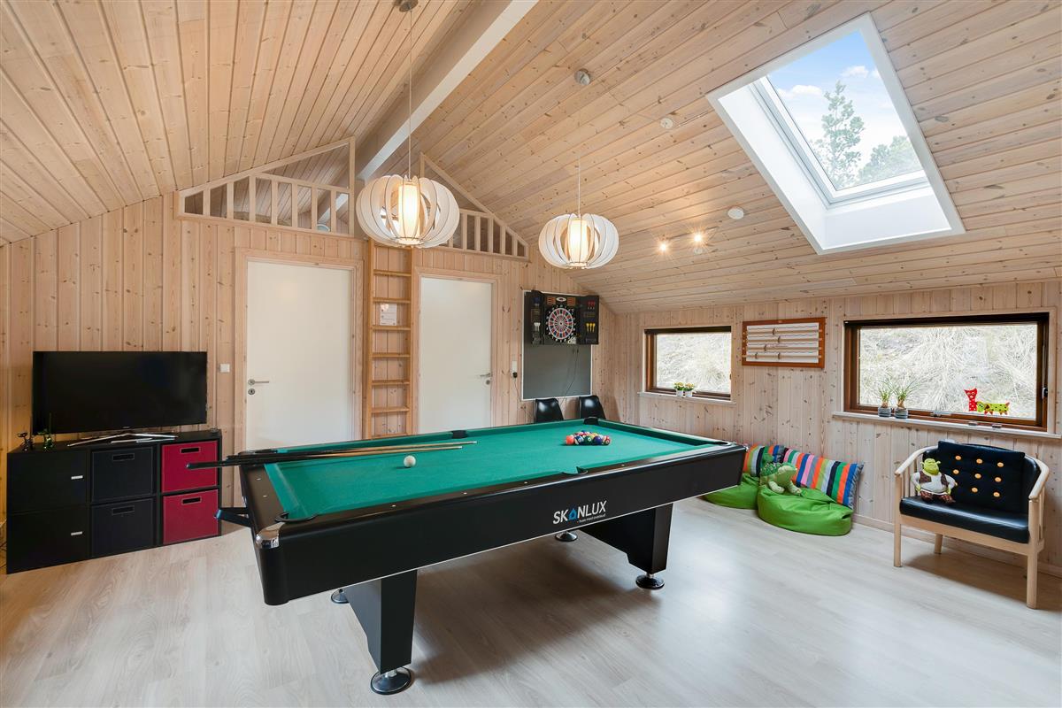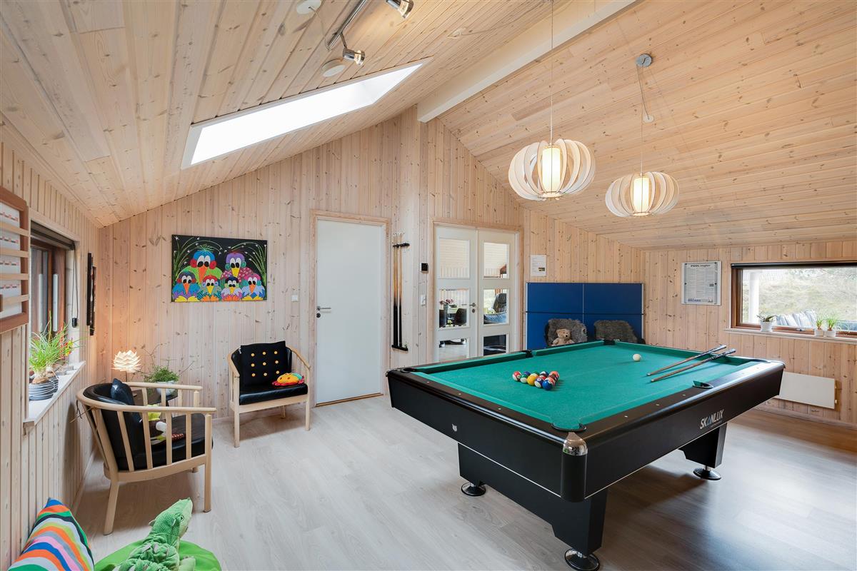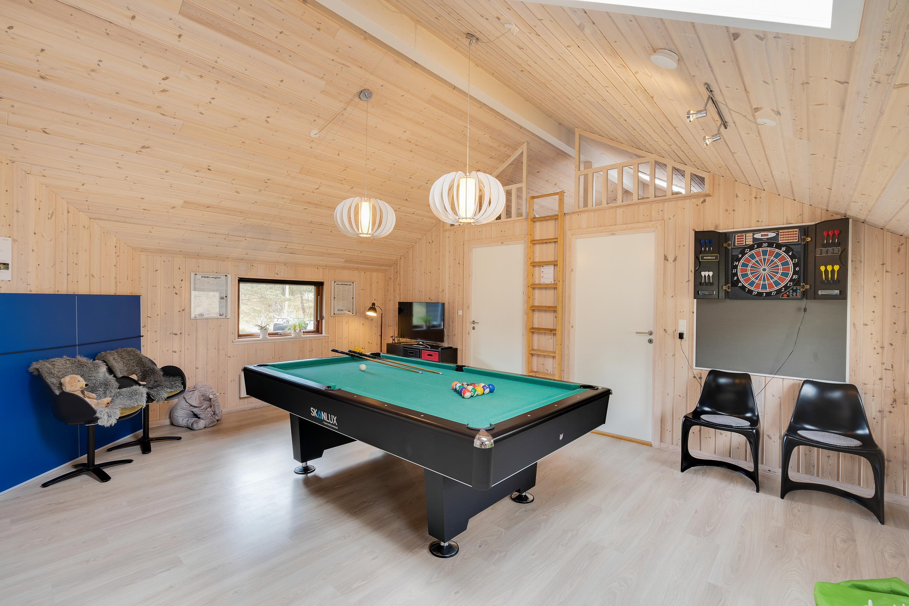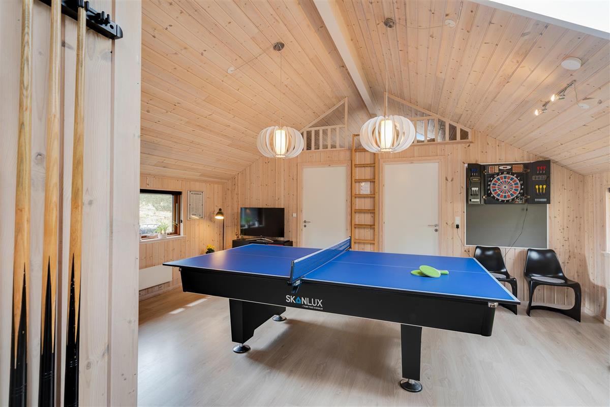 Spend your evenings relaxing on the sofa - enjoy the warming fire from the wood-burning stove, read a book or watch an entertaining film. This holiday home is equipped with an energy-efficient heat pump and fibre-optic broadband. Adjacent to the living area, the games room offers active guests the chance to enjoy pool or table tennis tournaments - whatever takes your fancy.