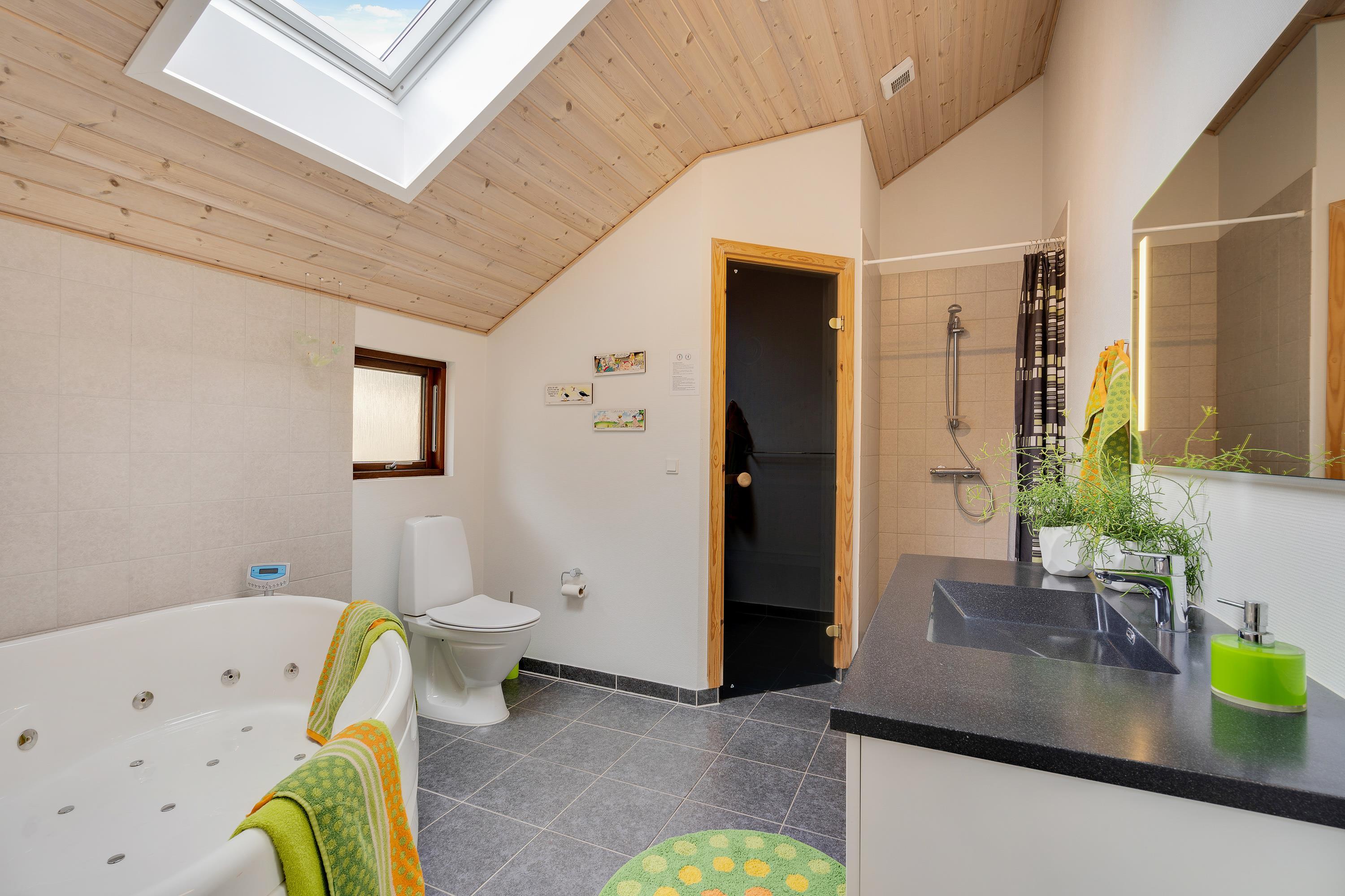 Underfloor heating in both bathrooms ensures warm feet, with one bathroom featuring a sauna and whirlpool, while the other houses a washing machine and tumble dryer.