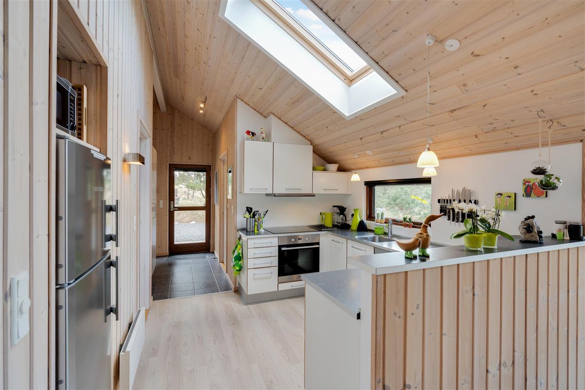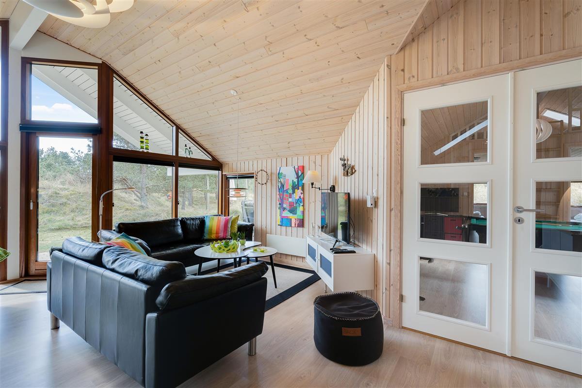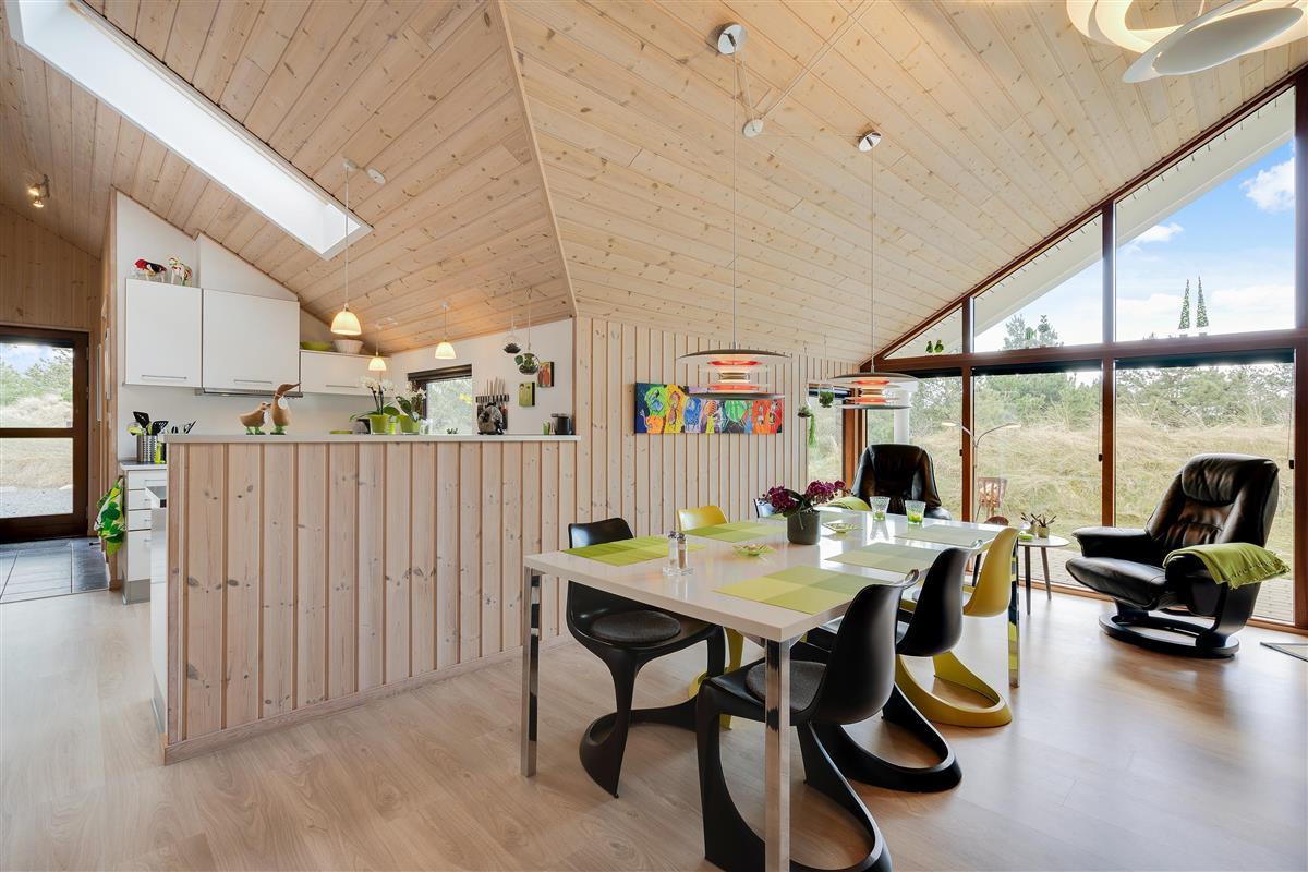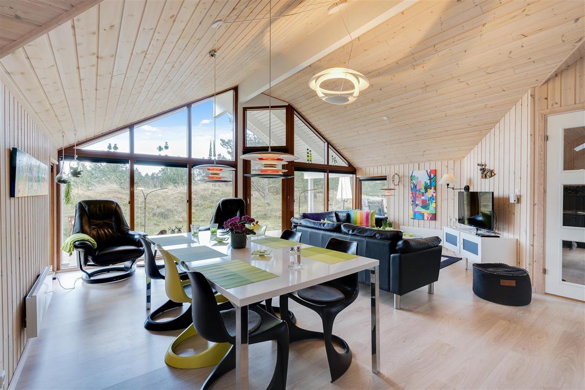 The open-plan dining and living area integrates with the kitchen, allowing everyone to spend time together while preparing meals. Through the large windows, you can enjoy views of the natural surroundings - you might even spot a deer passing by.