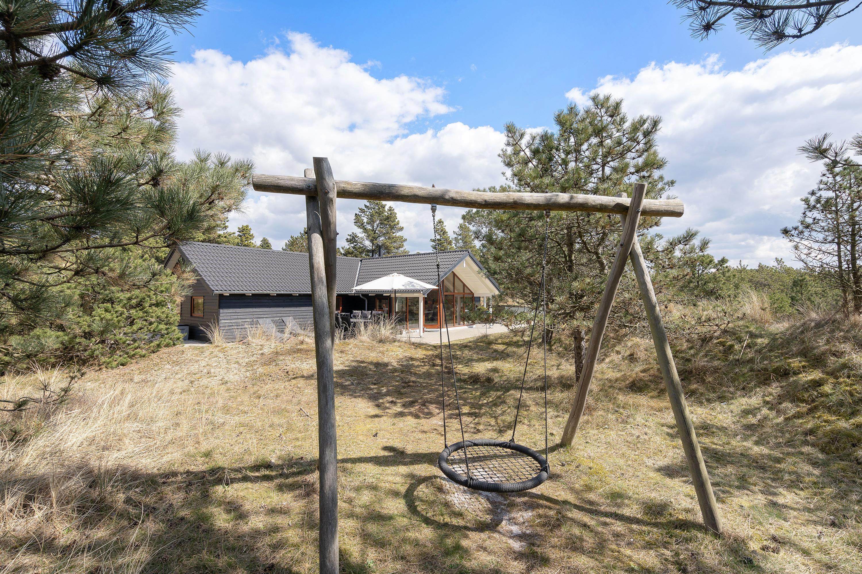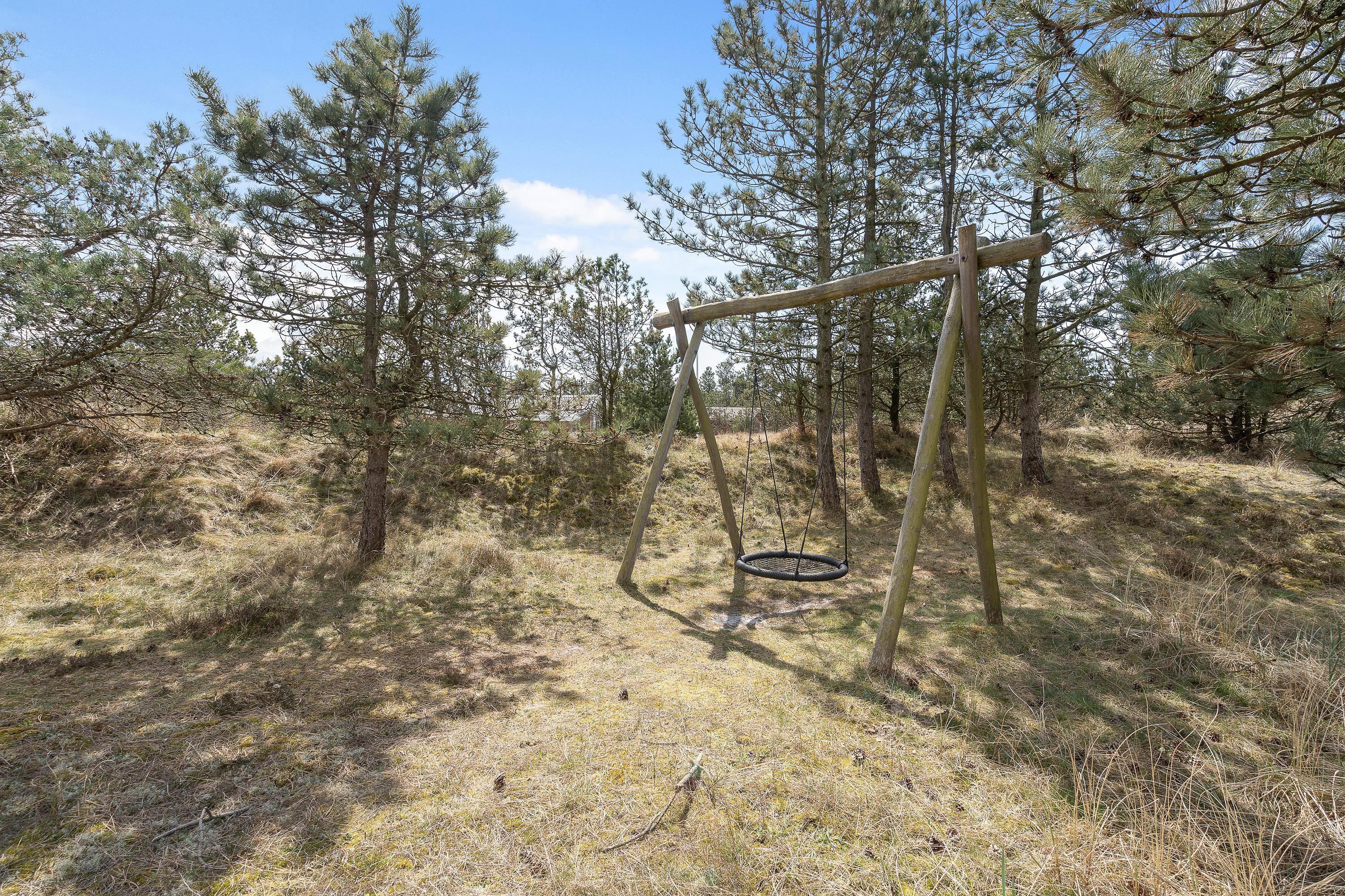 This natural plot, screened by trees and bushes, is well-equipped for children, featuring a swing and sandpit.