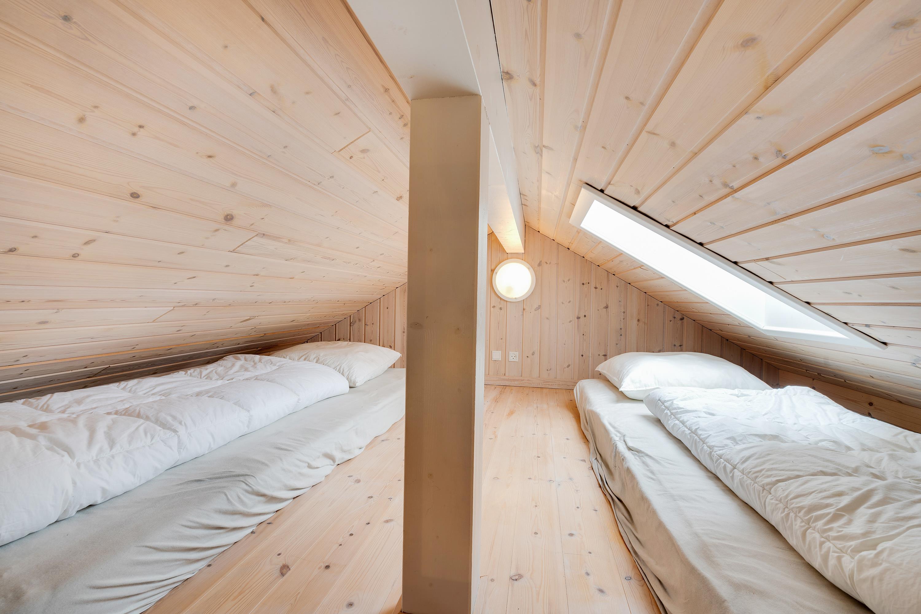 This well-appointed holiday home features 3 bedrooms, each equipped with a double bed. 2 of the total 8 sleeping spaces are arranged in the mezzanine area above the living space.