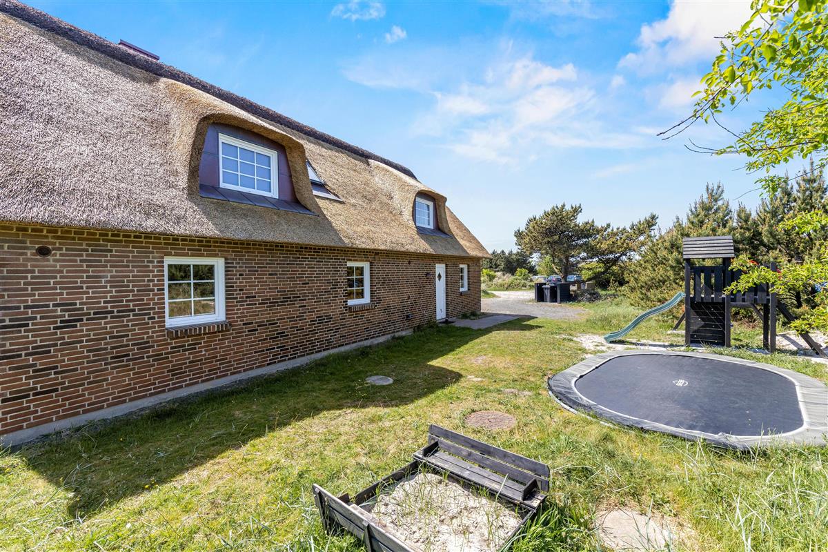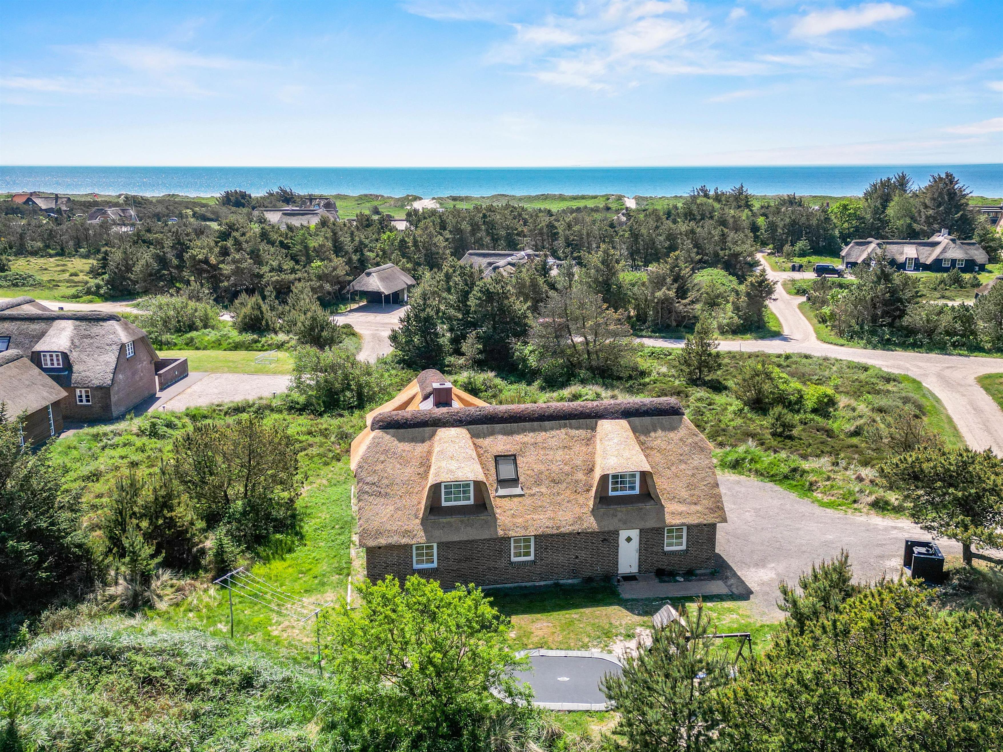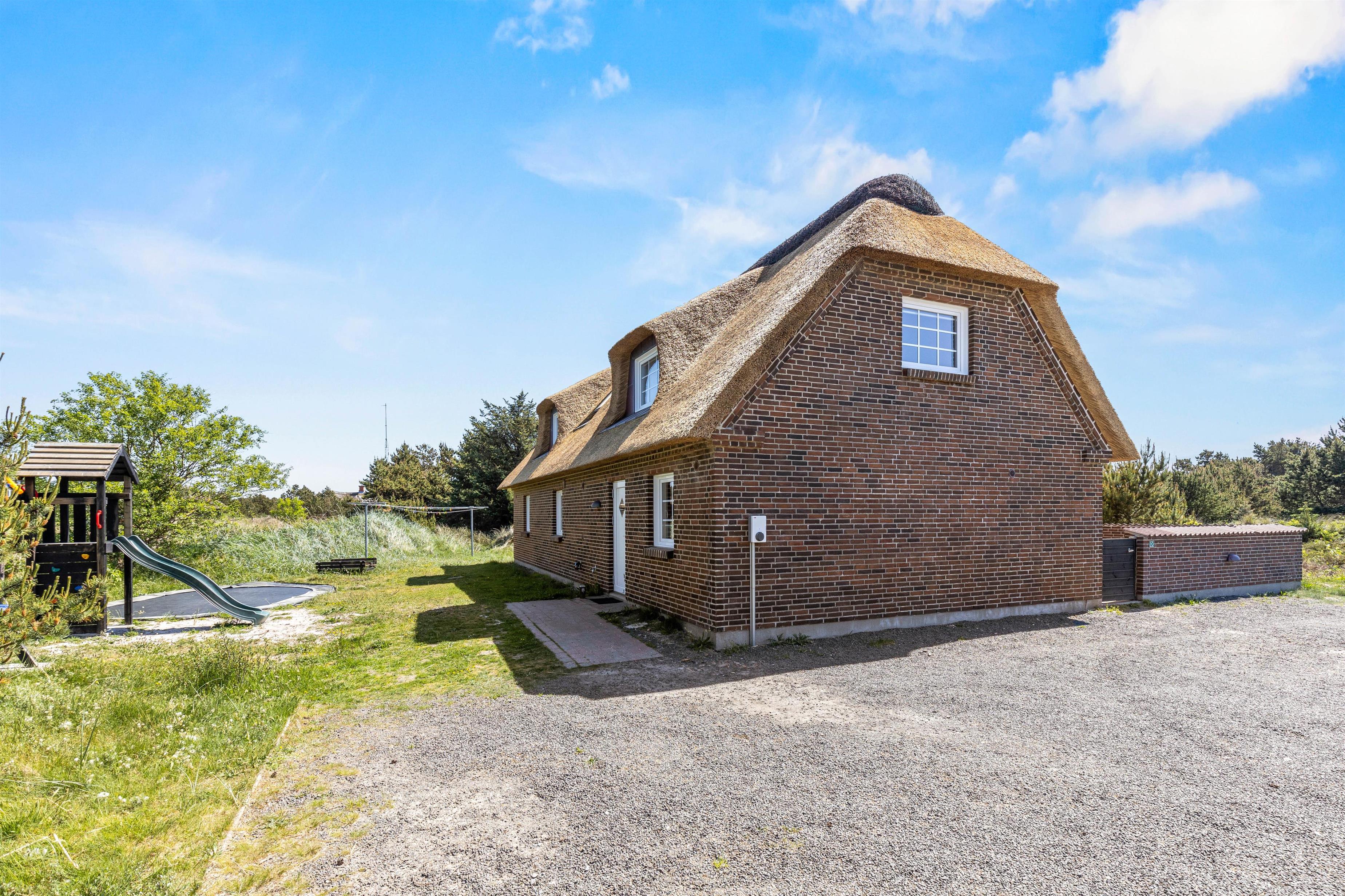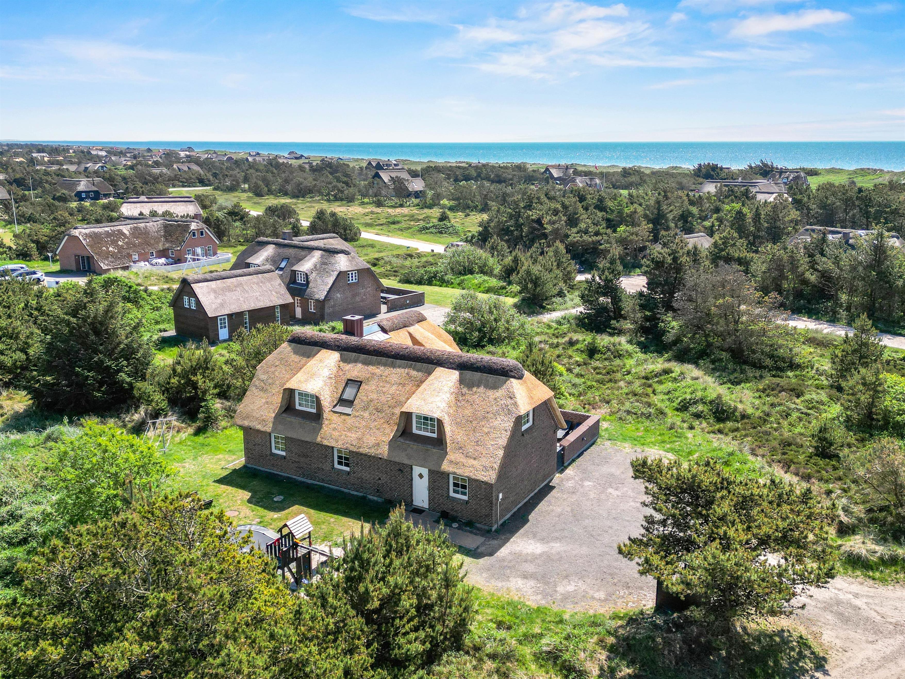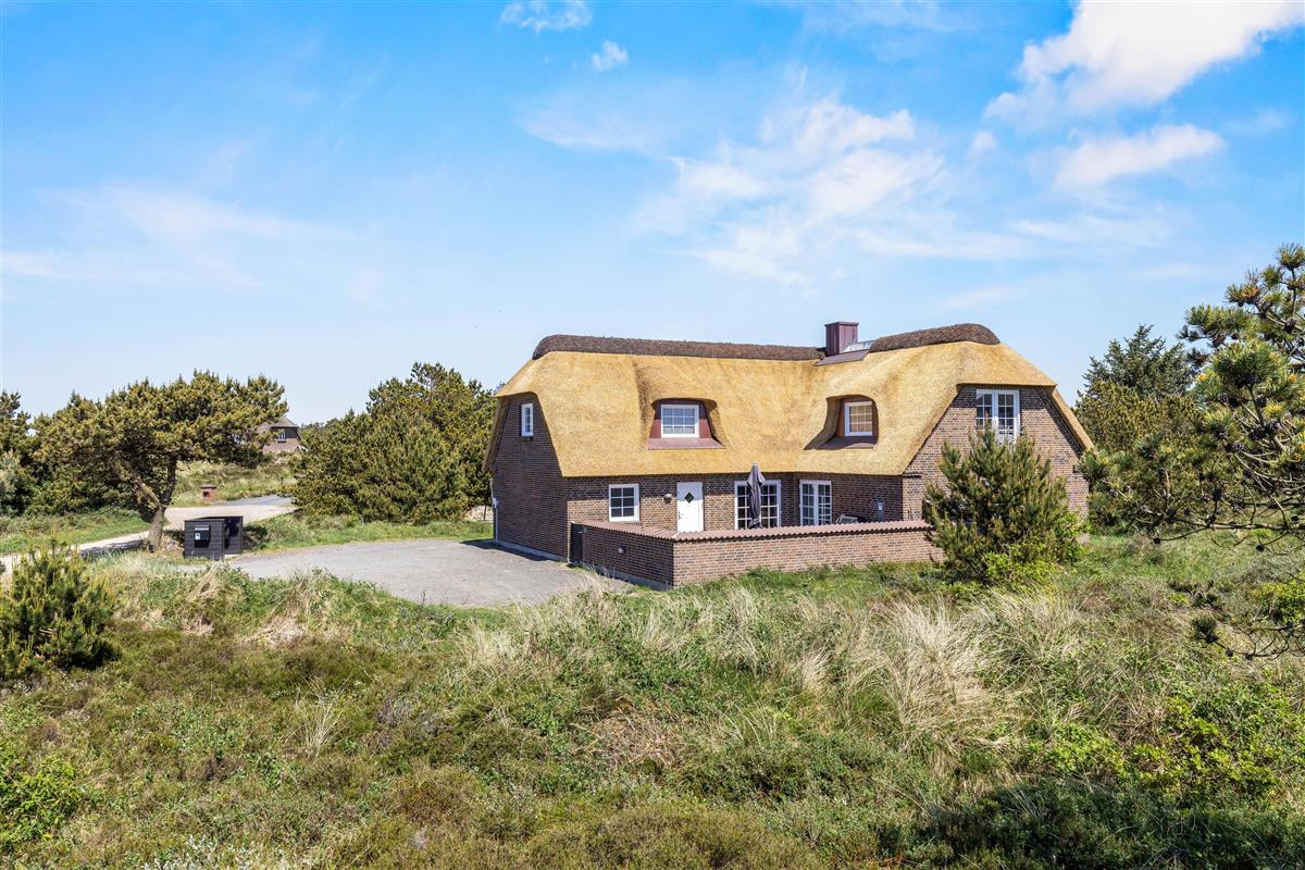 Located at Horns Rev 10 in Blåvand, this thatched roof holiday home with pool sits on beautiful natural grounds within the dune landscape. It accommodates up to 12 people, making it ideal for family holidays or groups of couples holidaying together. You're also welcome to bring two dogs. For those with electric cars, there's a charging point at the holiday home.
