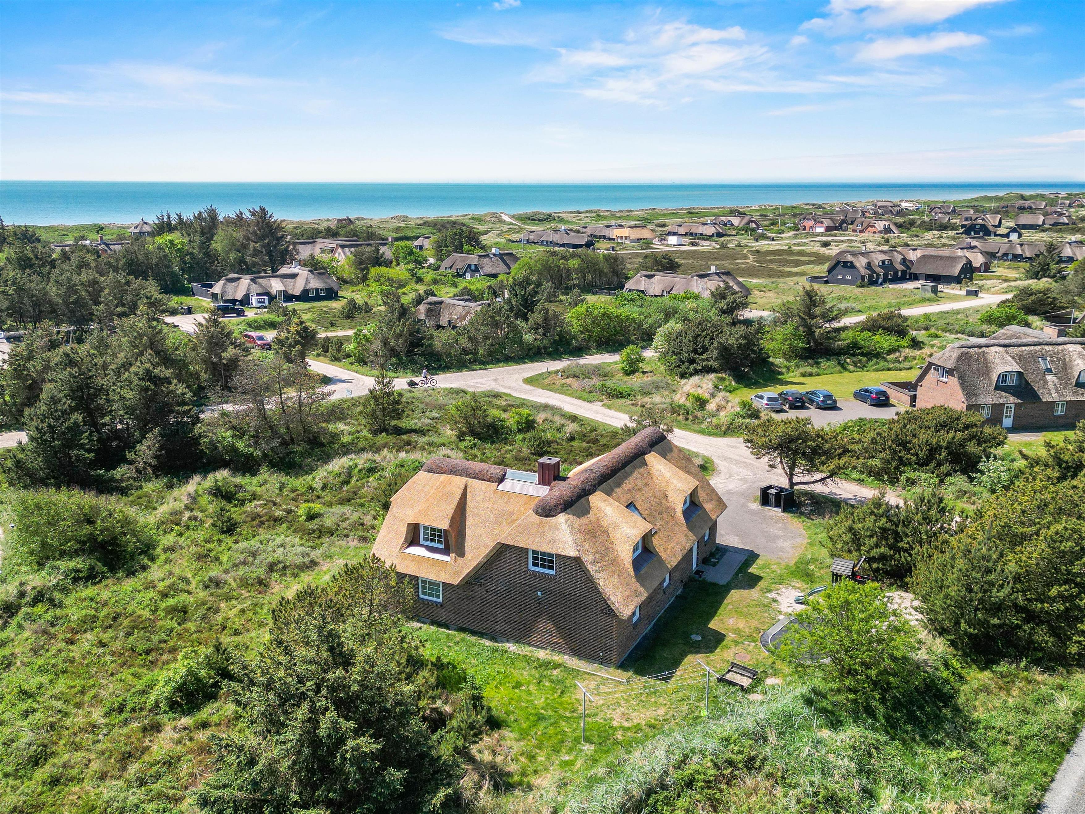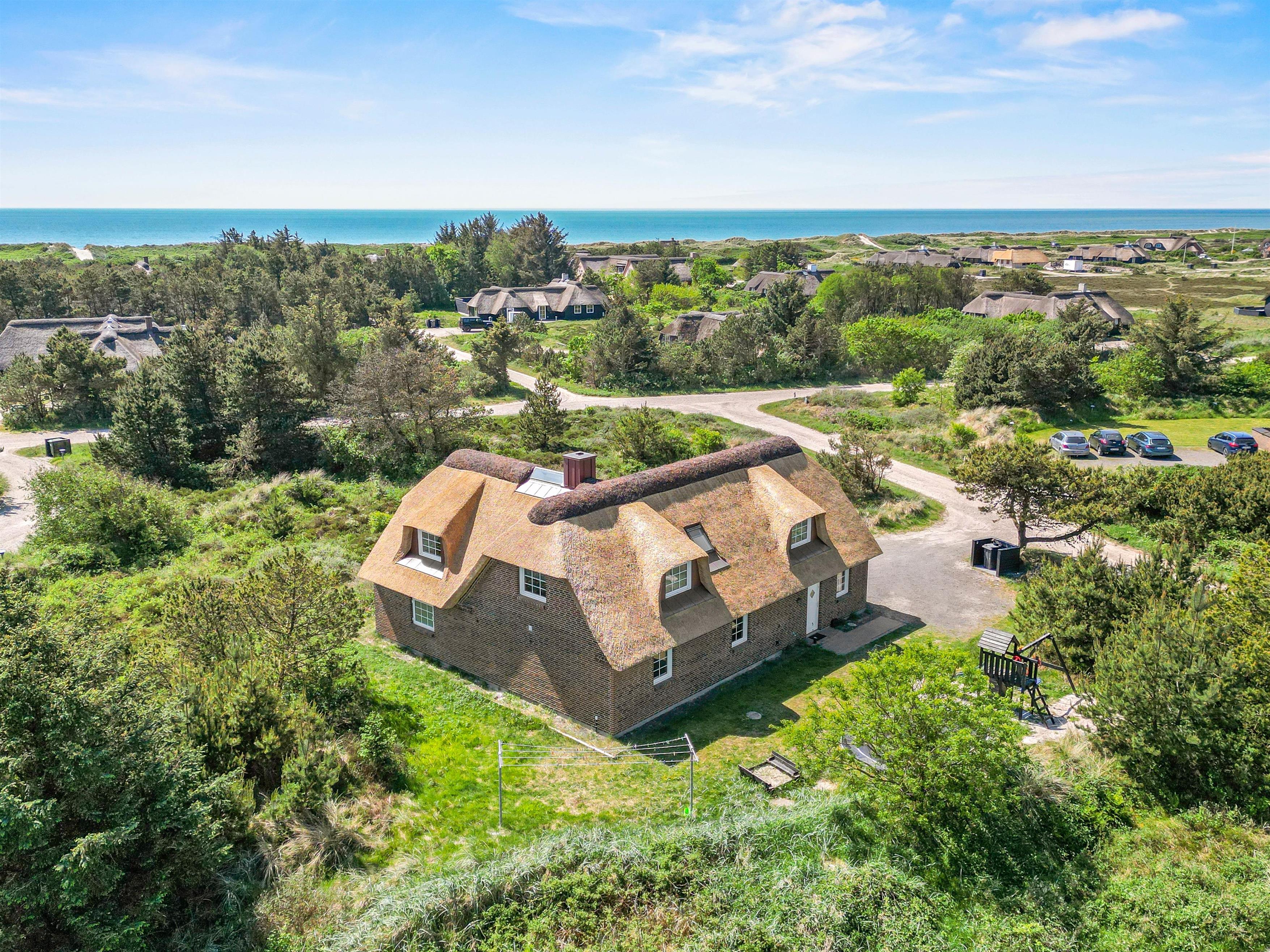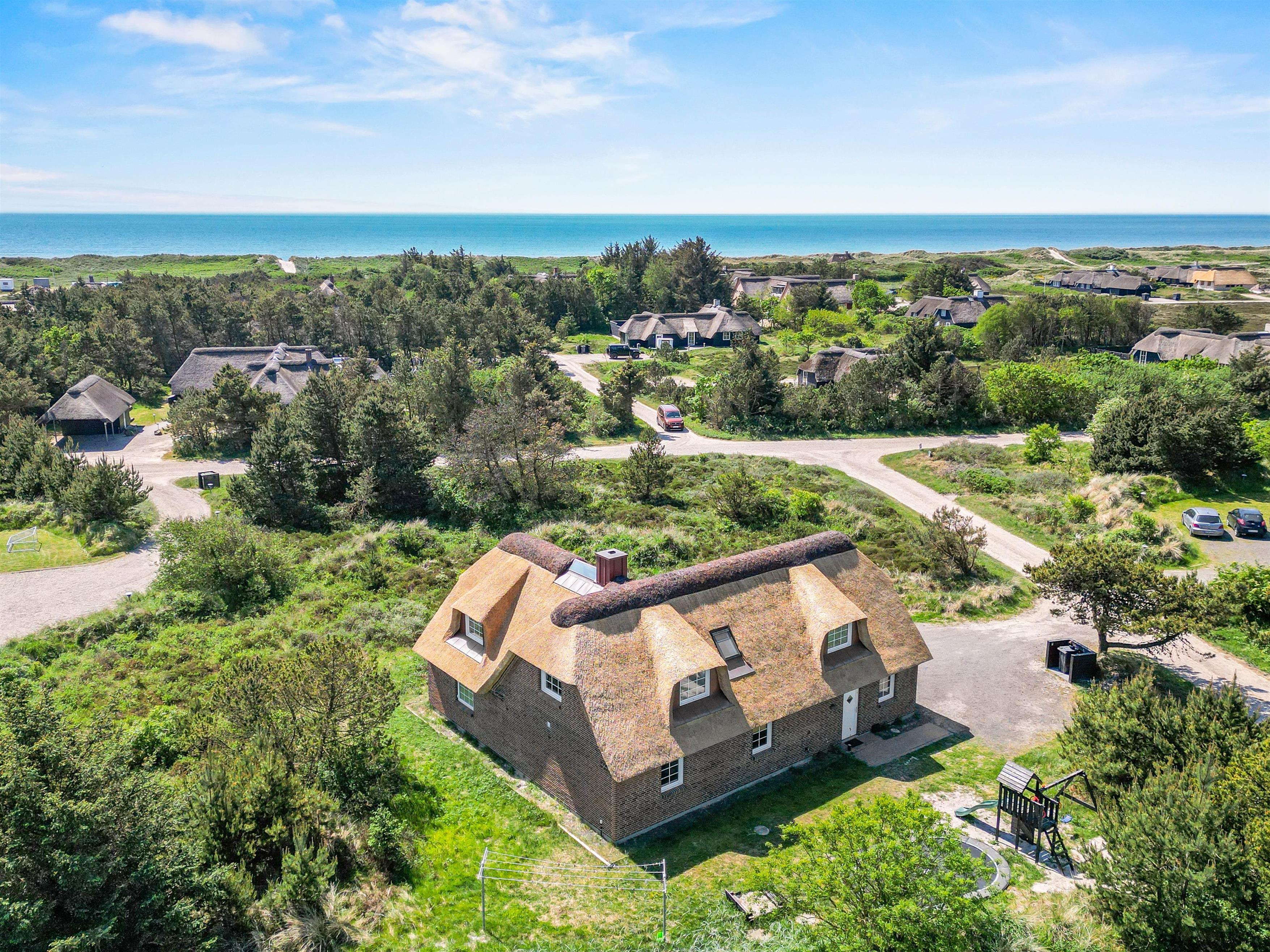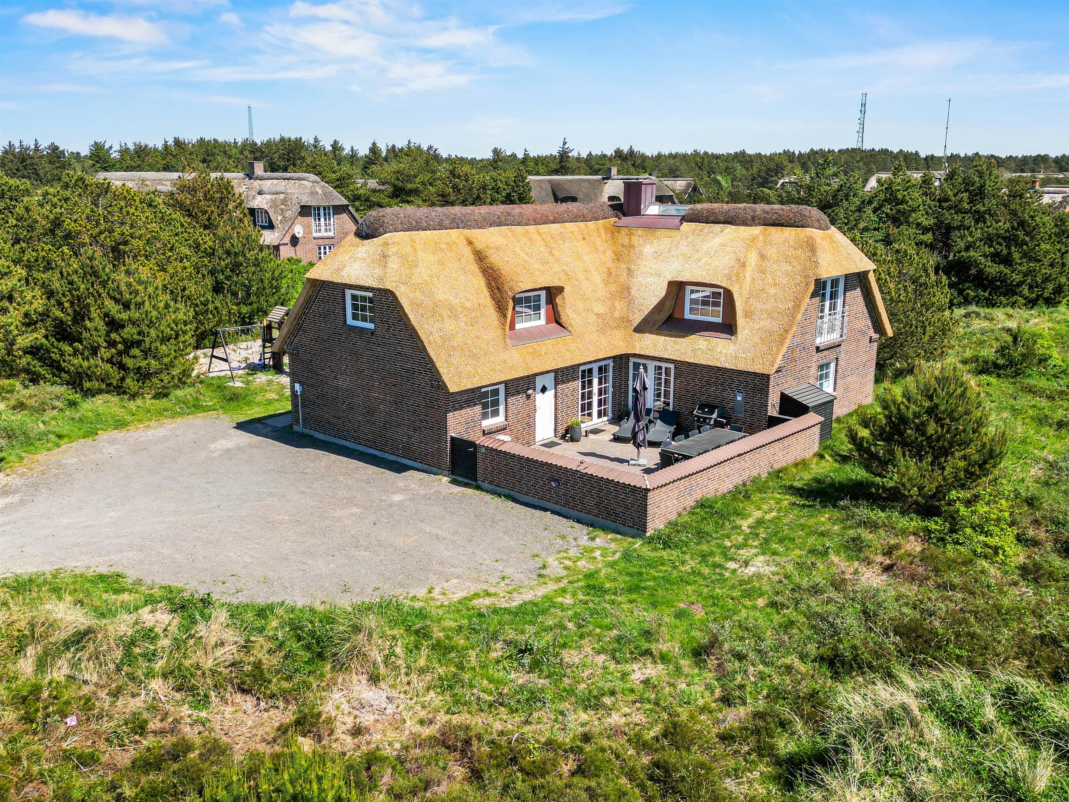 Located at Horns Rev 10 in Blåvand, this thatched roof holiday home with pool sits on beautiful natural grounds within the dune landscape. It accommodates up to 12 people, making it ideal for family holidays or groups of couples holidaying together. You're also welcome to bring two dogs. For those with electric cars, there's a charging point at the holiday home.