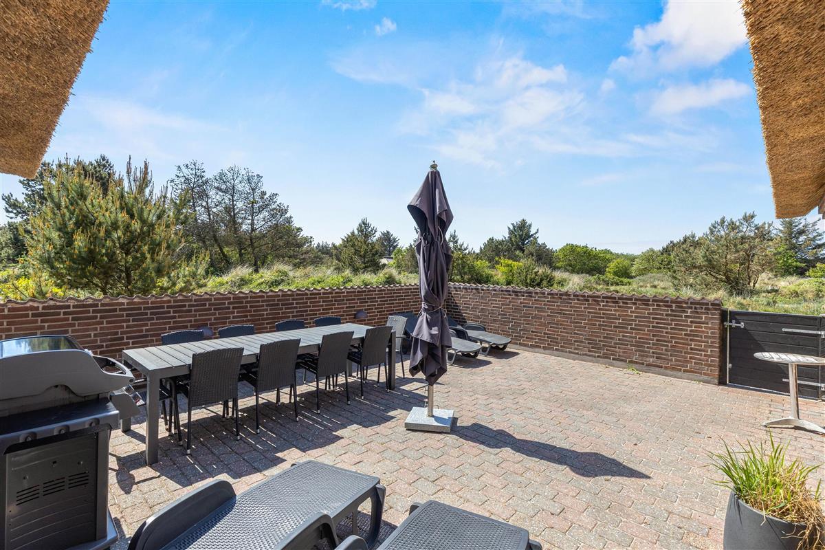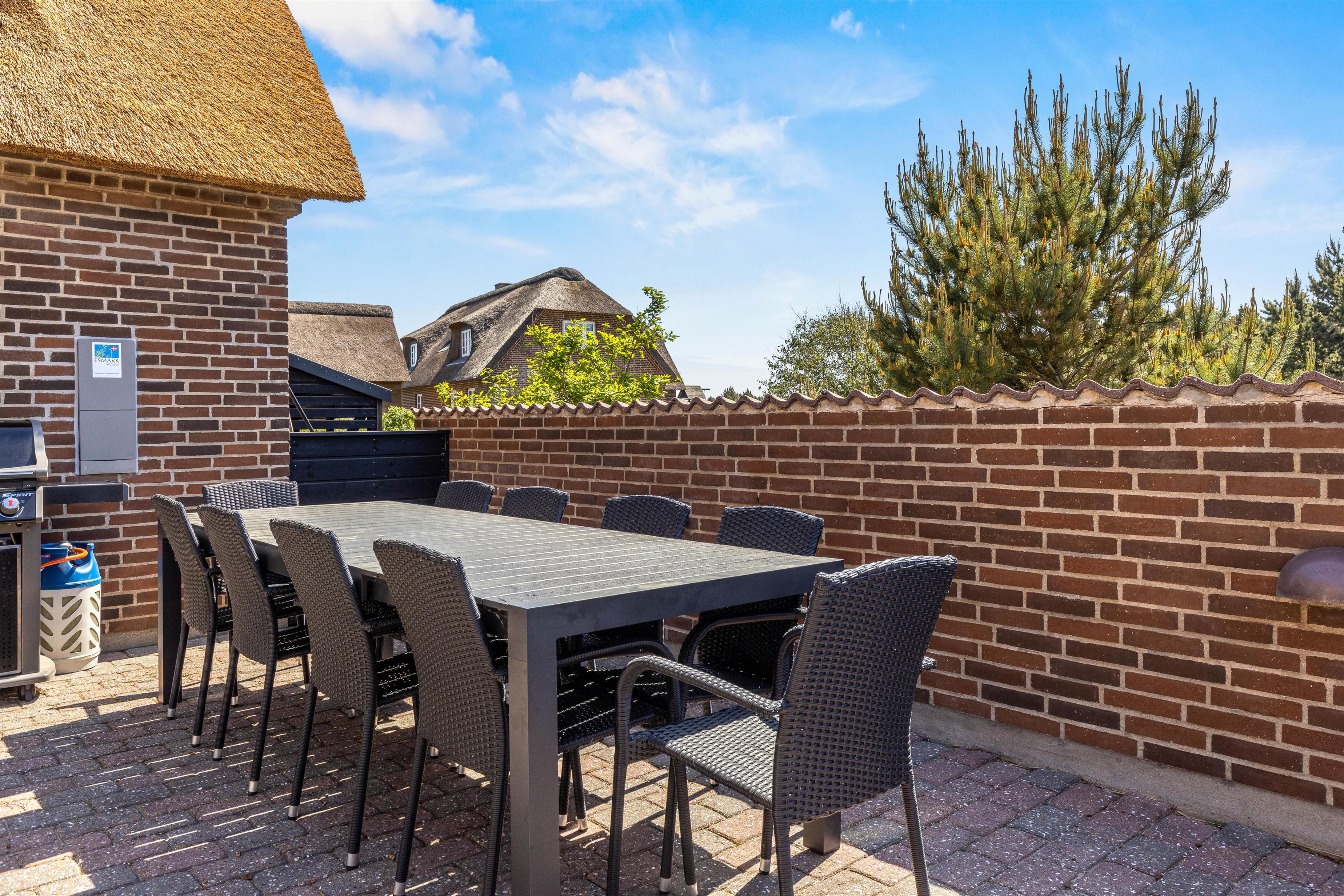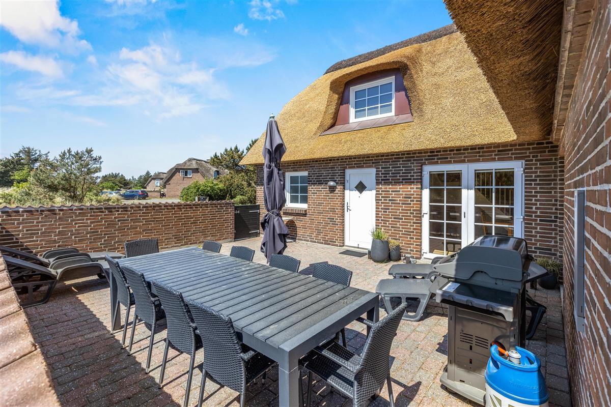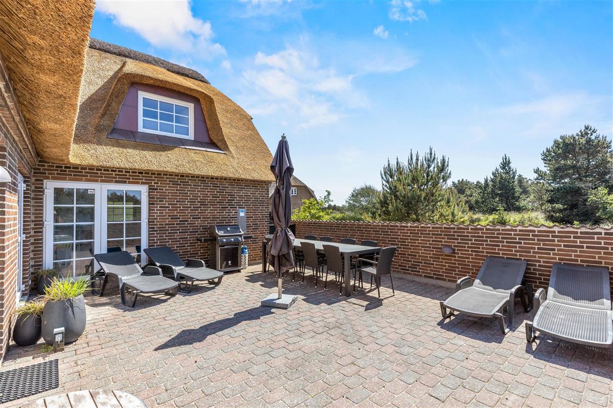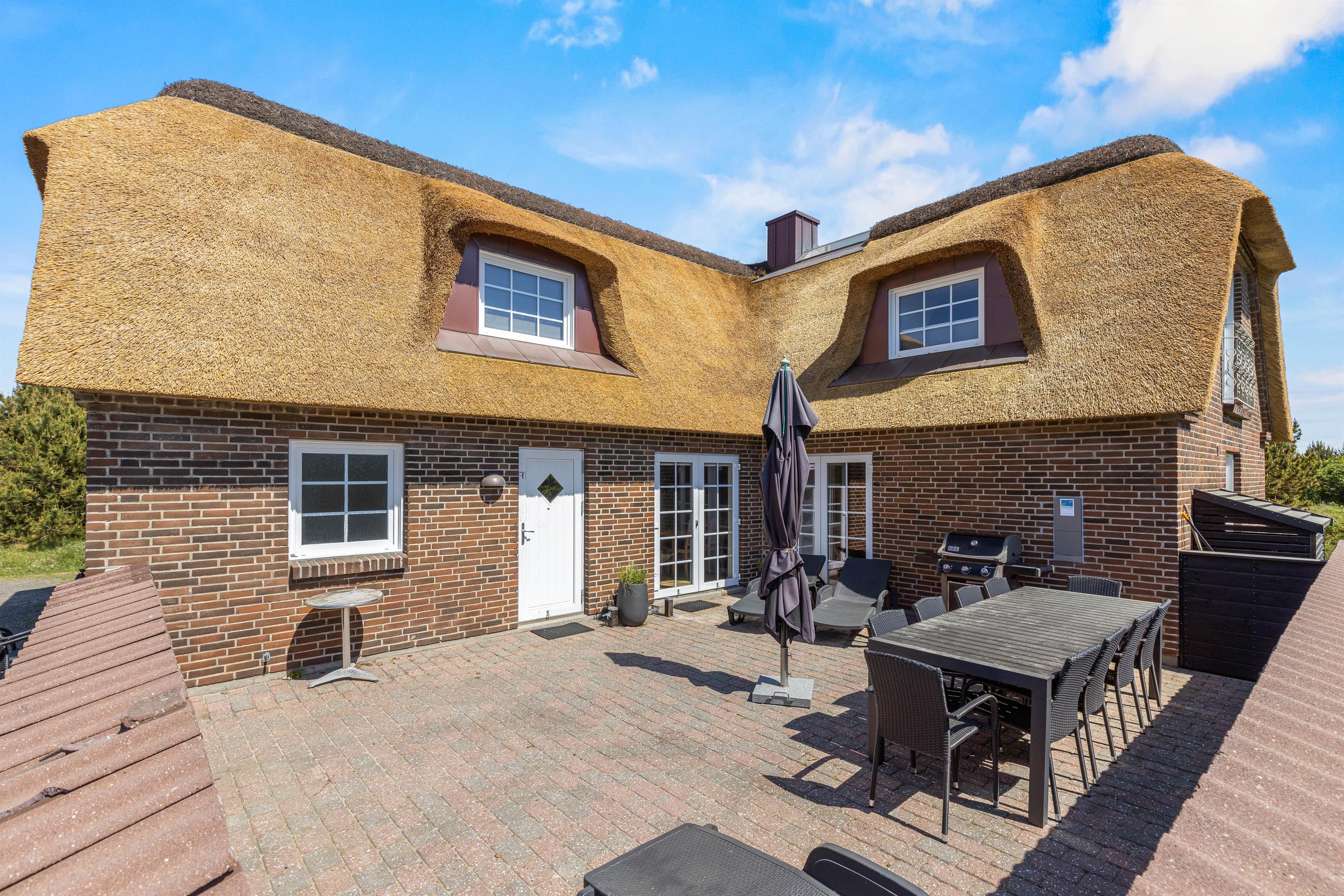Located at Horns Rev 10 in Blåvand, this thatched roof holiday home with pool sits on beautiful natural grounds within the dune landscape. It accommodates up to 12 people, making it ideal for family holidays or groups of couples holidaying together. You're also welcome to bring two dogs. For those with electric cars, there's a charging point at the holiday home.