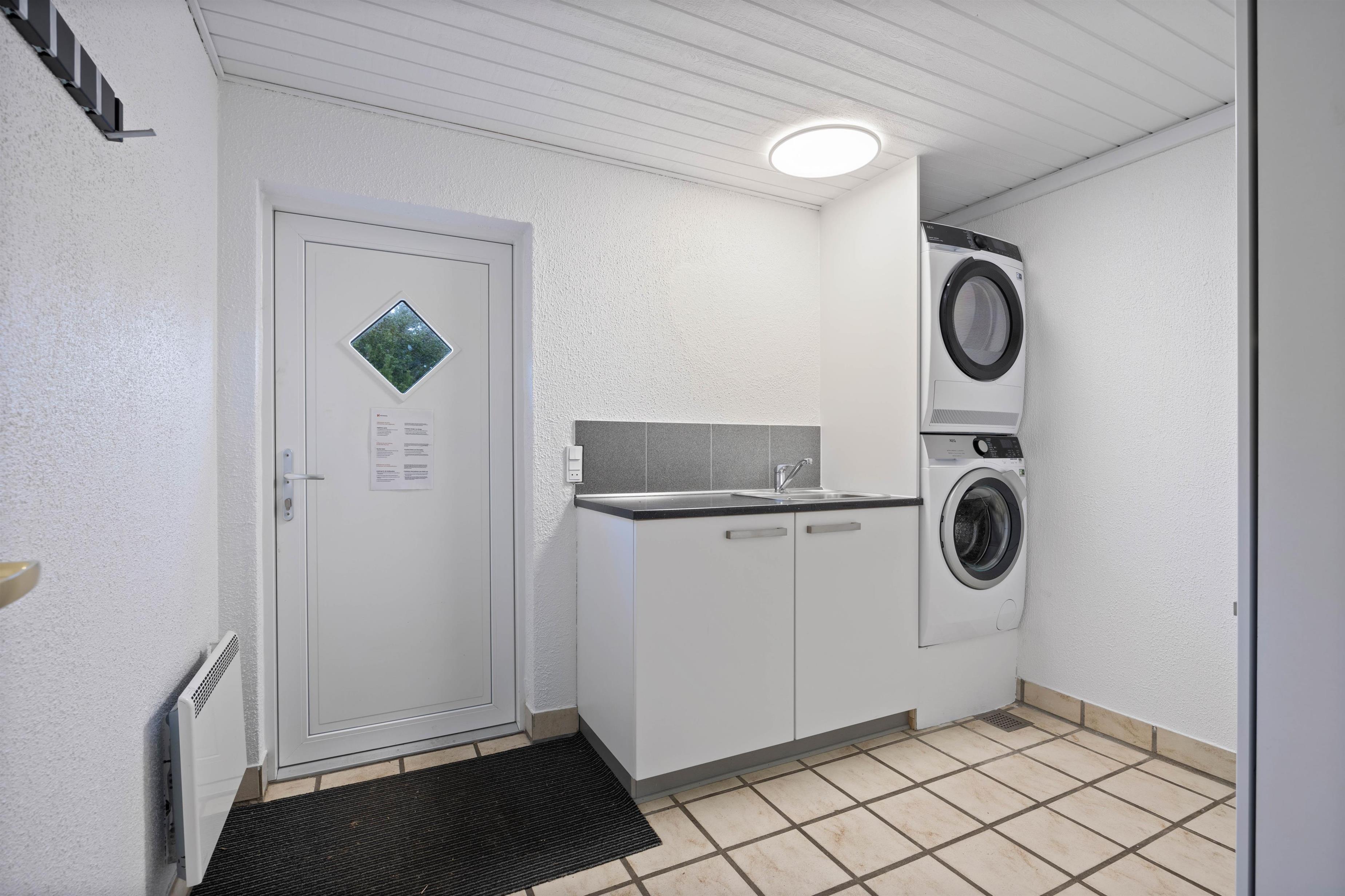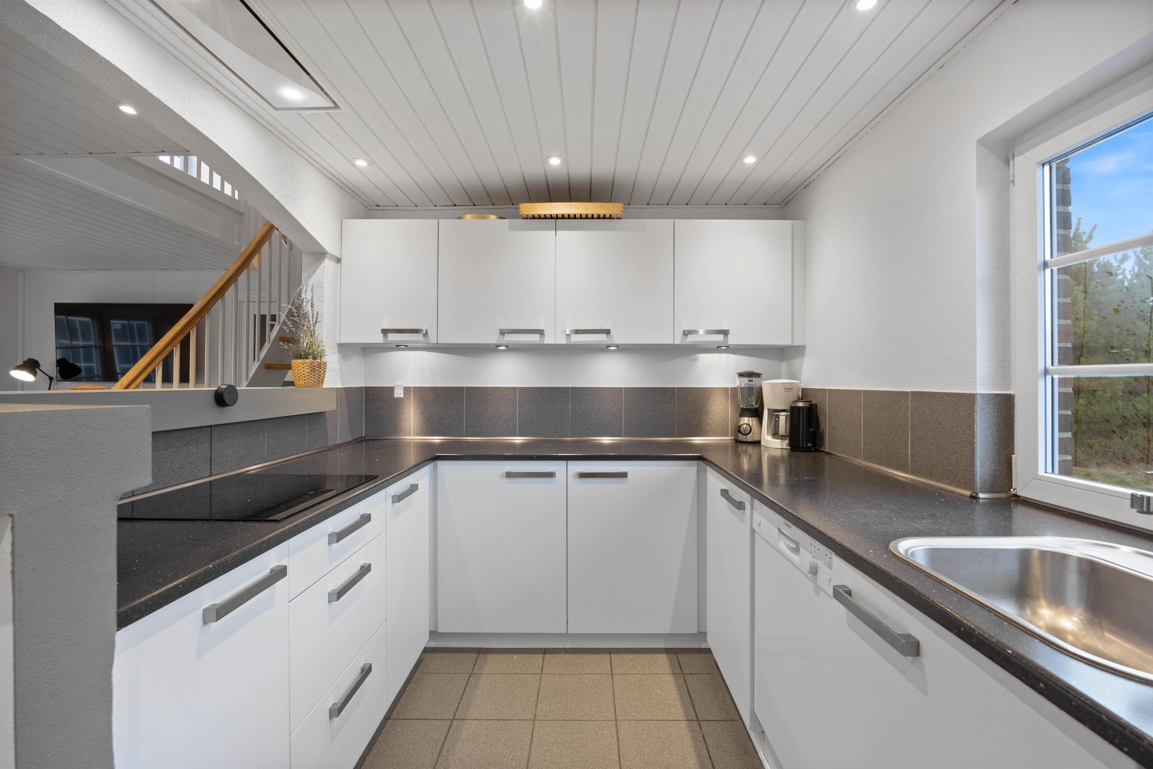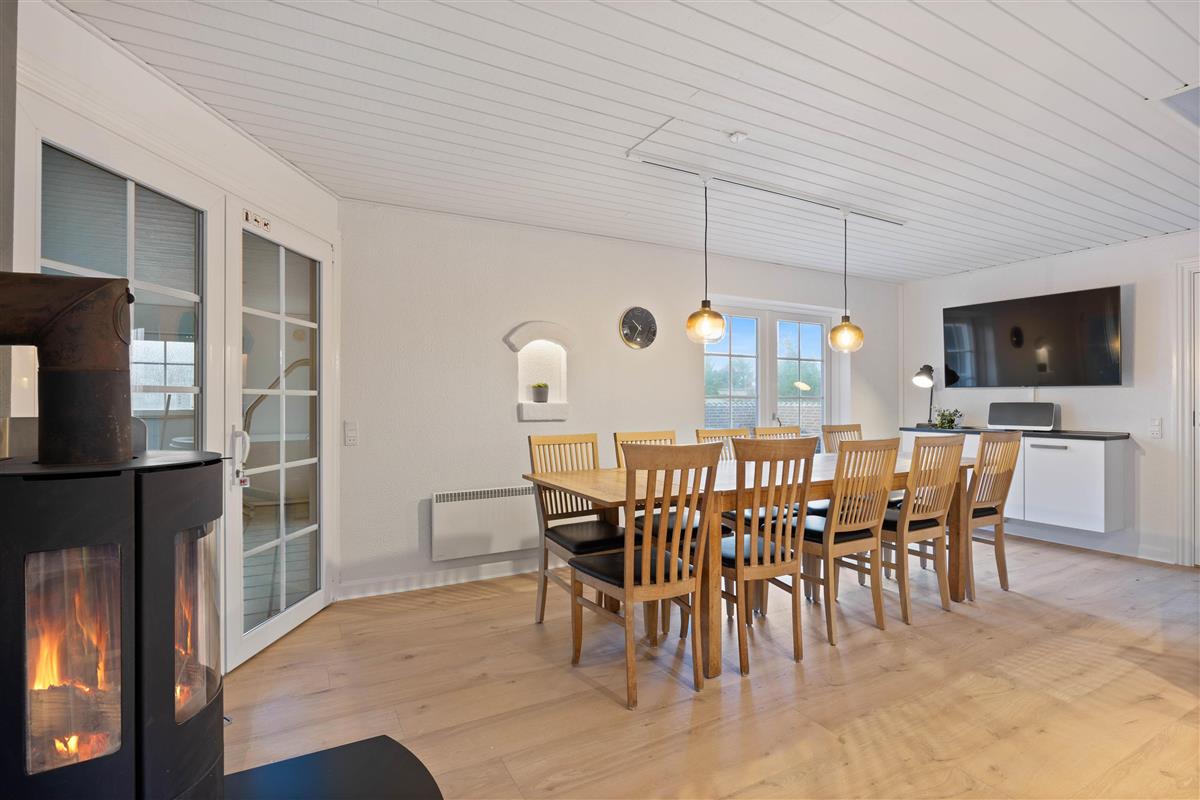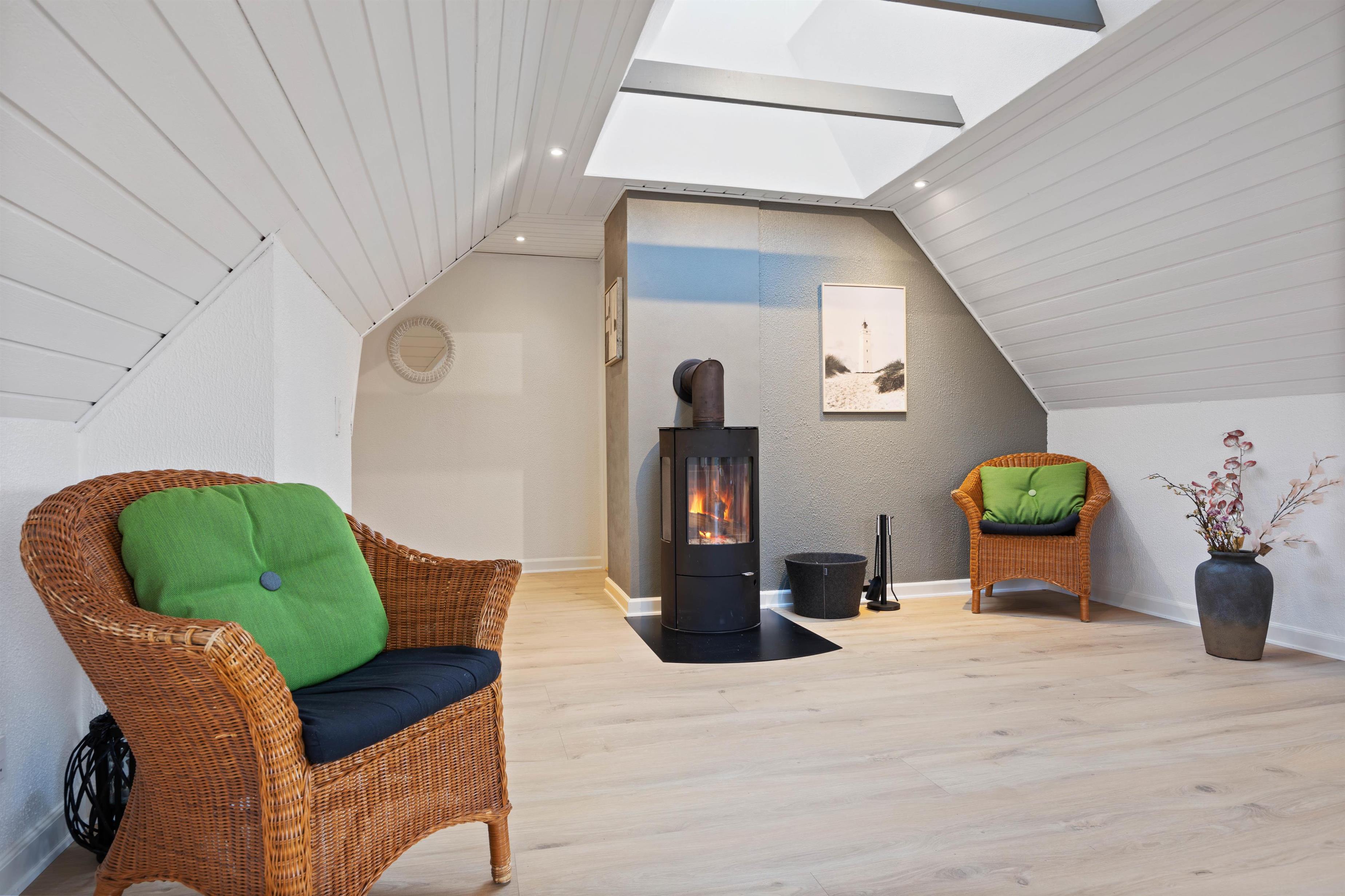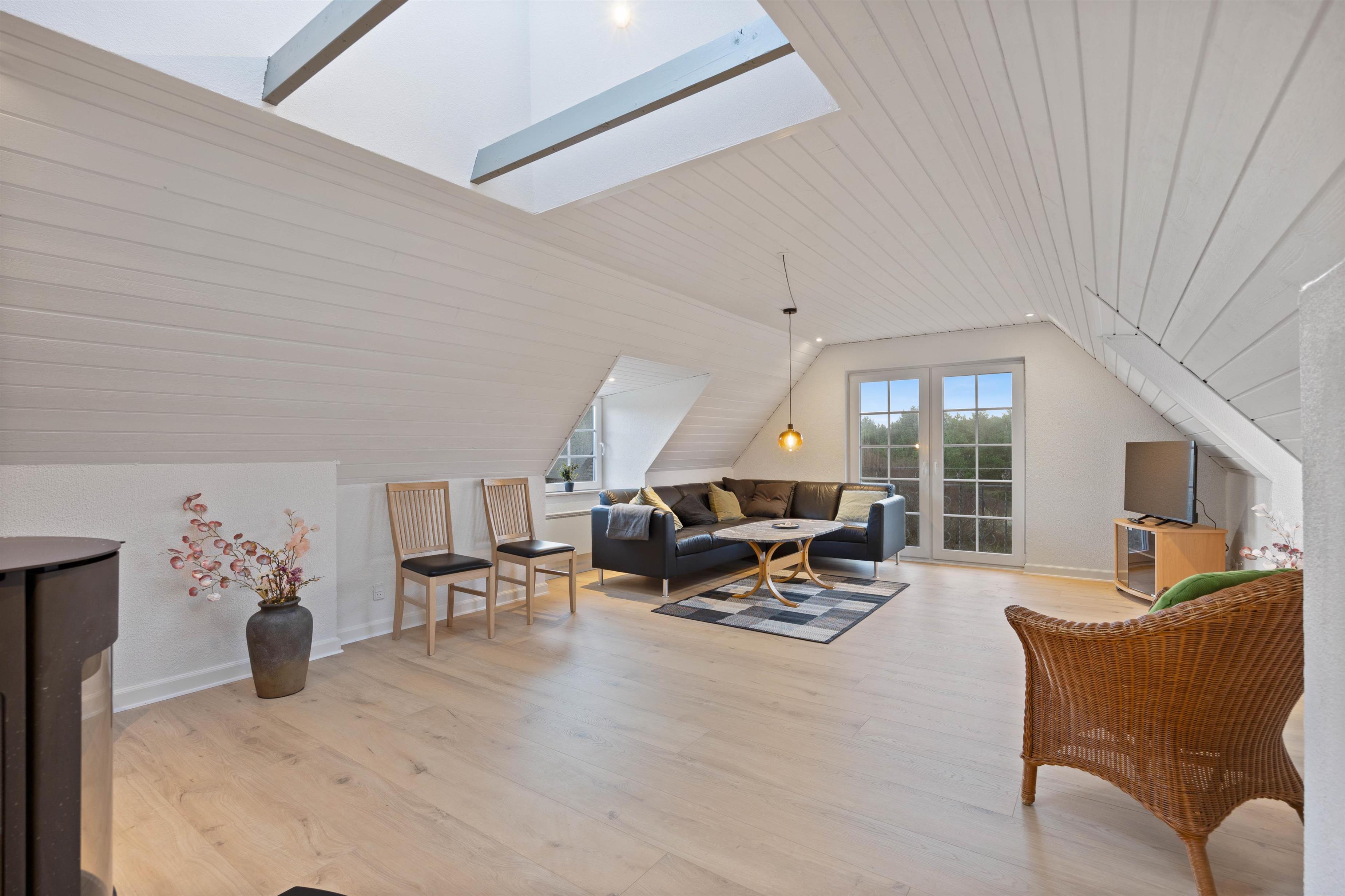 The ground floor features a large living area with an open-plan kitchen and direct access to the terrace. Here, the whole family can dine together or gather cosily around the crackling wood-burning stove. The well-equipped kitchen makes meal preparation a pleasure, with a dishwasher taking care of the cleaning up. Modern conveniences including dishwasher, washing machine, tumble dryer and internet access come as standard in this holiday home.