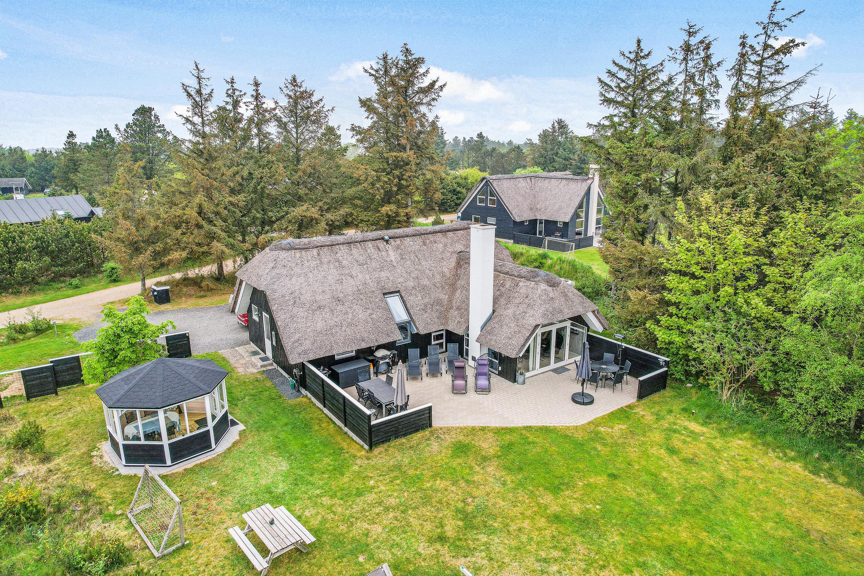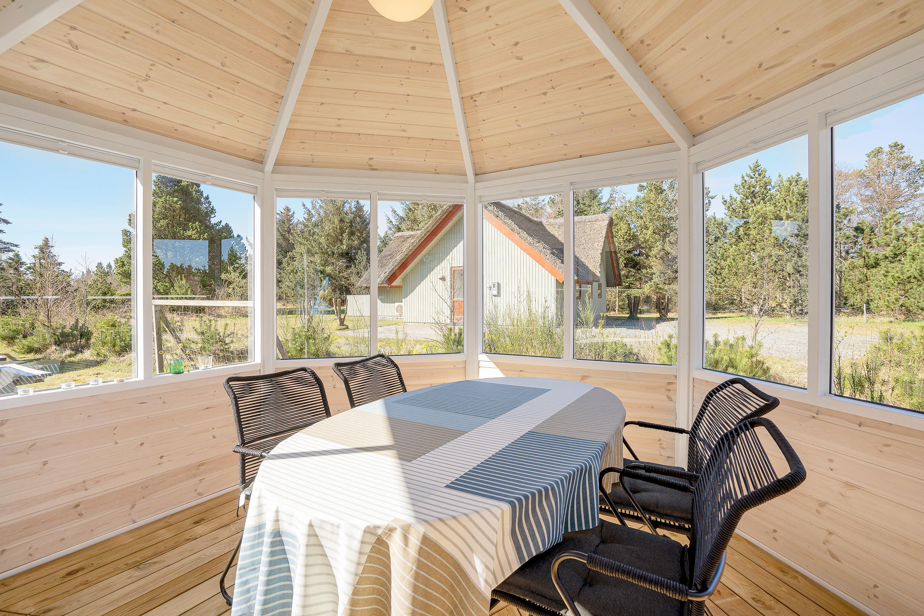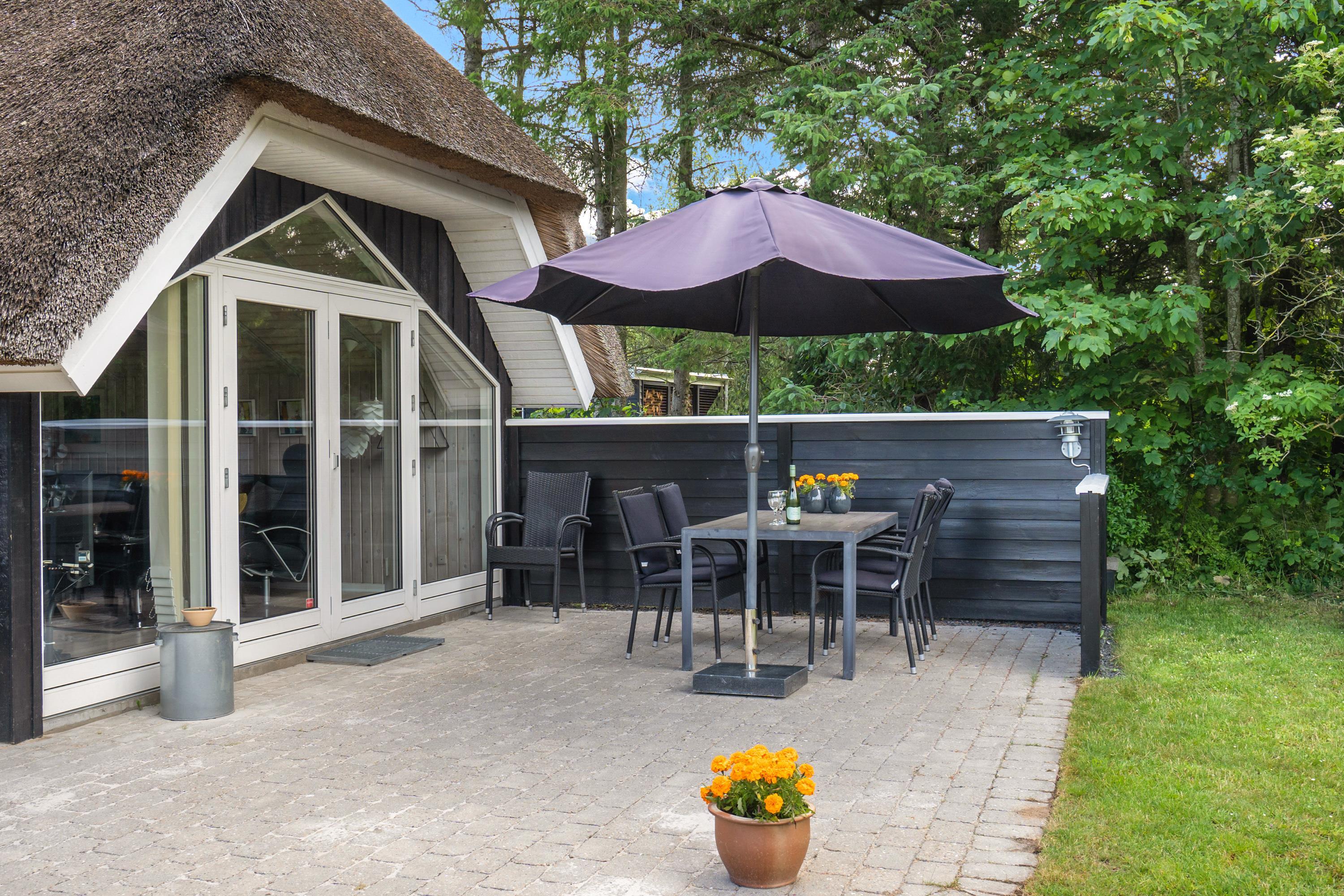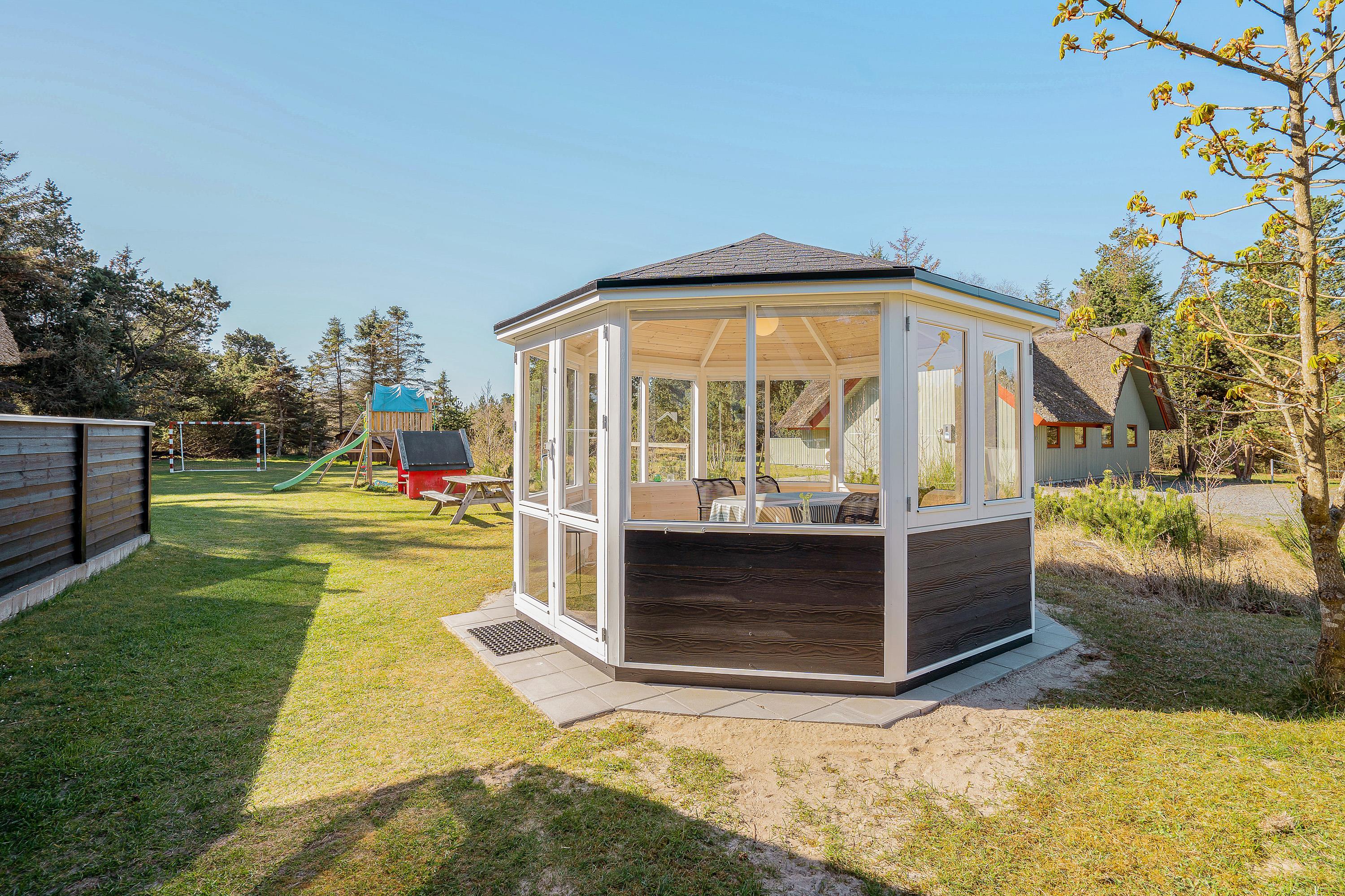 On the western side of the holiday home, there's a pavilion overlooking the garden and children's play areas. Garden furniture is provided here, creating a pleasant evening seating area.