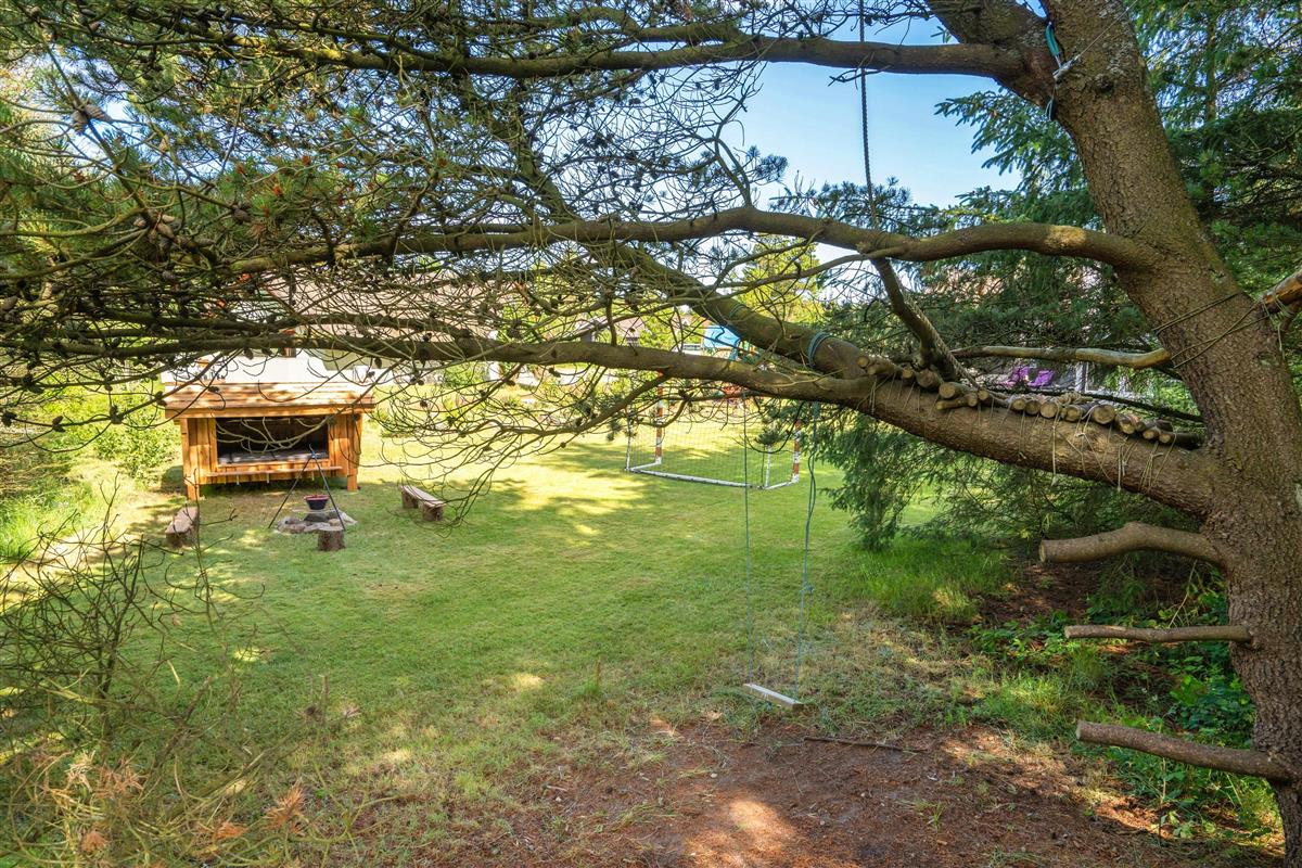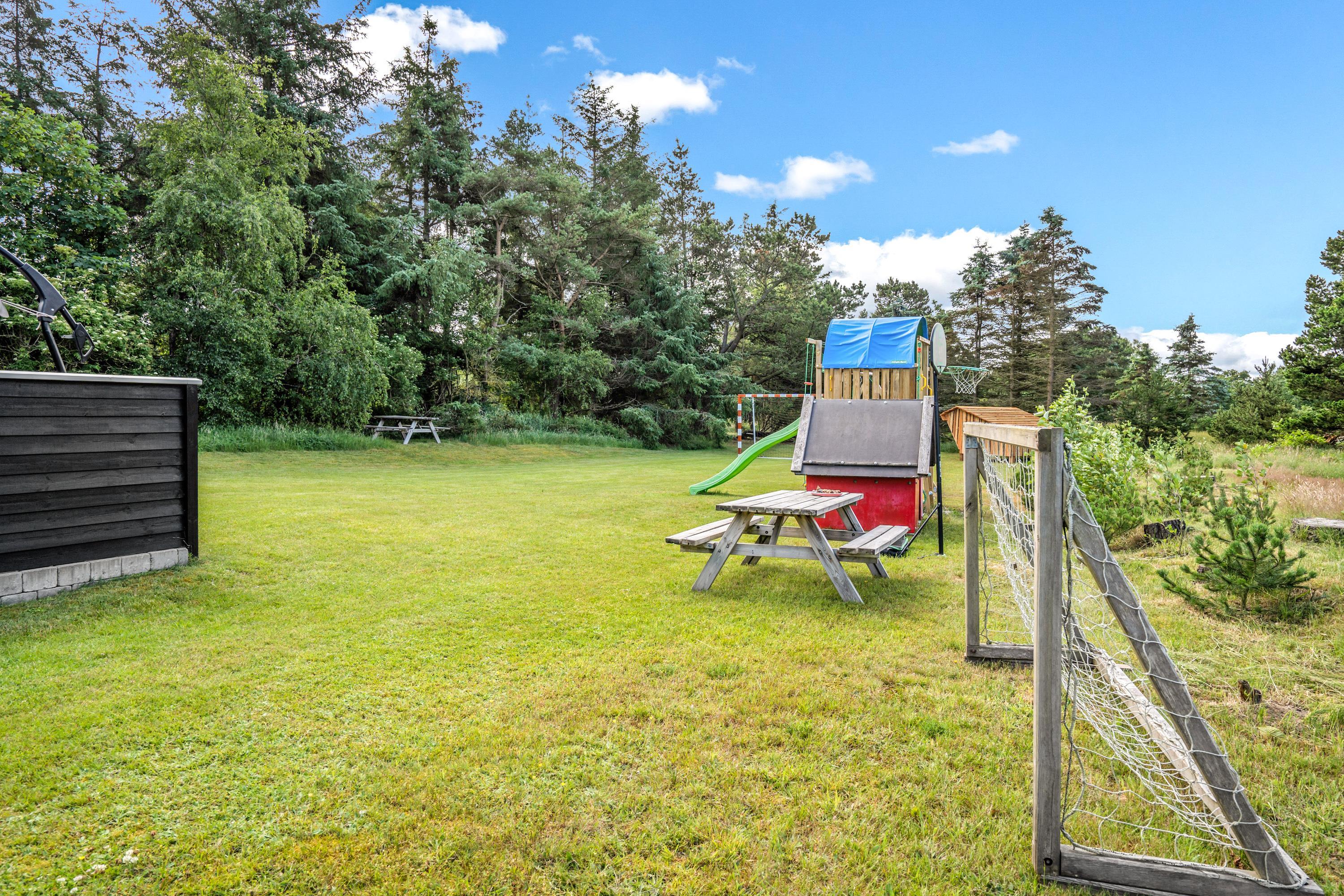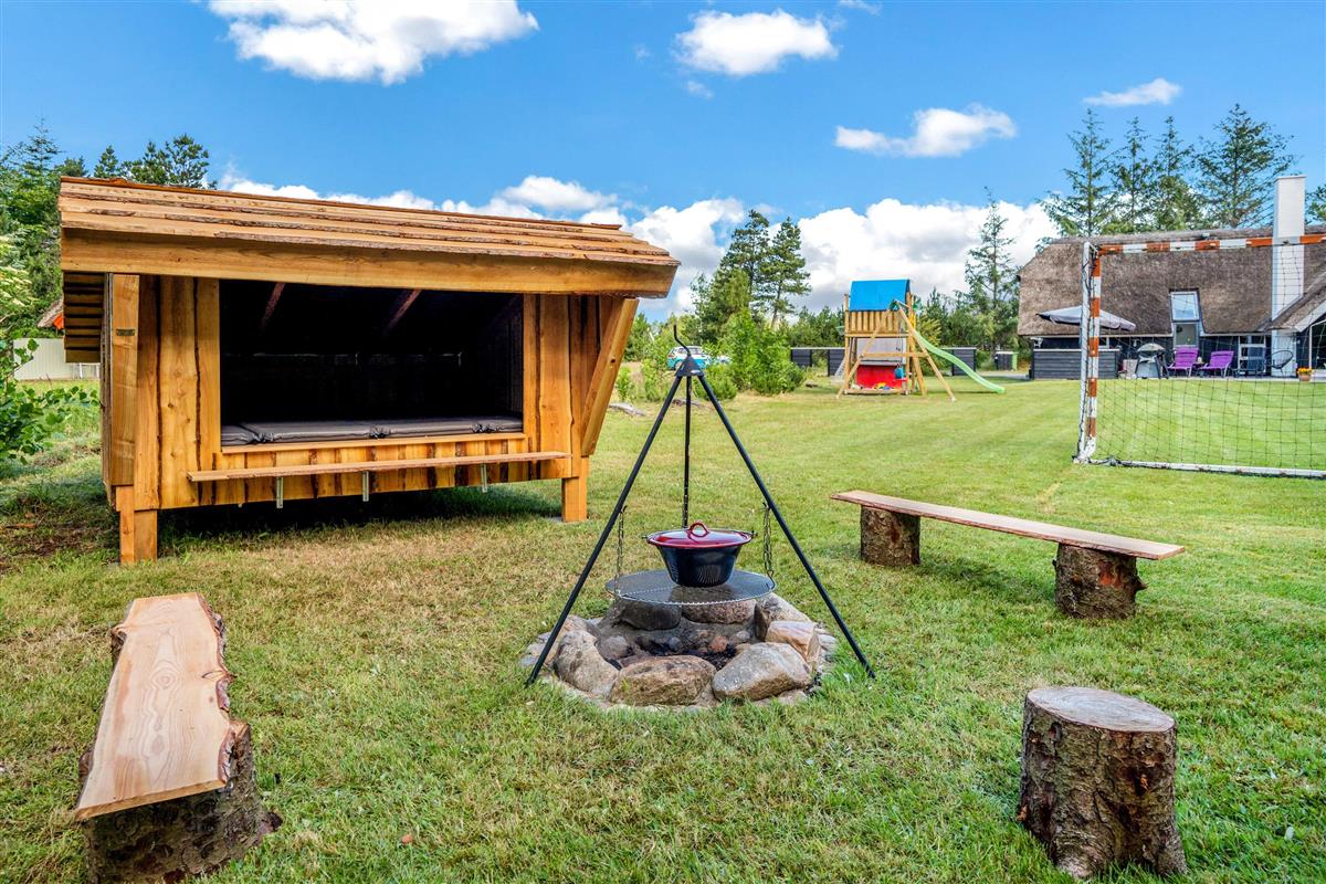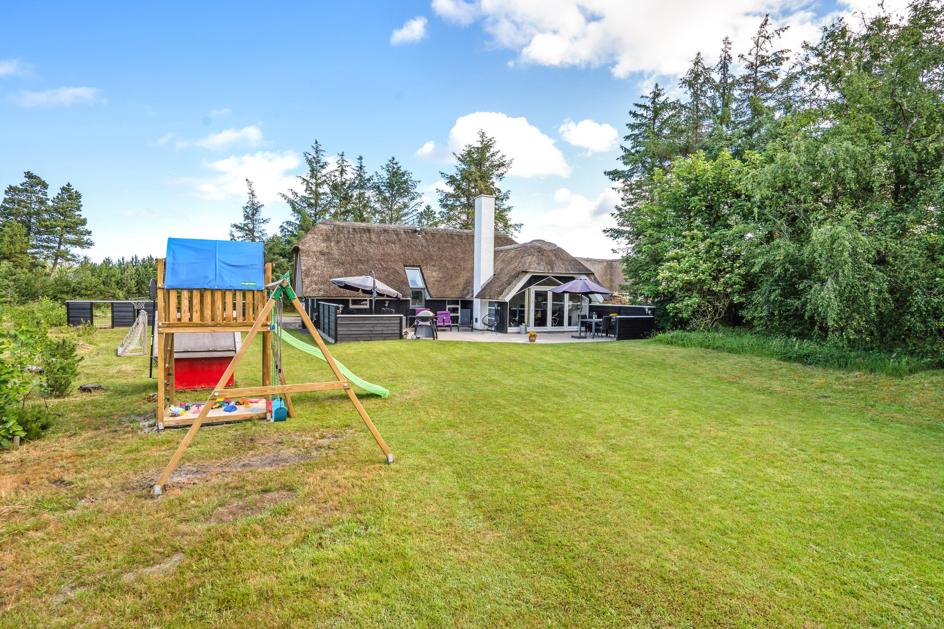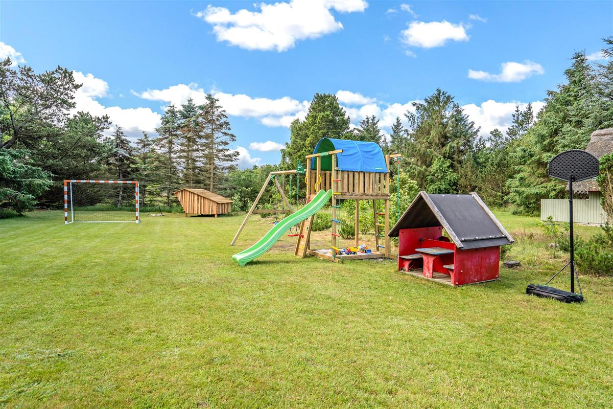 The extensive outdoor area is truly impressive. Not only does it offer quality garden furniture and a barbecue, but it's especially well-equipped for children. At Hestehaven 10, you'll find plenty of space, a climbing tower with slide, swings, a sandpit, room for ball games, a playhouse, and even a shelter where the more adventurous can sleep outdoors. Both your children and dogs can enjoy the abundant space and play facilities while you relax on the sheltered terrace.
