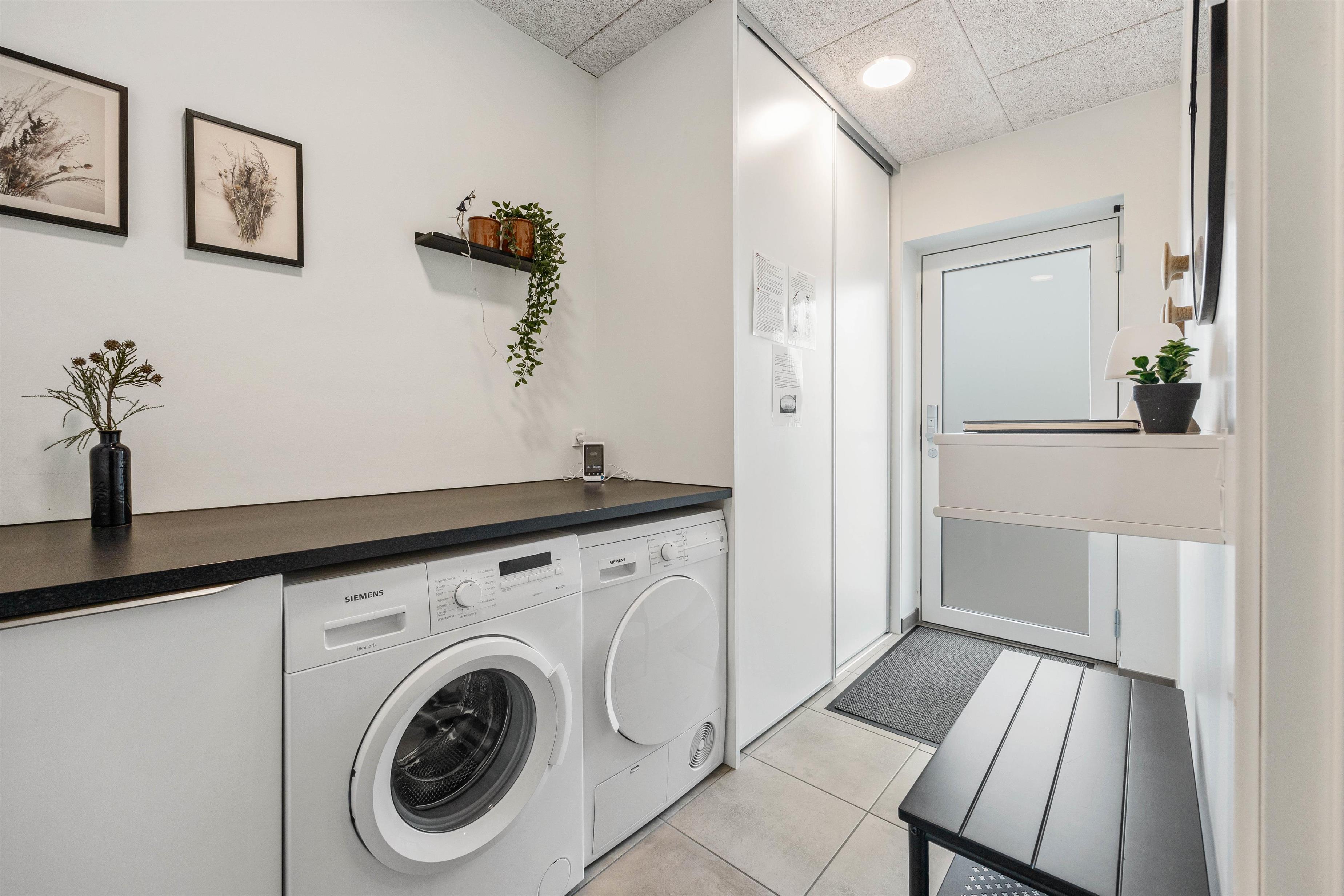 During cooler seasons, the house is heated by an energy-efficient heat pump. A dishwasher, washing machine and tumble dryer are also provided.