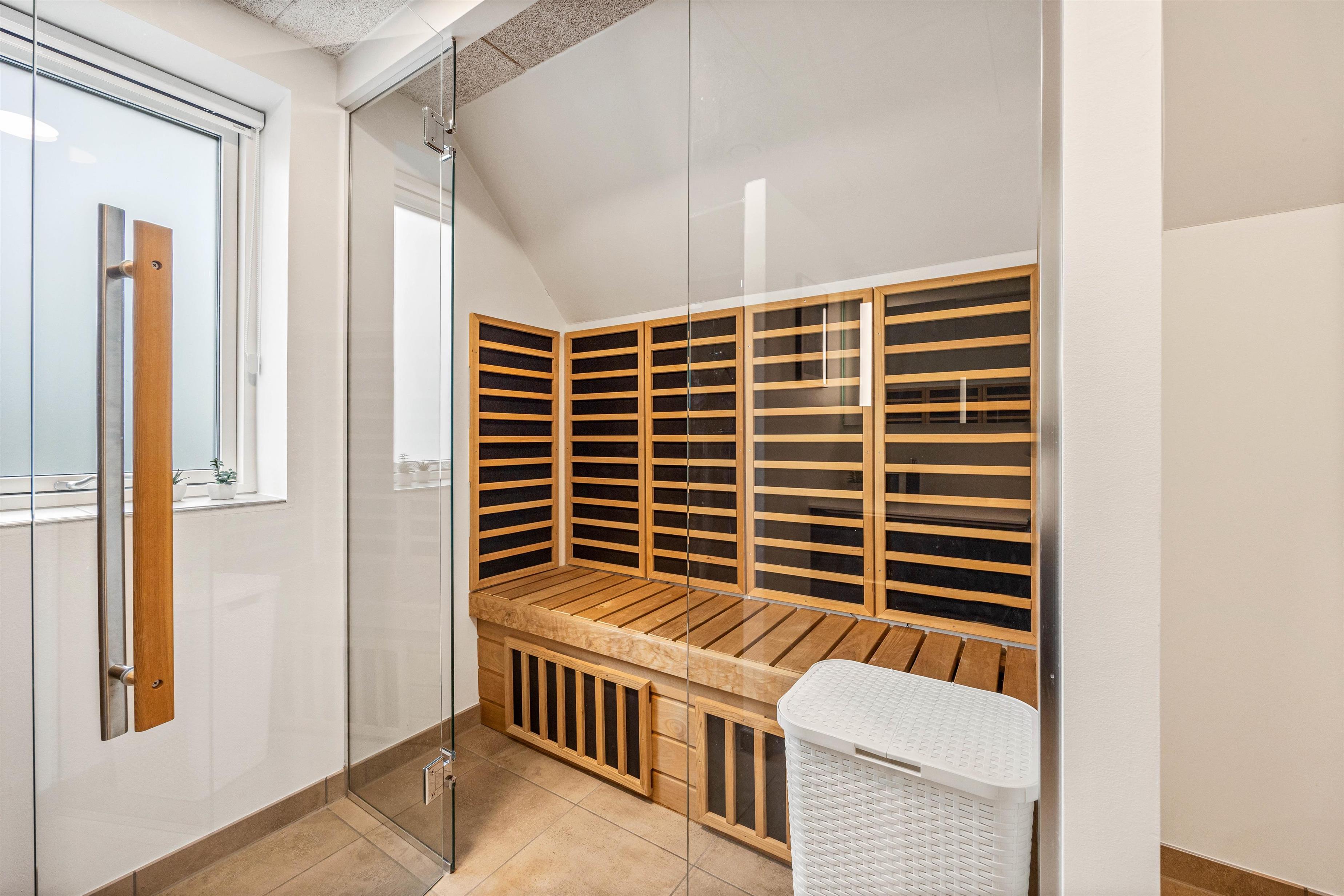 Stylish, bright interior with infrared sauna in bathroom