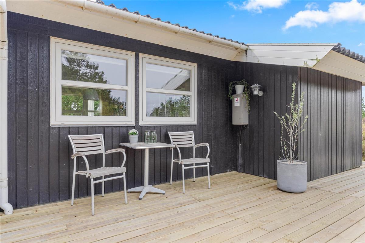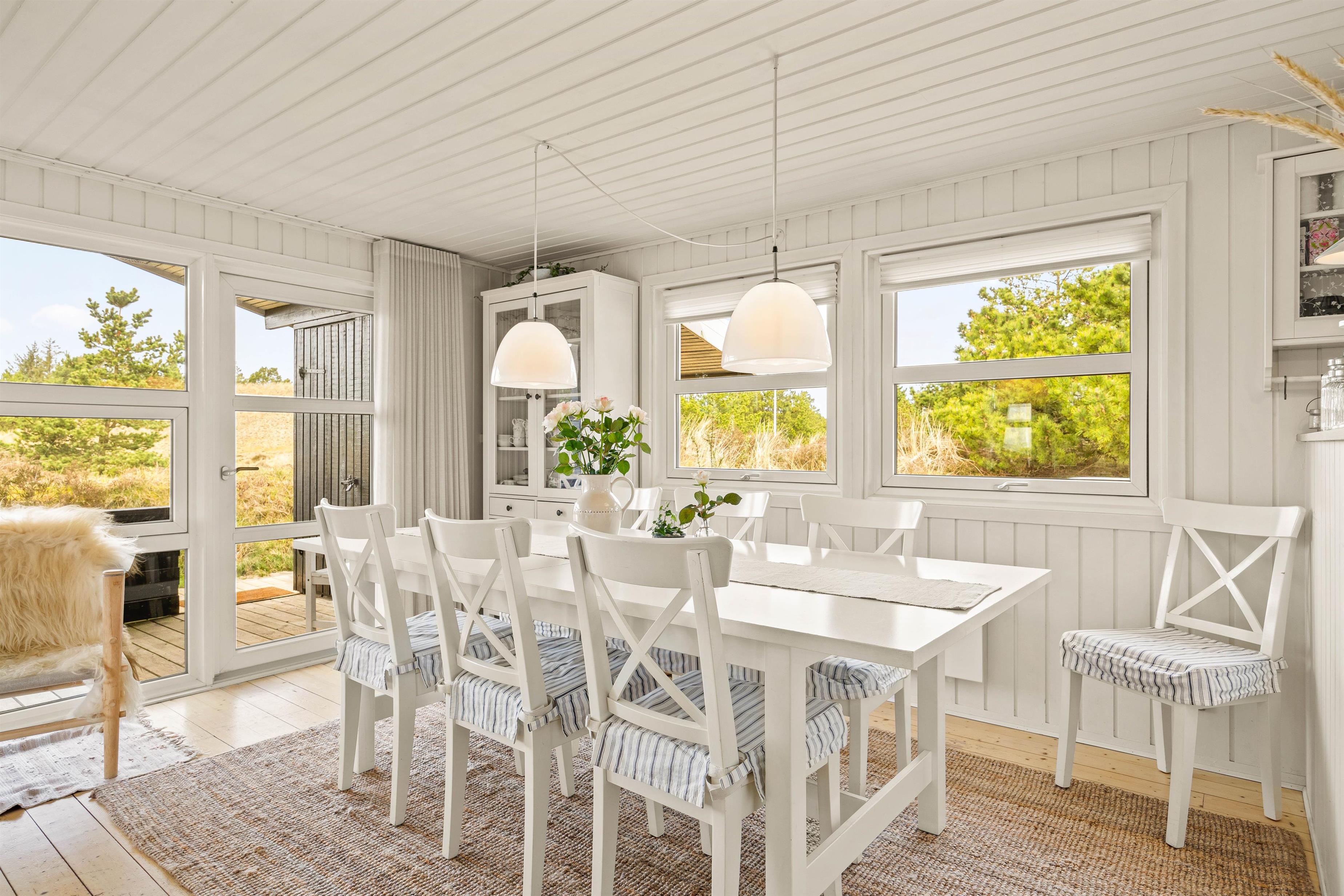 As soon as you enter this beautiful holiday home, you'll feel its cosy atmosphere and your holiday can begin. The heart of the summer house is the open-plan living area, with its light flooring and white walls creating an inviting space for relaxation. The kitchen flows seamlessly into the dining area and living room, perfect for spending quality family time together. Large windows flood the space with natural light, while the warmth from the wood-burning stove adds extra comfort.