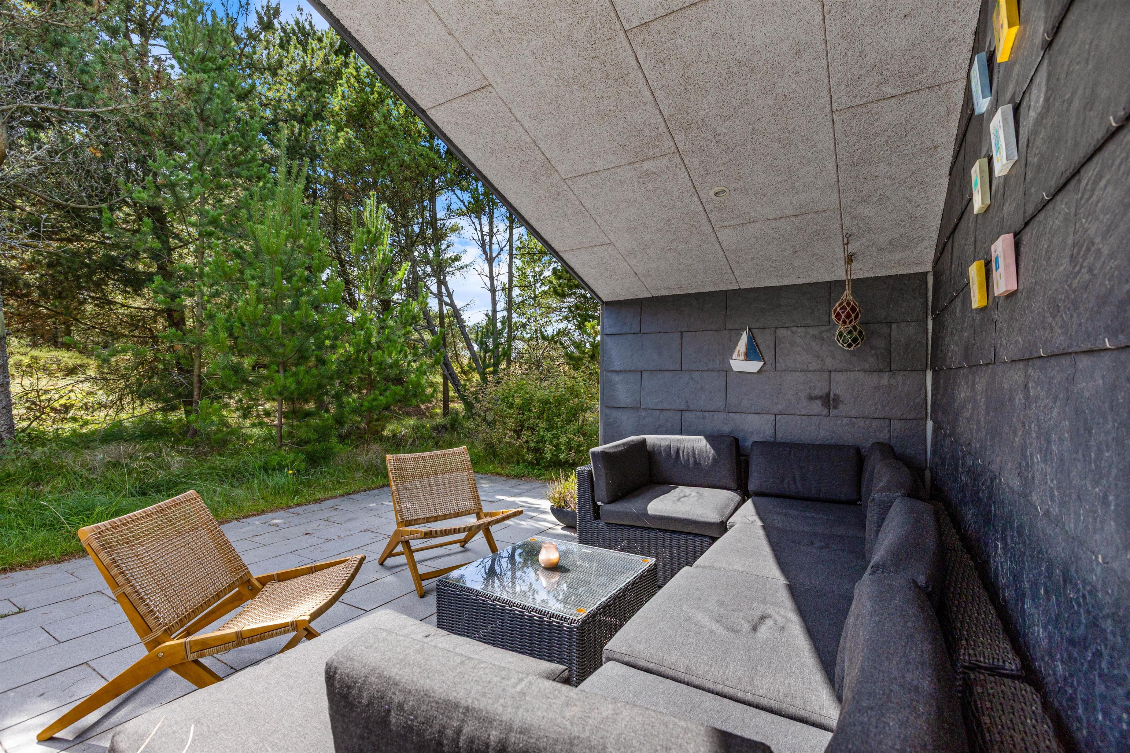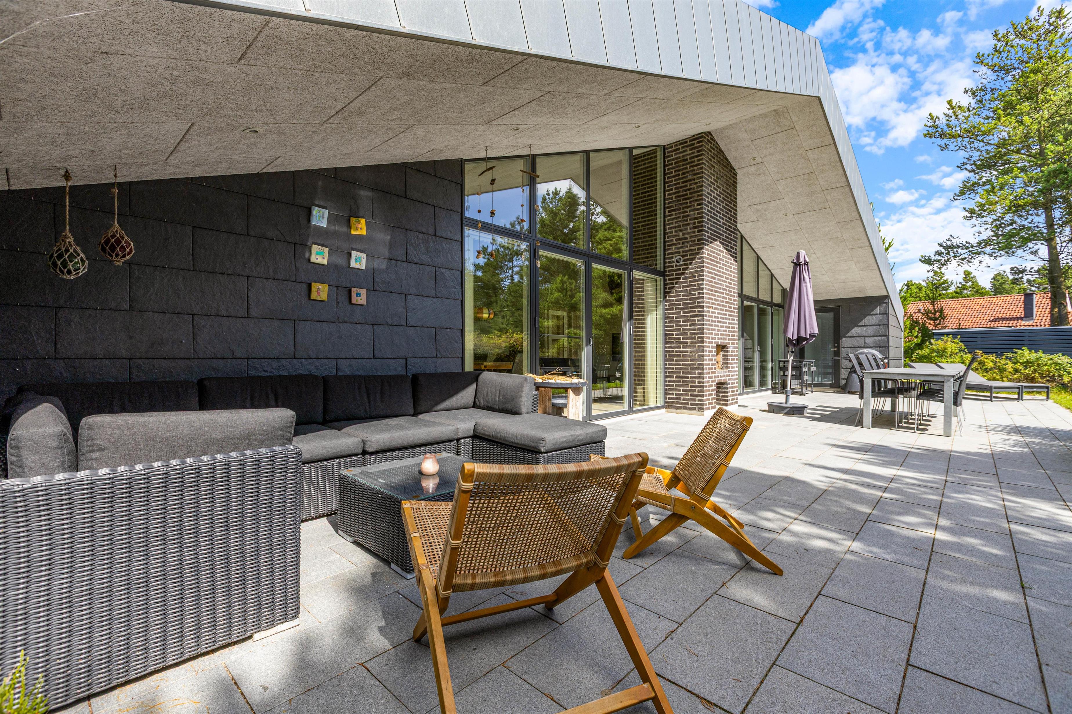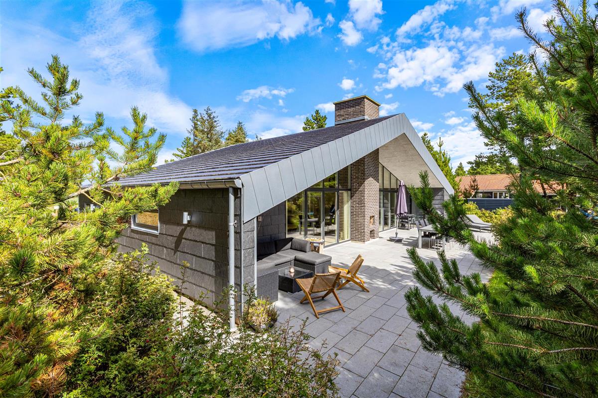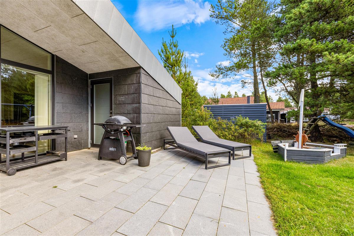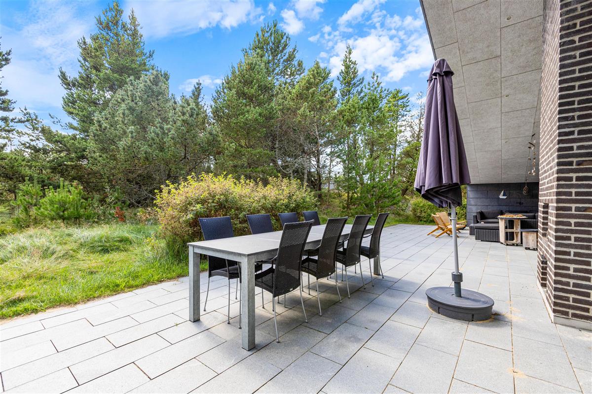 The plot, surrounded by tall trees, sits in the heart of Blåvand's heather-covered landscape. On the terrace, furnished with high-quality, comfortable garden furniture, you can enjoy the sun and fresh North Sea air in complete privacy.
