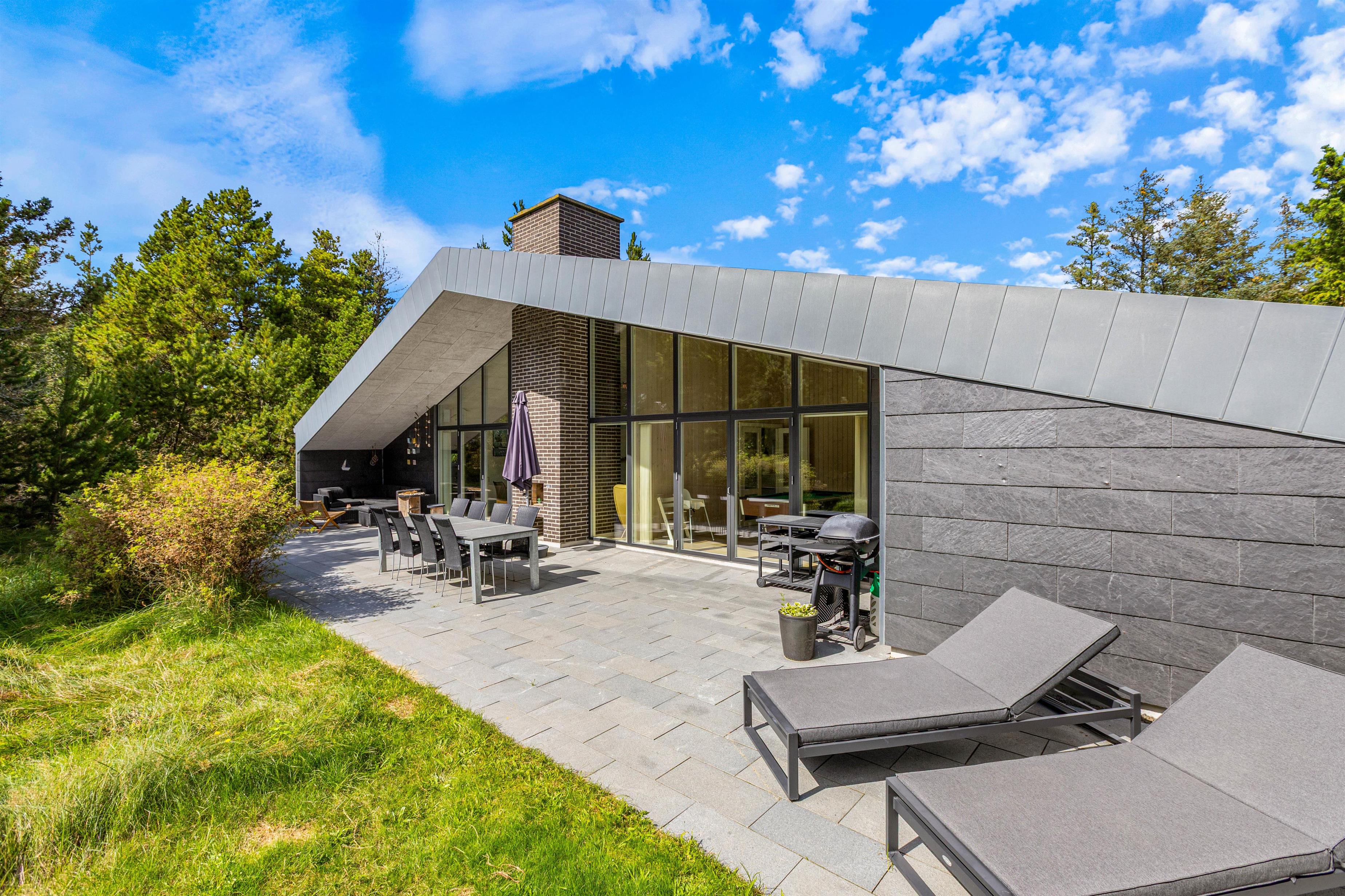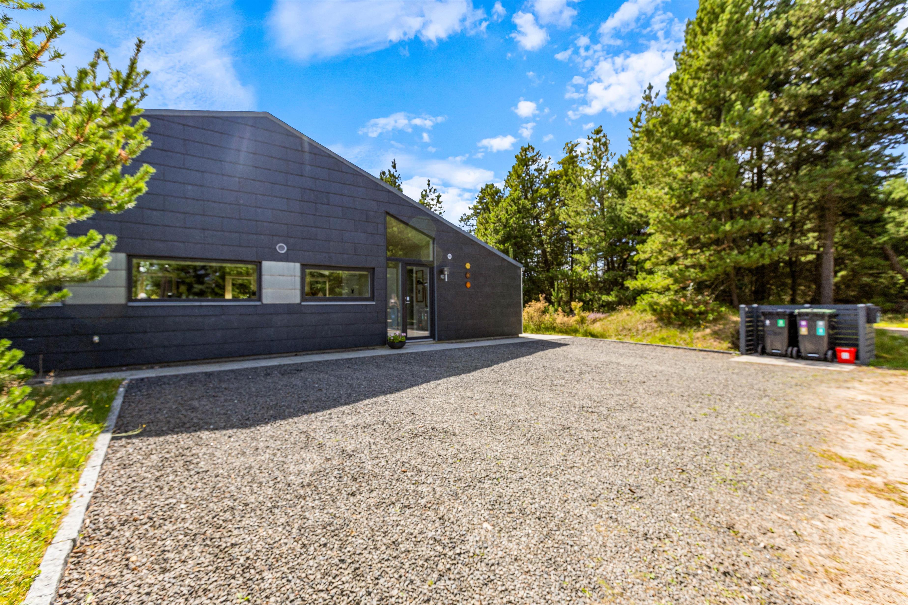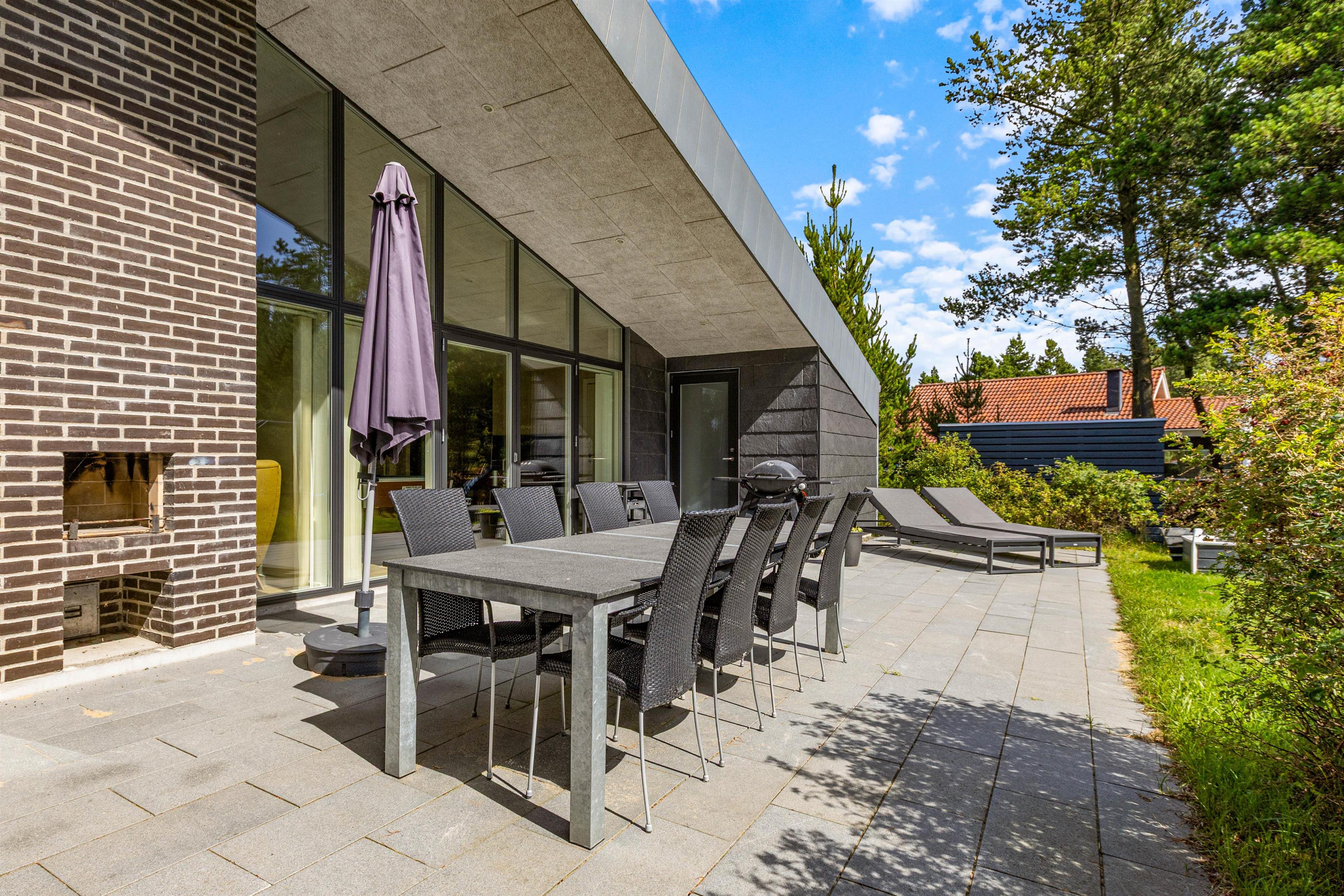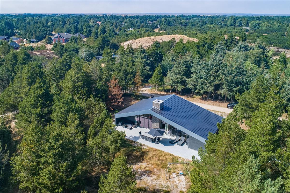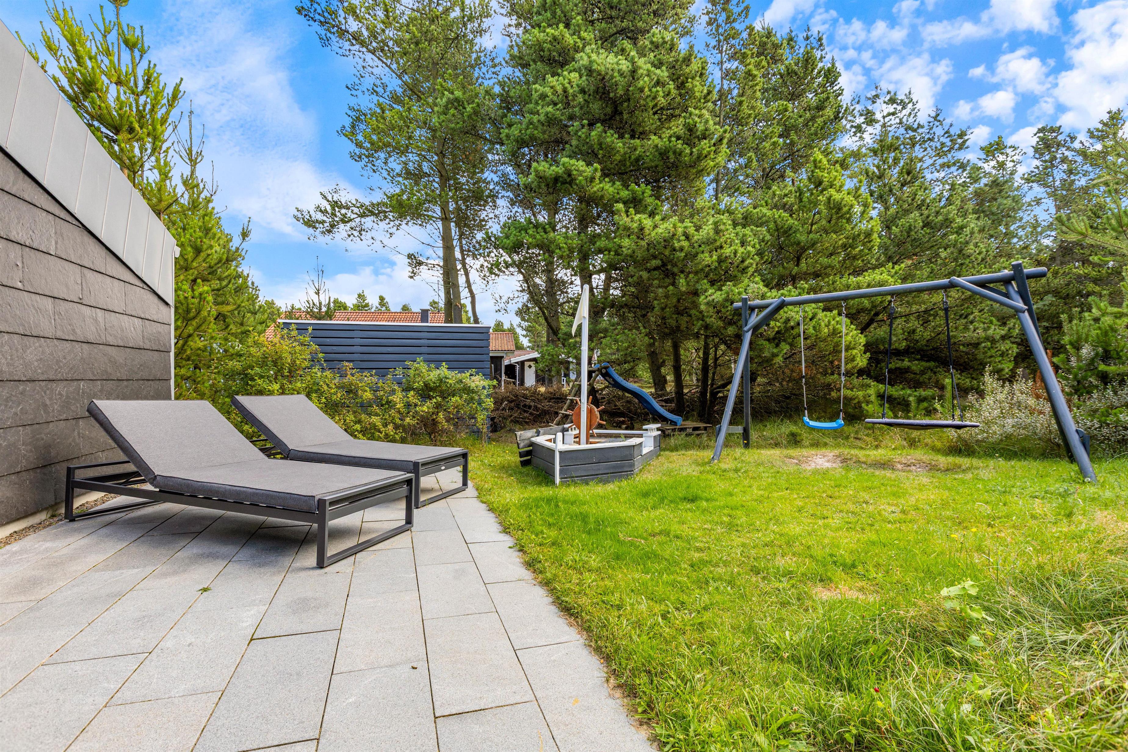 The plot, surrounded by tall trees, sits in the heart of Blåvand's heather-covered landscape. On the terrace, furnished with high-quality, comfortable garden furniture, you can enjoy the sun and fresh North Sea air in complete privacy.