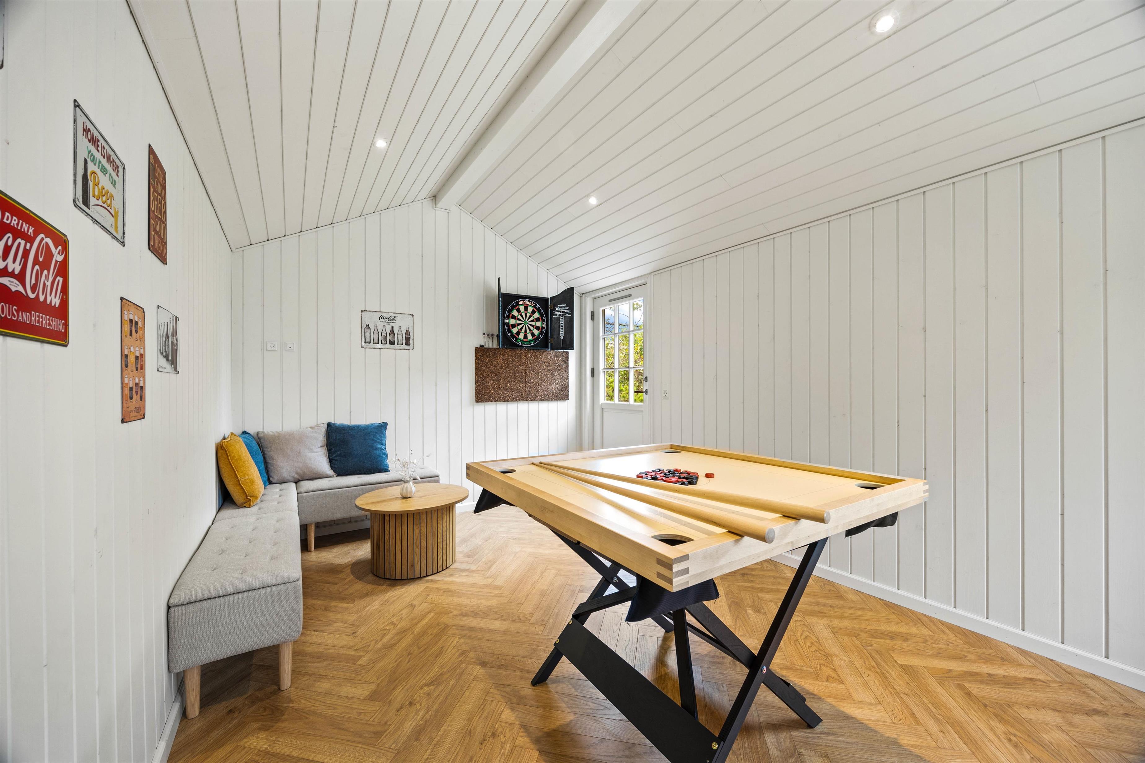 In the evening, settle into the comfortable sofas with a glass of wine or watch a film together while the wood crackles in the wood-burning stove, providing gentle warmth. An energy-efficient heat pump is also available for additional heating.