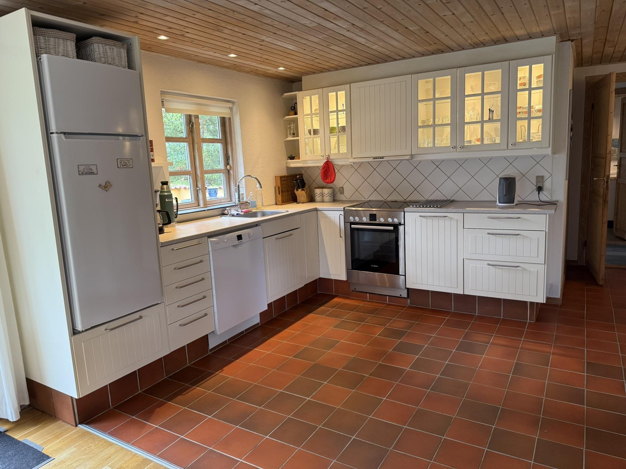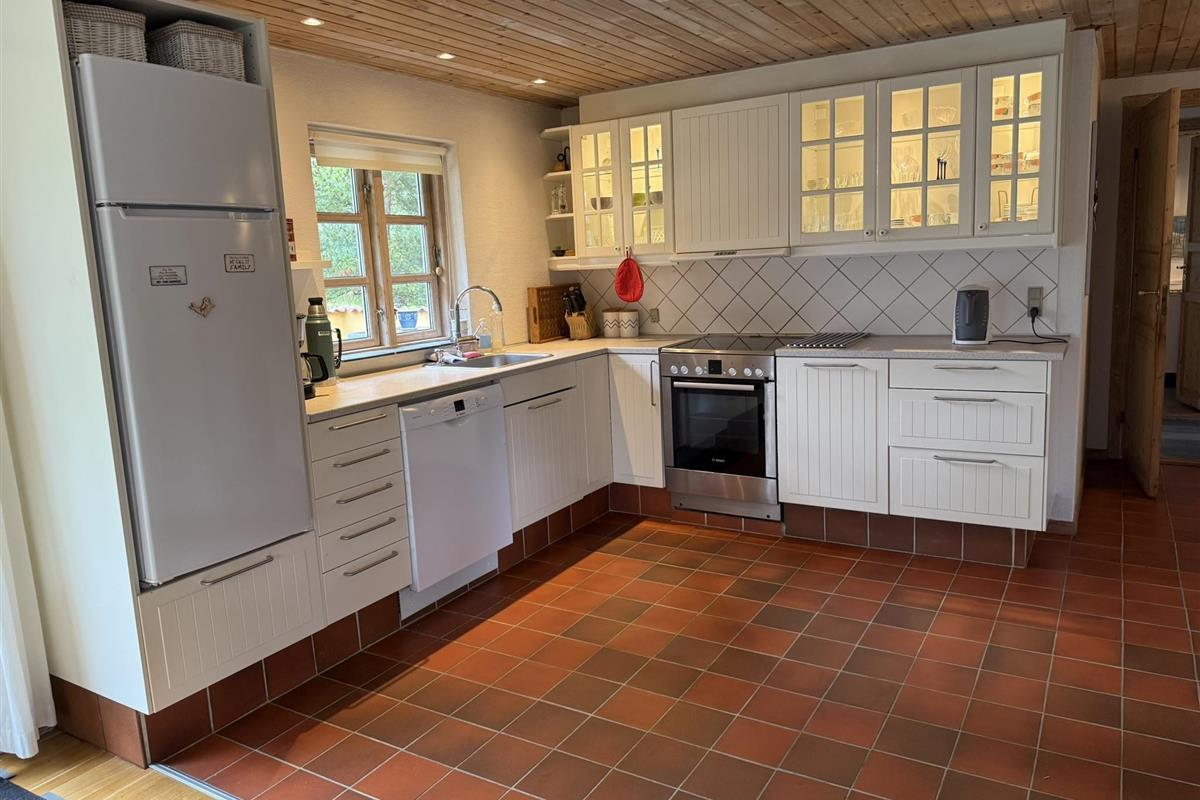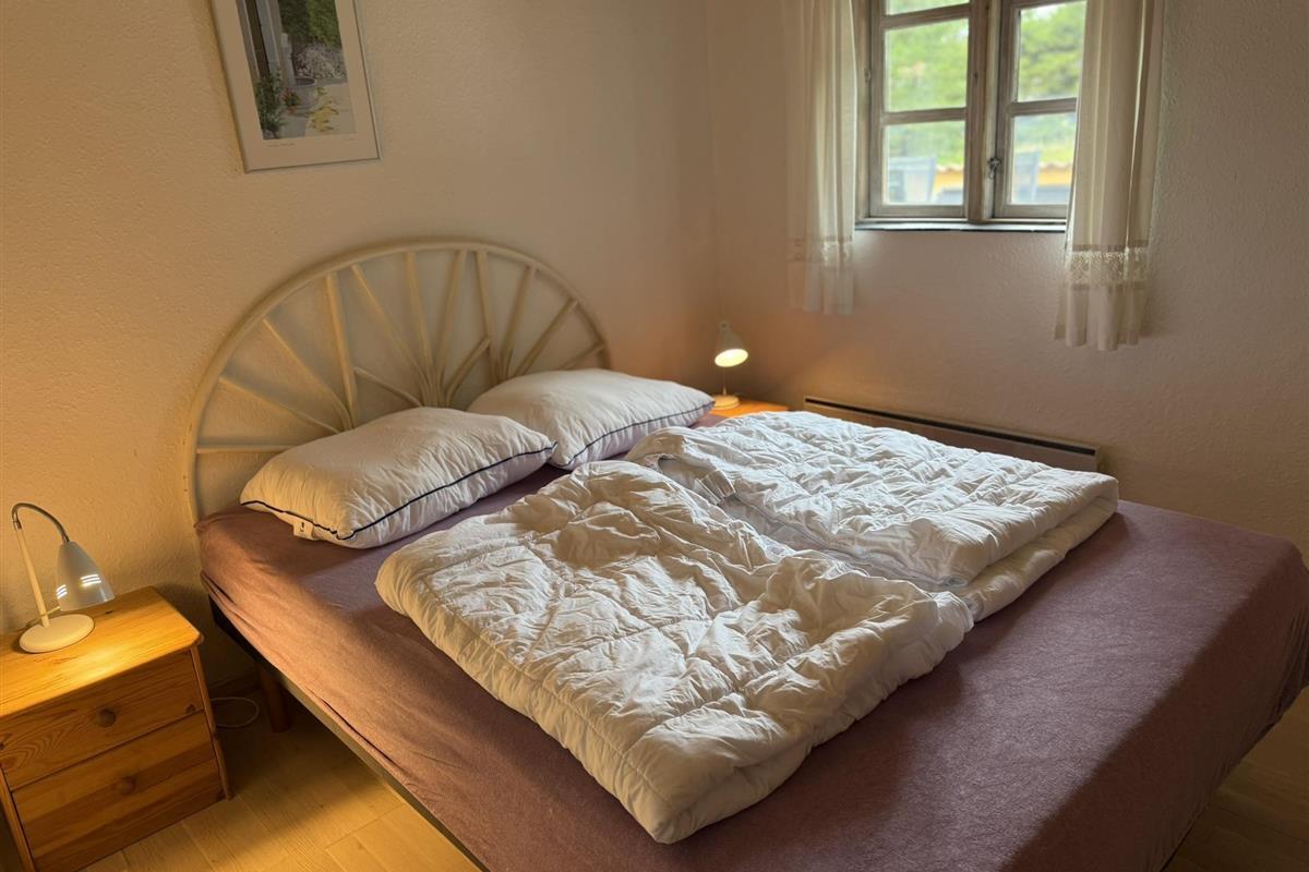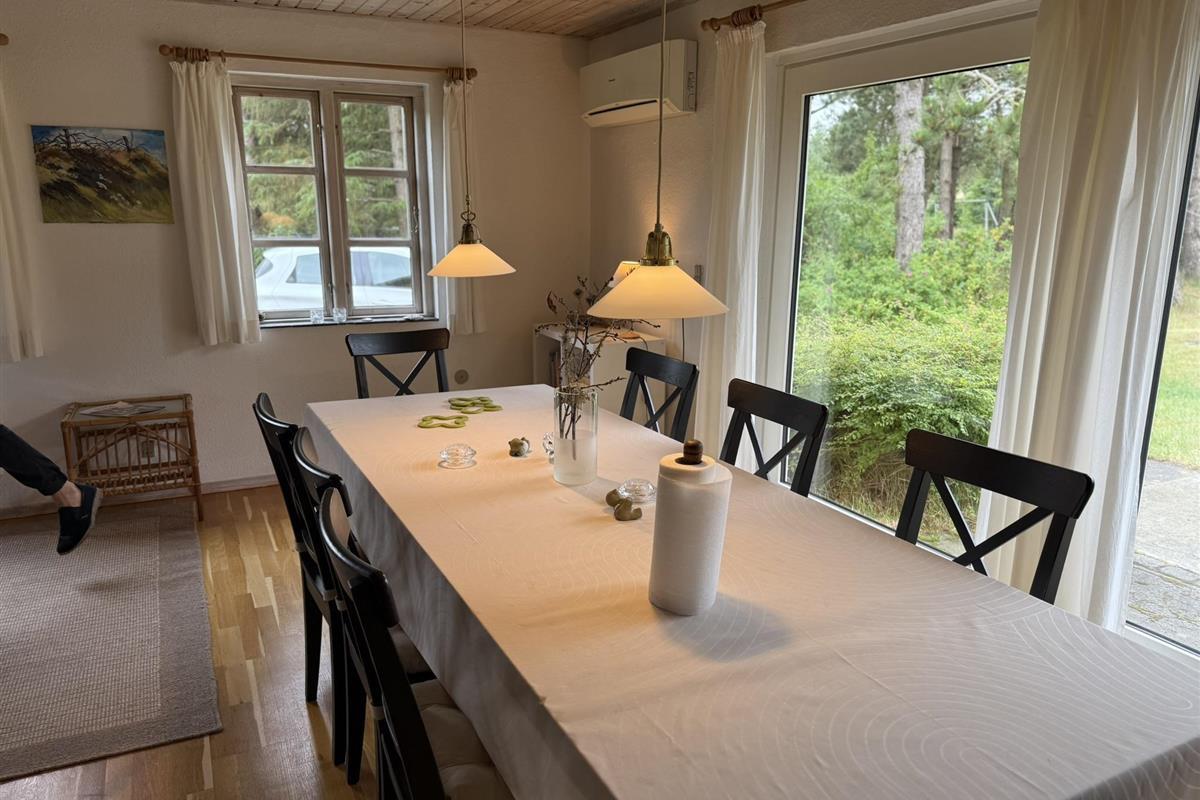 Das Haus ist 1994 gebaut mit gestrichene Wände und hell gebeizte Holzdecken. Teils Teppich-, teils Klinkerboden. Das Wohnzimmer in Winkelausführung mit Kücke gemütlich eingerichtet. 3 Schlafzimmer, 2 mit Doppelbett und 1 mit 2 Etagenbetten. Es hat 2 Badezimmern das eine mit Whirlpool.