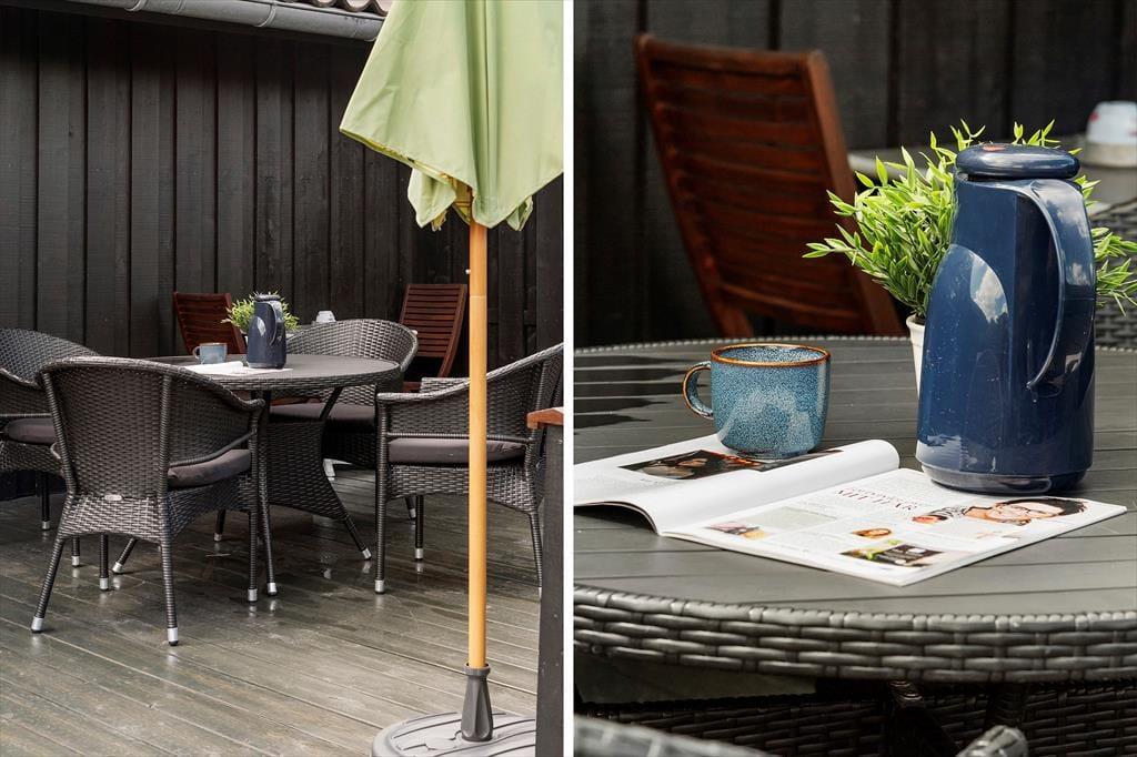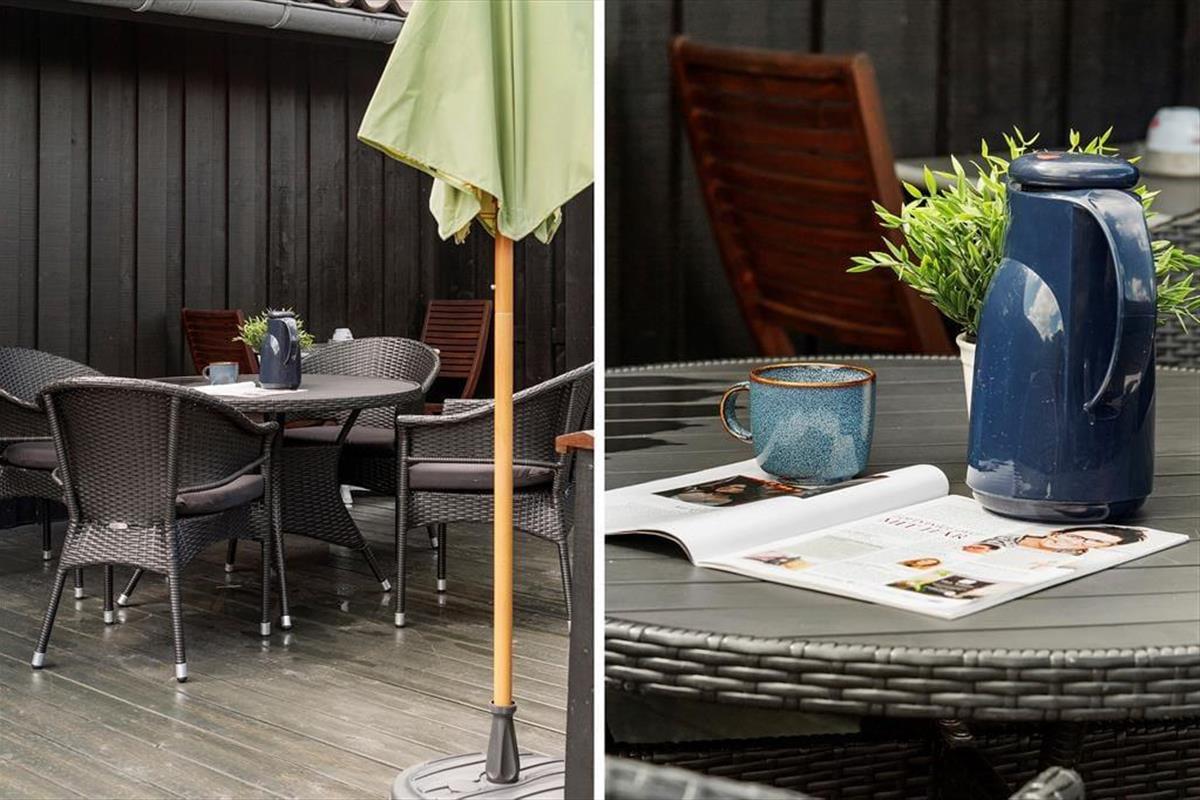 Draußen erwartet euch ein schöner, kinderfreundlicher Garten, in dem die Kleinen sich auf dem Rasen austoben können, während die Erwachsenen eine entspannte Zeit in den Gartenmöbeln genießen können. Hier gibt es reichlich Platz zum Spielen und für Aktivitäten, und der Garten lädt zu sonnigen Tagen mit Ballspielen, Spaß im Sandkasten und gemütlichen Grillabenden auf der Terrasse ein. Vom Aufenthaltsraum habt ihr direkten Zugang zur großen Terrasse, wo ihr eure Mahlzeiten unter freiem Himmel genießen könnt, während ihr den herrlichen Blick auf den Garten genießt. Abends könnt ihr den Grill anfeuern und ein Festmahl zubereiten, während die Kinder weiter im Garten spielen. Die Terrasse ist auch ein idealer Ort, um den Tag mit einer Tasse Kaffee zu beginnen, während ihr die Tagesaktivitäten in der ruhigen Umgebung plant. Für die Wasserratten gibt es eine Außendusche, wo ihr Sand und Salzwasser nach einem Tag am Strand abspülen könnt.