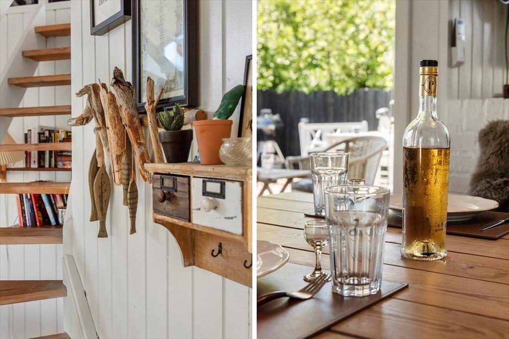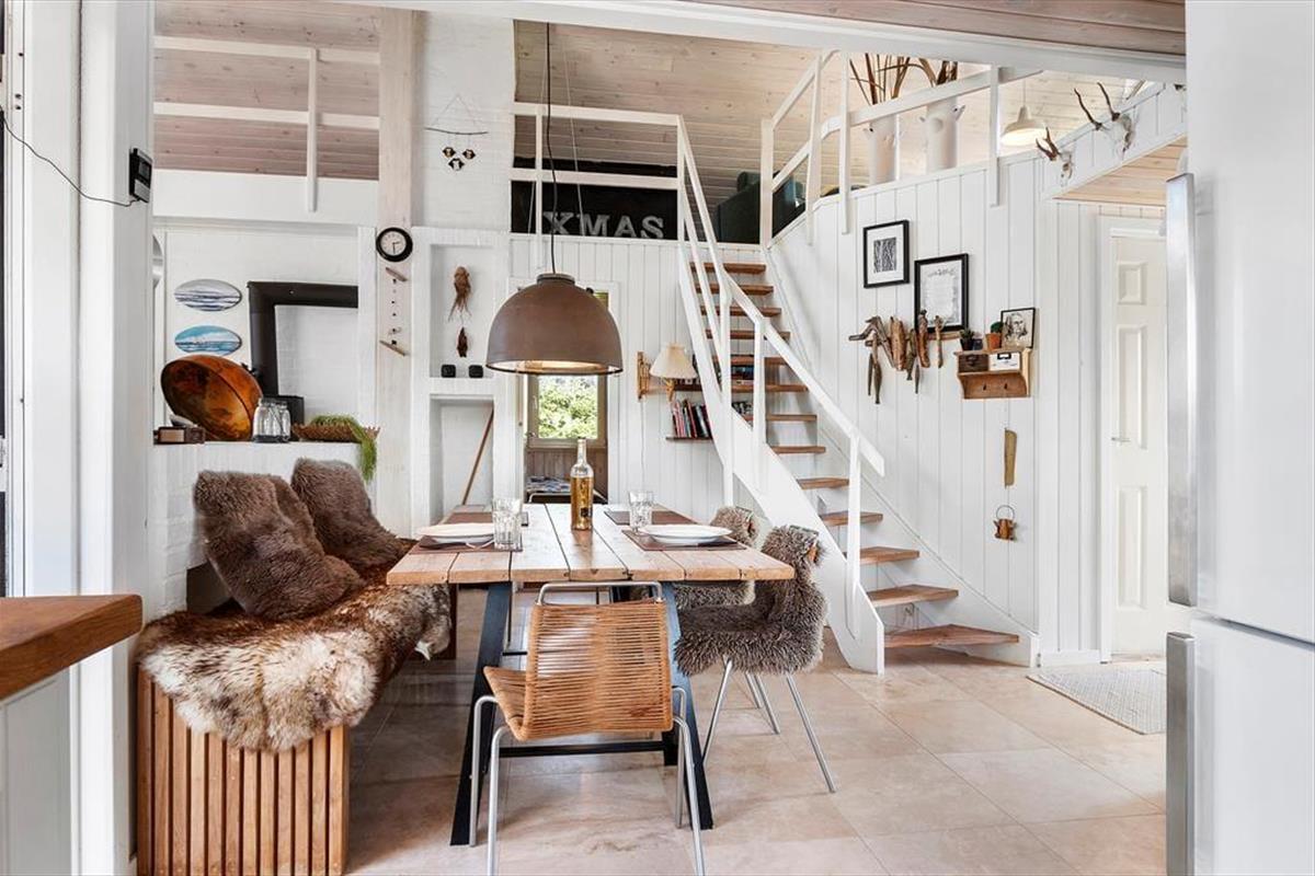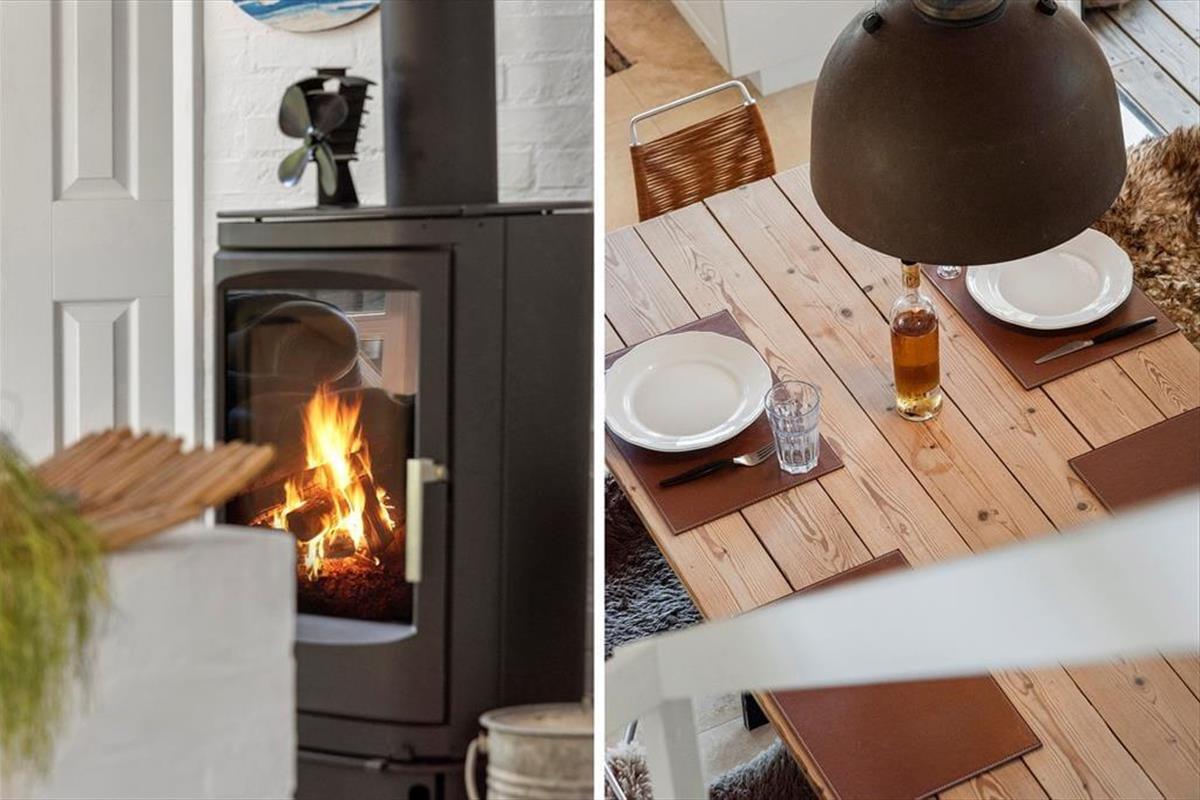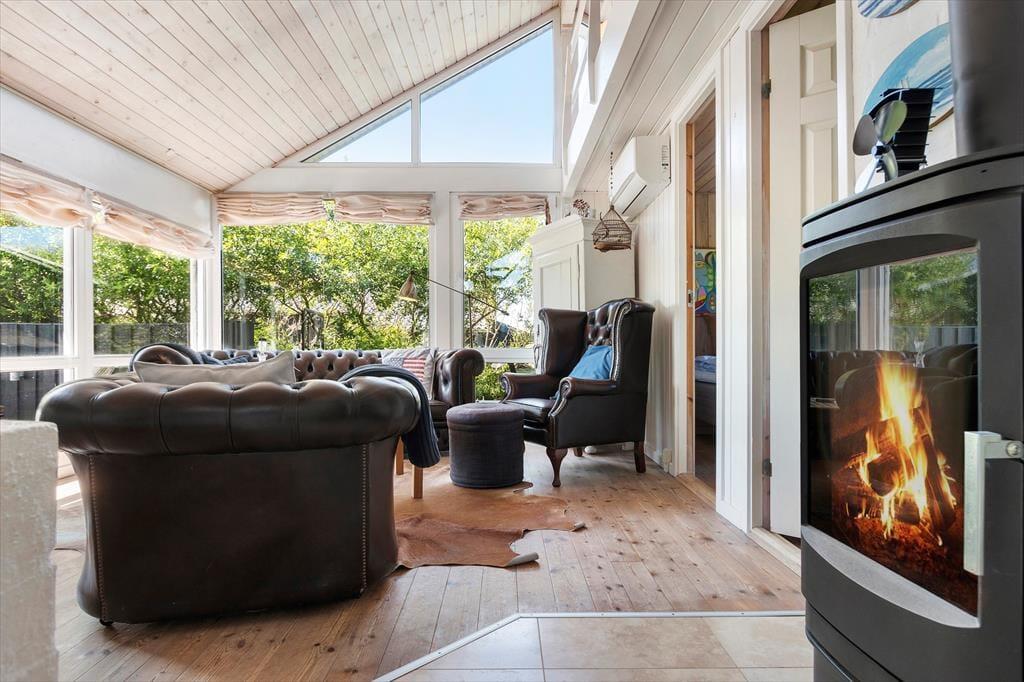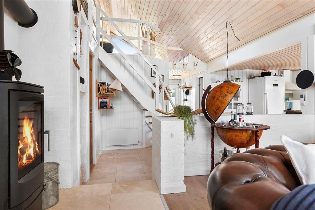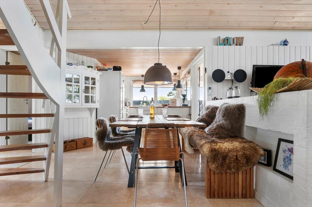 Der durchdachte Grundriss des Ferienhauses schafft eine angenehme und einladende Atmosphäre. Der helle Wohnraum mit großen Fensterfronten lässt die Natur ins Haus und schafft eine wunderbare, ruhige Stimmung. Hier kannst du mit der Familie gemütliche Mahlzeiten am Esstisch genießen oder dich mit einem guten Buch auf dem Sofa entspannen. Die moderne und funktionale Küche macht es dir leicht, nach einem Tag am Strand oder einem Ausflug in die Umgebung leckere Mahlzeiten zuzubereiten. Der Kamin im Wohnzimmer ist der perfekte Treffpunkt an kühleren Abenden, wo du die Wärme und Gemütlichkeit im ganzen Haus spüren kannst.