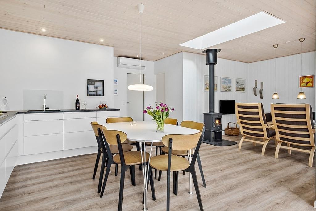 Mit einem Schlafraum im Nebengebäude und zwei Schlafräumen im Ferienhaus bietet dir dieses Urlaubsdomizil Platz für sechs Personen. Auch wenn du nicht mit fünf anderen Personen anreist, genießt du ein Maximum an Gemütlichkeit - ruhige Vormittage mit einem frischen Kaffee im Wintergarten, entspannte Lesestunden vor dem Kaminofen und stimmungsvolle Mahlzeiten mit deinem Herzensmenschen sind eine tolle Alternative zu turbulenten Urlaubstagen mit der gesamten Familie. Nach der letzten Renovierung im Jahr 2017 präsentieren sich alle Räumlichkeiten überaus einladend. Besonders erwähnenswert ist in diesem Zusammenhang die richtig schöne Küche, die das Herz eines jeden Hobbykochs höher schlagen lässt. Selbst wenn du lieber außer Haus in einem der guten Restaurants von Blokhus isst, ist es dennoch schön, kleinere Mahlzeiten und das Frühstück in angenehm hellen Ambiente zubereiten zu können.