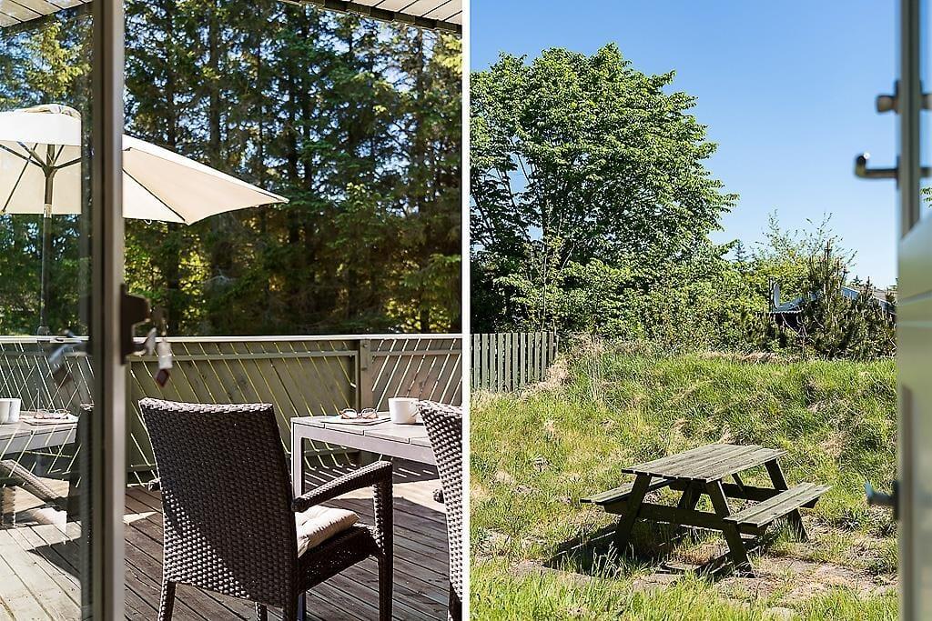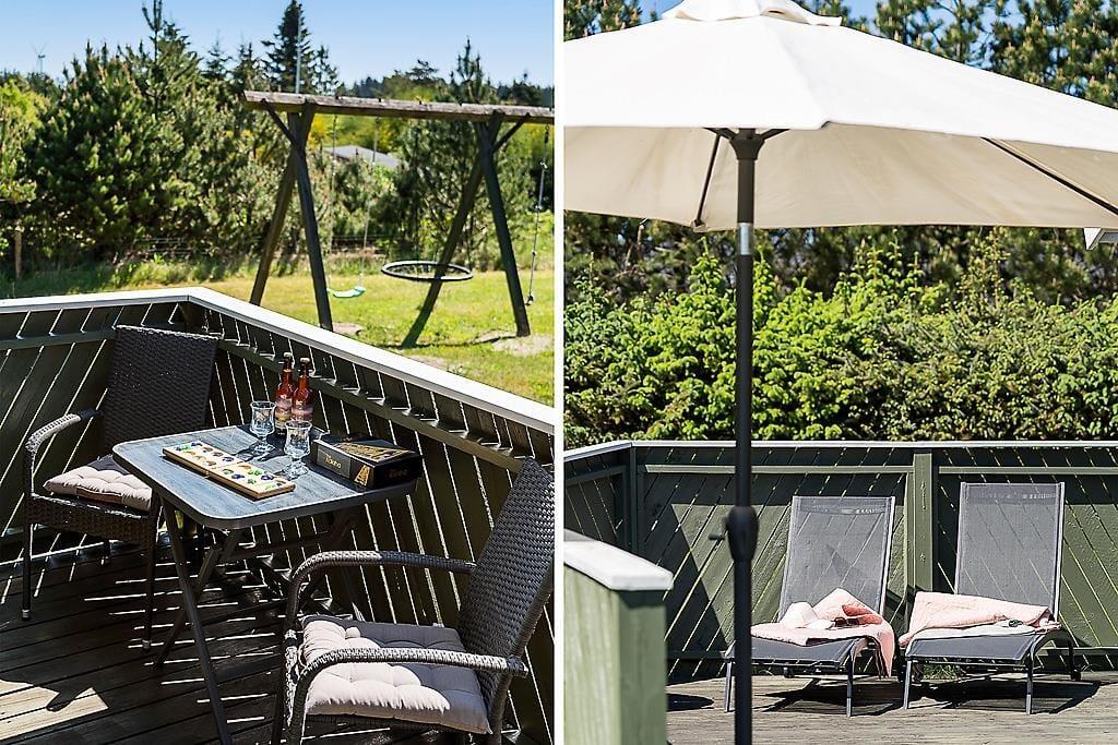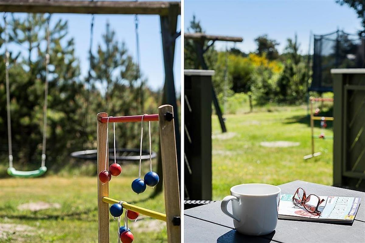 Het ruime perceel van meer dan 1200 m² biedt volop buitenspeelruimte voor kinderen met onder andere een schommel, zandbak en trampoline. Daarnaast beschikt het huis over een deels overdekt terras met ligstoelen en een parasol, ideaal om te genieten van de frisse buitenlucht. De locatie is rustig gelegen, met het strand op ongeveer 2200 meter afstand en een supermarkt binnen 1800 meter, wat het verblijf extra aangenaam maakt.