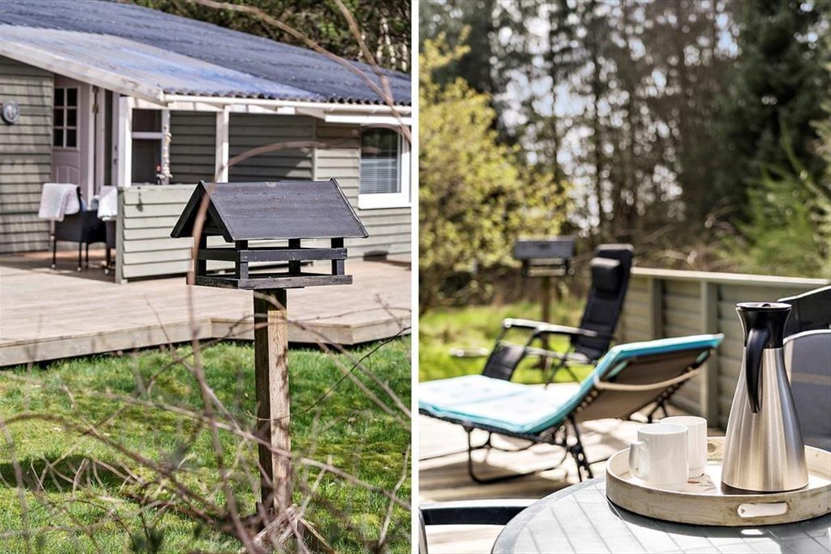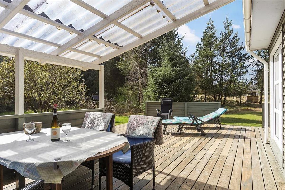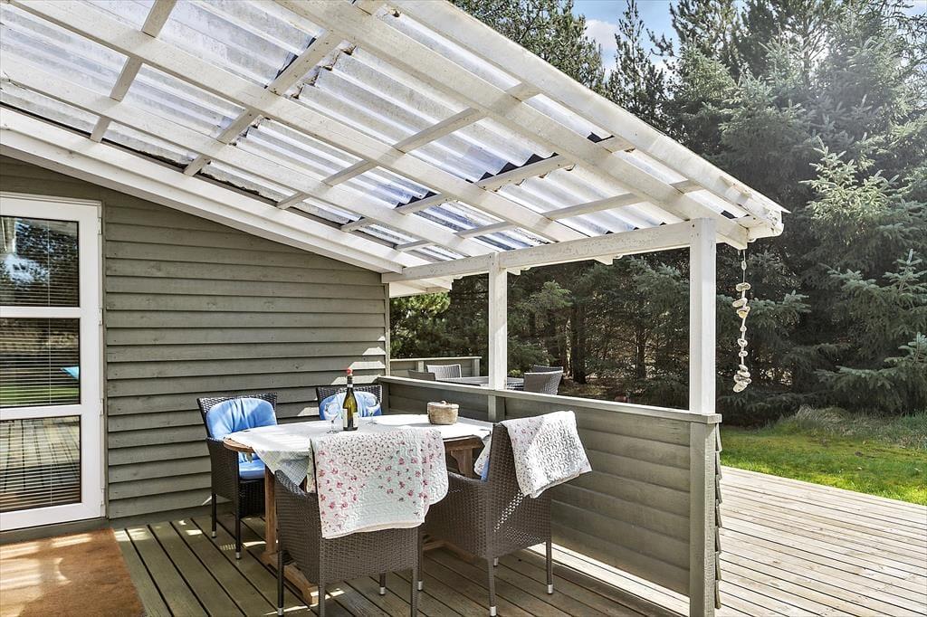 Auf dem großen, nach Süden ausgerichteten Terrassenareal werdet ihr gern einen Großteil eures Sommerurlaubs verbringen. Zu jeder Zeit findest du hier einen schönen Aufenthaltsplatz in der Sonne - morgens, mittags und abends. Falls du eher den kühlen Schatten bevorzugst, rückst du mit deinem Gartenstuhl unter die Terrassenüberdachung. Der überdachte Bereich erweist sich außerdem an den langen Sommerabenden, wenn sich die Dunkelheit langsam über das Ferienhausgebiet senkt, als ausgesprochen schöner Rückzugsort. Hohe Bäume schirmen dein Naturgrundstück gut ab. Die Grasfläche animiert sicher nicht nur deine Kindern zum ausgelassenen Umhertollen und zu Gartenspielen aller Art.