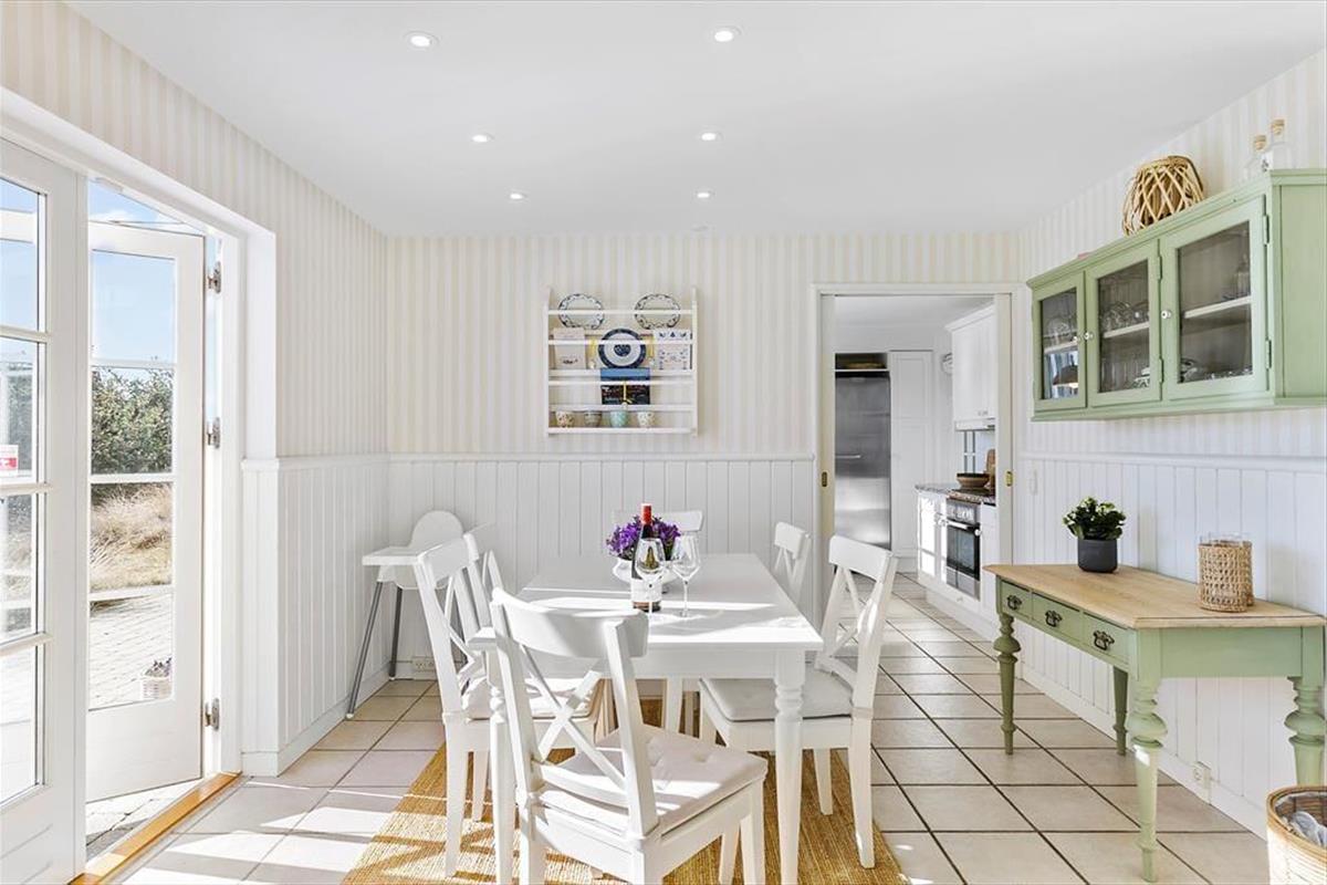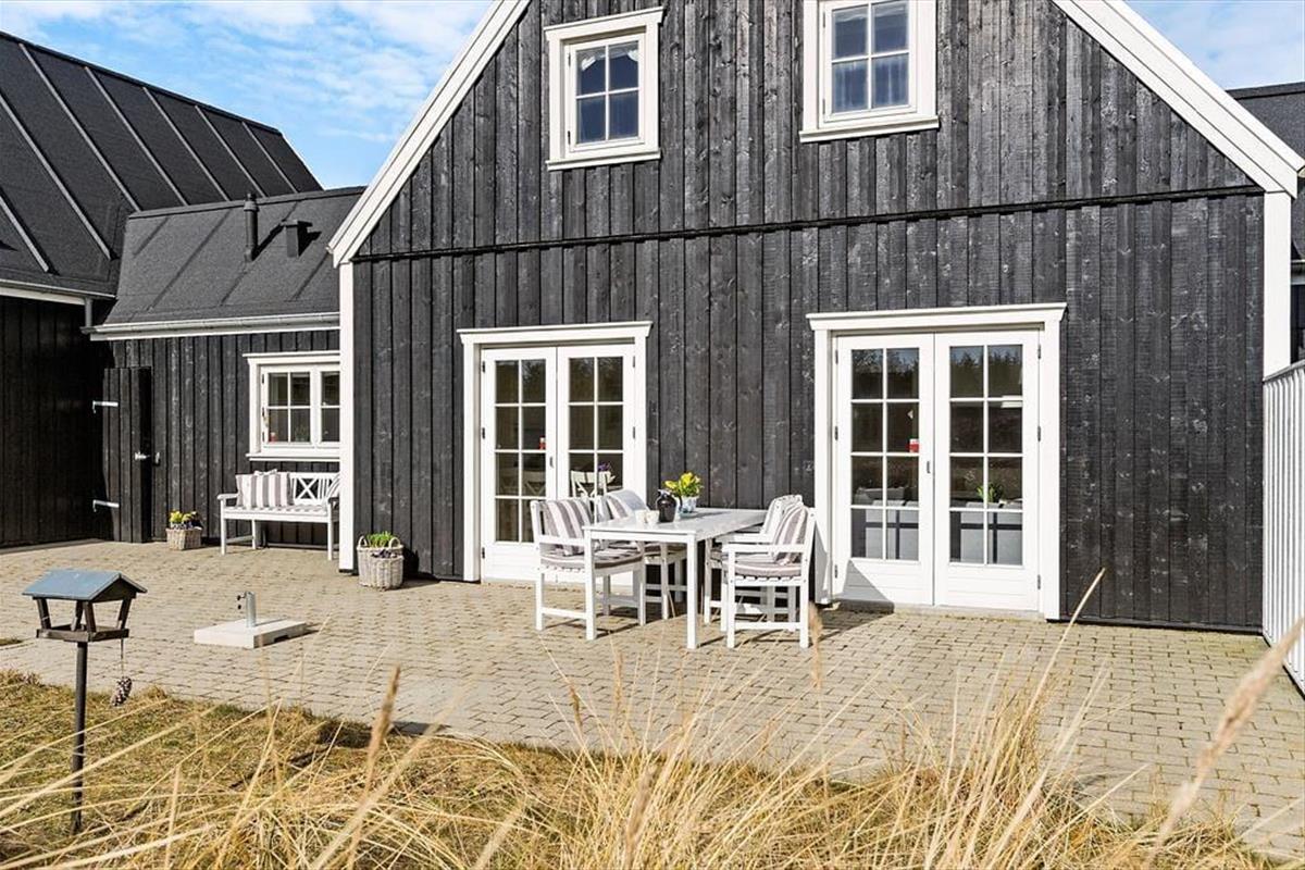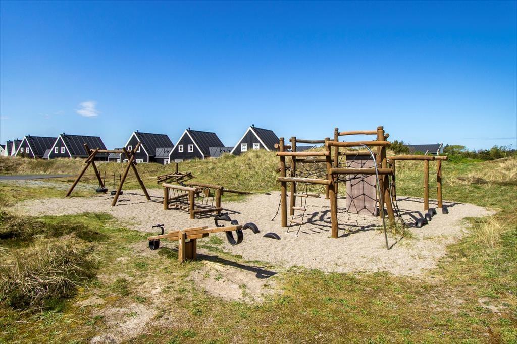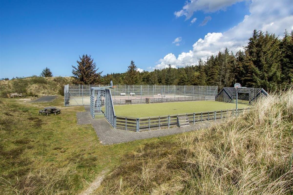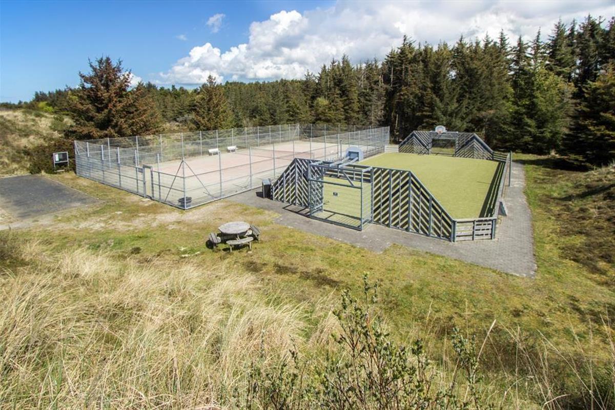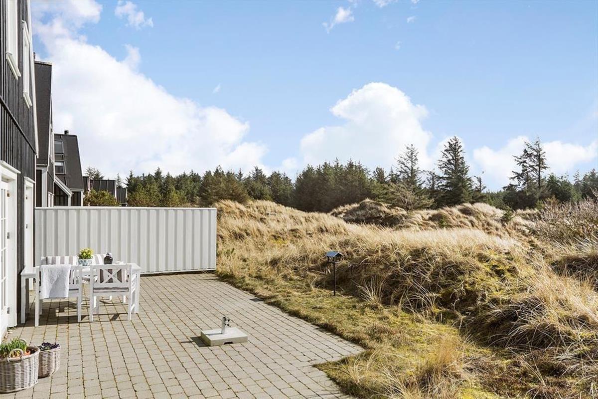 Auf der Nordseite des Ferienhauses können Sie sich auf der gemütlichen Terrasse entspannen, die gut geschützt zwischen dem Haus und dem Carport liegt. Nach Süden hin ist die Terrassenfläche noch größer. Hier finden Sie ausgezeichnete Sonnenverhältnisse vor sowie einen schönen Blick auf die herrliche Dünenlandschaft und die hohen Kiefern der Plantage. Vom Haus aus ist es nicht nur ein Katzensprung zum Waldrand, sondern auch zum Spielplatz von Ferren Syd und zum Tennis- und Mehrzweckplatz.