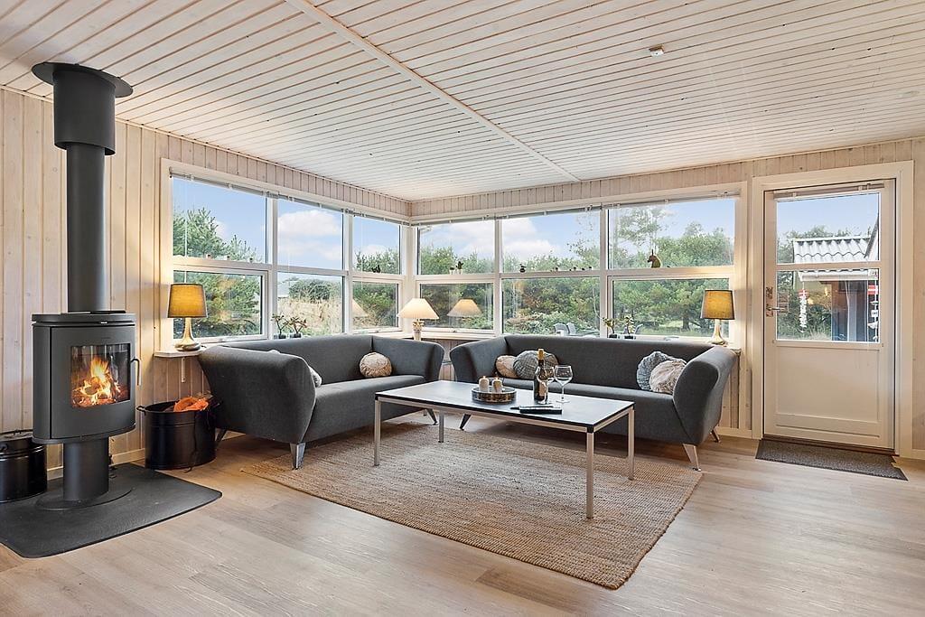 Mit seinen drei Schlafräumen, dem Duschbadezimmer und dem Wohnraum samt integrierter Küche beherbergt dieses Ferienhaus bis zu sechs Personen. Ein Teil der 80 m² umfassenden Wohnfläche ist dem kleinen Wintergarten gewidmet, der sich sehr schön für kühlere Tage und Abende anbietet. Durch die Wohnraumfenster blicken Sie auf Ihr grünes Grundstück - beispielsweise wenn Sie es sich auf den Sofas nah am Kaminofen gemütlich machen. Für Unterhaltung und Abwechslung sorgt derweil der Flachbild-TV, der mit Kabelfernsehen und Chromecast ausgestattet ist.