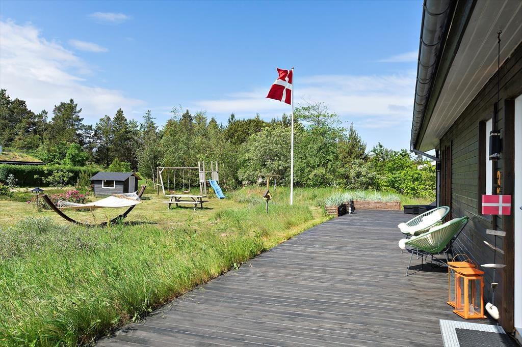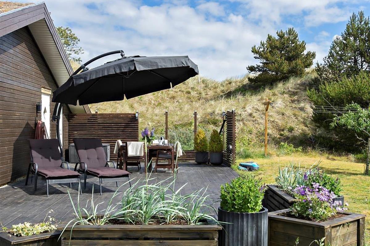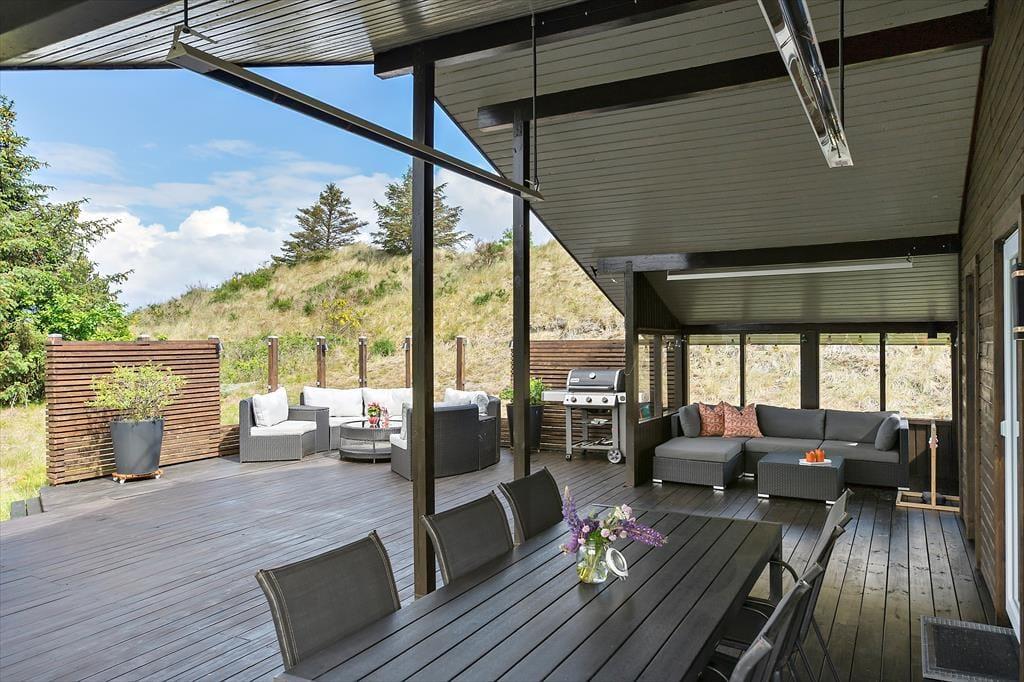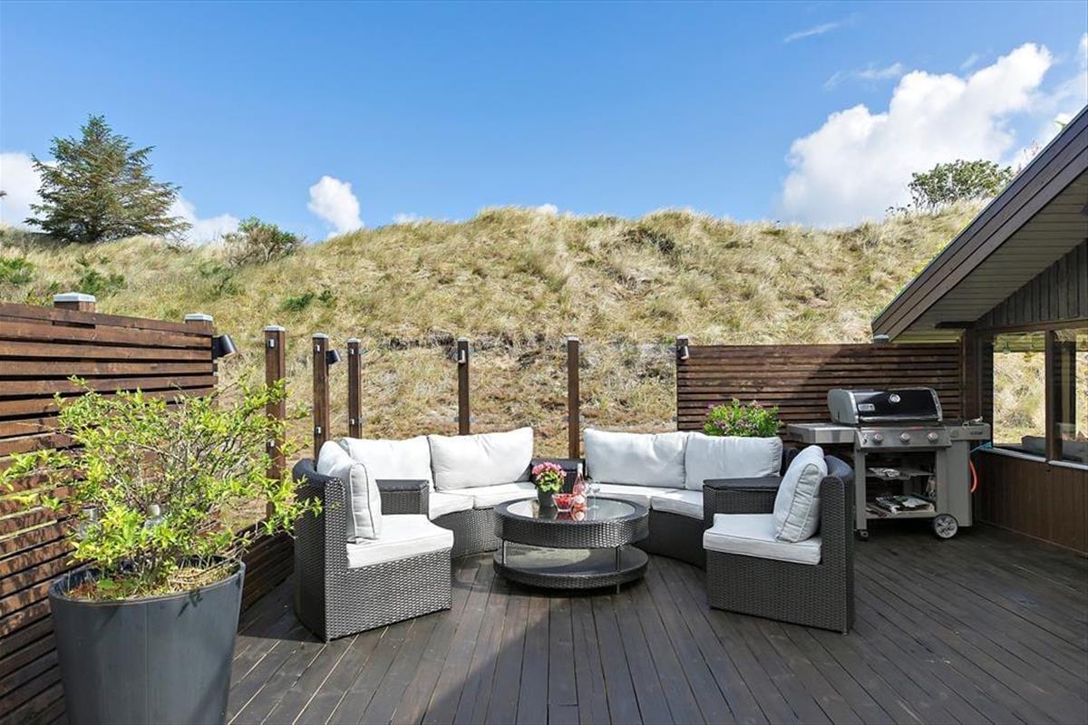 Schön geht es auch auf dem 2.200 m² großen Grundstück zu. Das Grundstück ist von hohen Bäumen und einer abschirmenden Dünenreihe umgeben. Auf der Grasfläche kann sich Ihre gesamte Familie beim Fußball vergnügen. Für die jüngsten Gäste stehen zudem eine Sandkiste, eine Schaukel, ein Spielhaus und ein Spielturm zur Verfügung. An drei Seiten des Hauses befinden sich attraktive Terrassen. Hier werden Sie stets ein sonniges Plätzchen finden. Die gen Westen weisende Terrasse ist teilweise überdacht und bietet sich daher sehr gut für die langen Sommerabende an. Eine Windschutzwand sorgt für angenehm gemütliche Stunden im Freien - ohne dabei die schöne Natur ringsum zu verdecken. Dies ist nur ein Beispiel dafür, wie wohldurchdacht die Außenbereiche dieses Hauses gestaltet wurden.