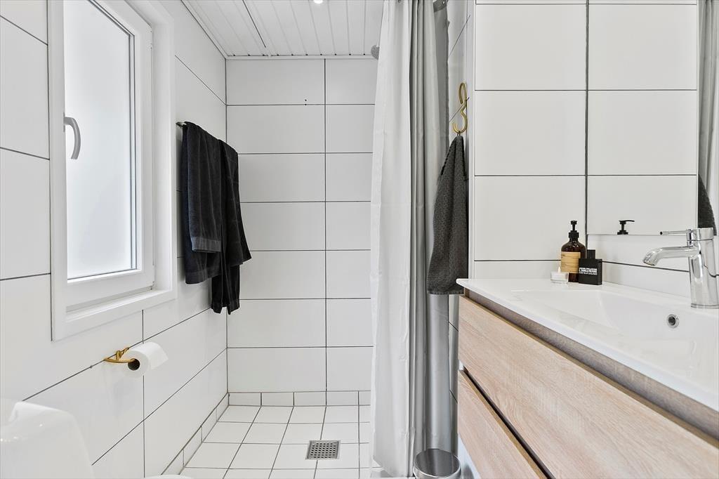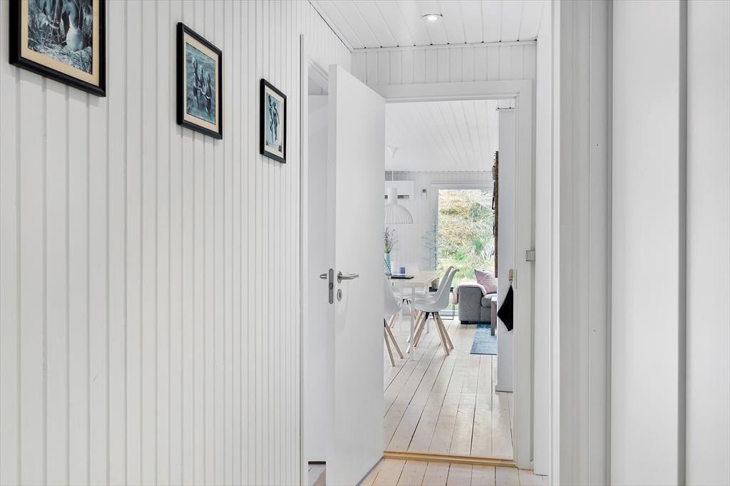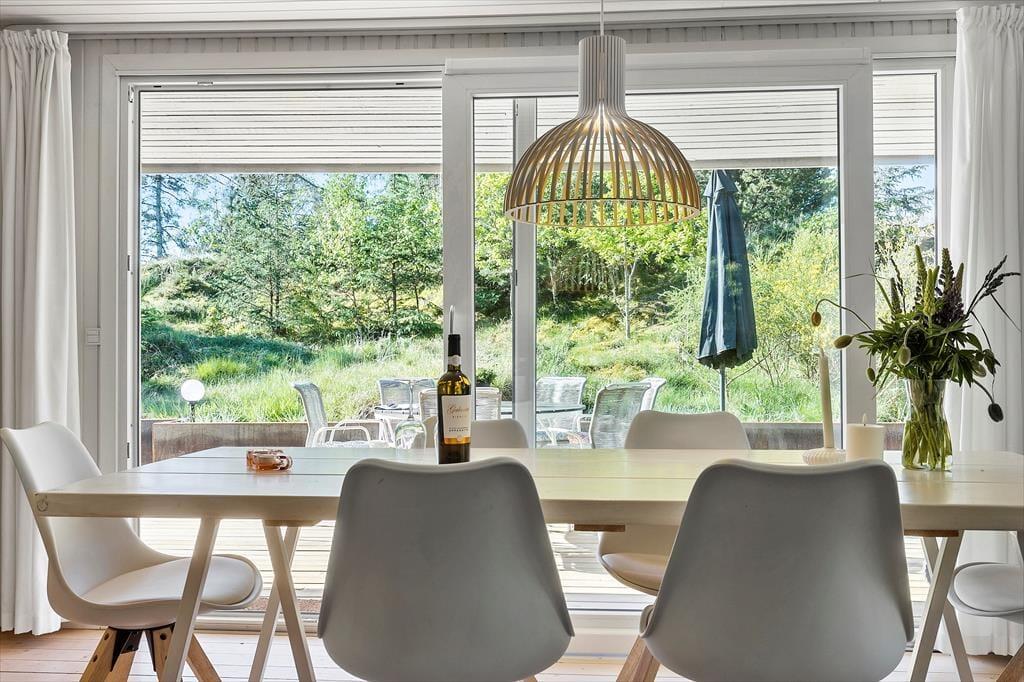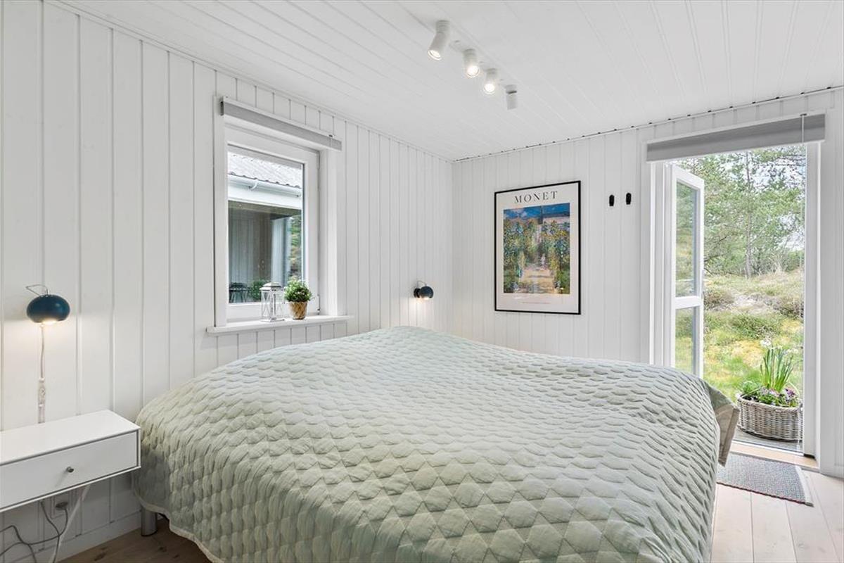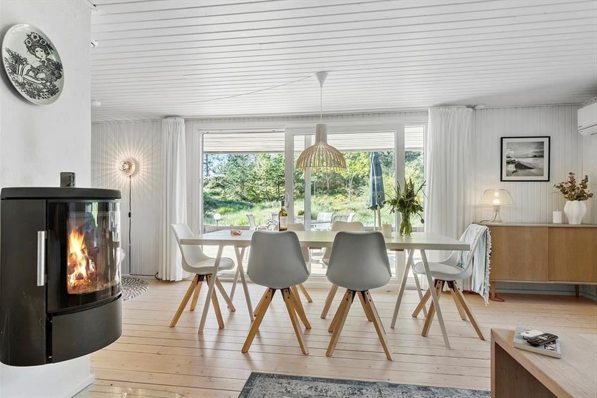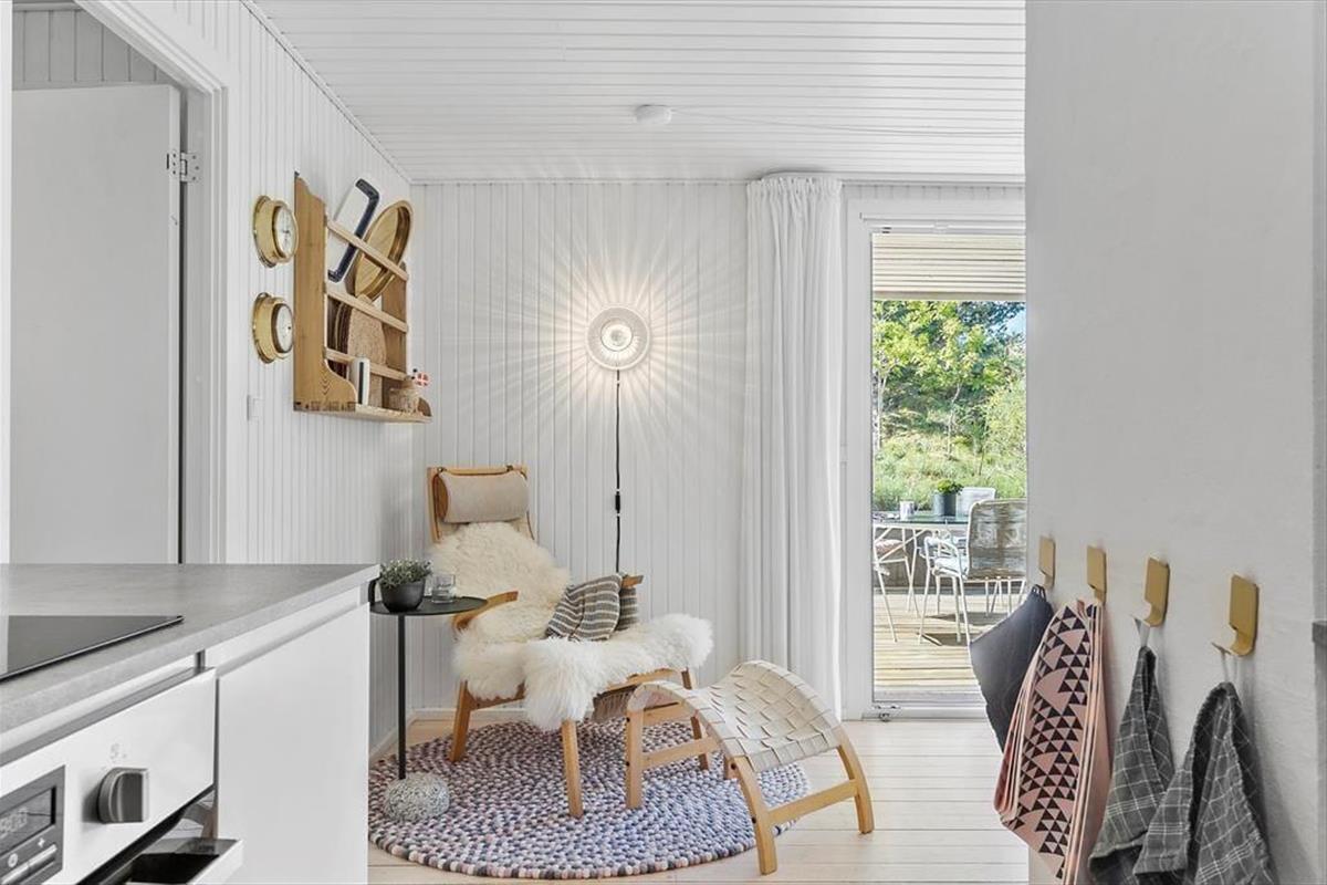 Mit seinem begrünten Dach und der dunklen Holzfassade fügt sich das Haus perfekt in die Natur ringsum ein. Das Hausinnere präsentiert sich nach einer gelungenen Renovierung im Jahr 2020 angenehm schlicht, hell und luftig. Die Renovierung und Modernisierung umfasste unter anderem das gute Badezimmer und die schöne Küche. Letztgenannte ist offen mit dem Wohnraum verbunden. Beim Wohnraum handelt es sich um einen ansprechenden Aufenthaltsraum mit einem Kaminofen, einem Flachbild-TV und großen Fenstern, die einen Ausblick auf das Naturgrundstück gewähren. Die Möblierung verleiht dem Raum eine schön warme Wohnatmosphäre - kurzum genau das, was man im Urlaub benötigt. Die drei Schlafzimmer sind mit je einem Doppelbett eingerichtet.