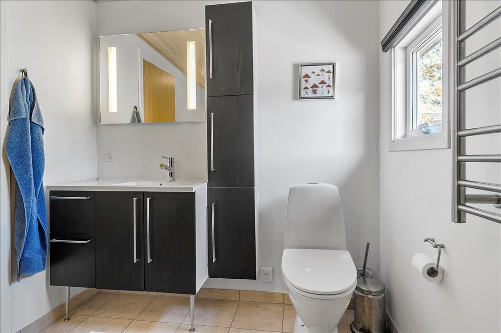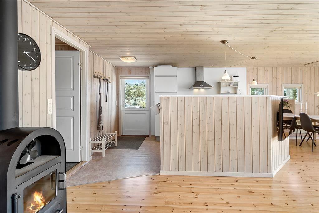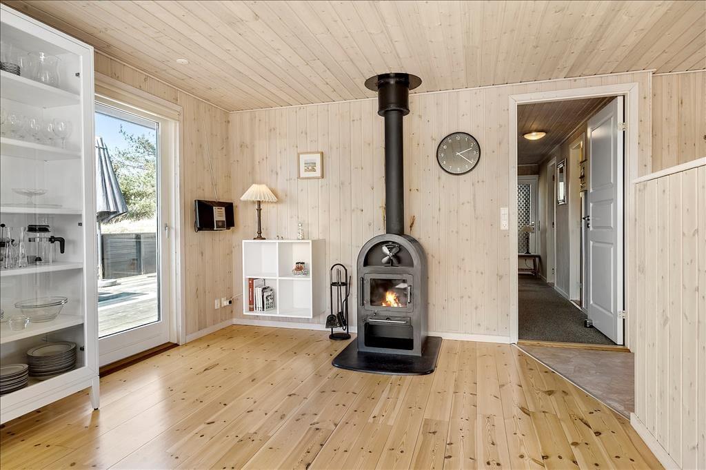 Sowohl das Ferienhaus als auch das kleine Nebengebäude präsentieren sich in schöner, klassischer Ferienhausmanier mit einer schwarz gestrichenen Holzfassade und weißen Fensterrahmen. Im Hausinneren erwartet Sie eine helle und einladende Atmosphäre, die unter anderem auf die gelungene Renovierung und Modernisierung im Jahr 2006 zurückzuführen ist. Der Küchen-, Wohn- und Essbereich wird Dank der großen Fensterpartie von einem herrlichen Tageslichteinfall erfüllt. Zudem genießen Sie einen schönen Ausblick bis hoch in den hohen, blauen Himmel. Im Wohnraum sorgt ein Fernseher mit Chromecast-Anschluss für Unterhaltung, während Sie es sich an kühleren Abenden vor dem romantisch knisternden Kaminofen gemütlich machen. Die offene Küche ist gut ausgestattet, sodass Sie ohne weiteres köstliche Urlaubsmahlzeiten kreieren können. Das Haus beherbergt darüberhinaus zwei schöne Schlafzimmer und ein Badezimmer mit einer Waschmaschine und einer Fußbodenheizung. Das Nebengebäude bietet ausreichend Platz und Schlafgelegenheiten für zwei weitere Urlaubsgäste.
