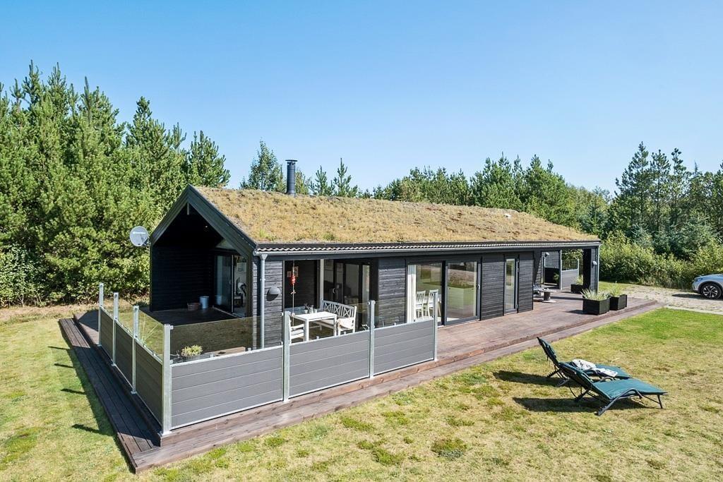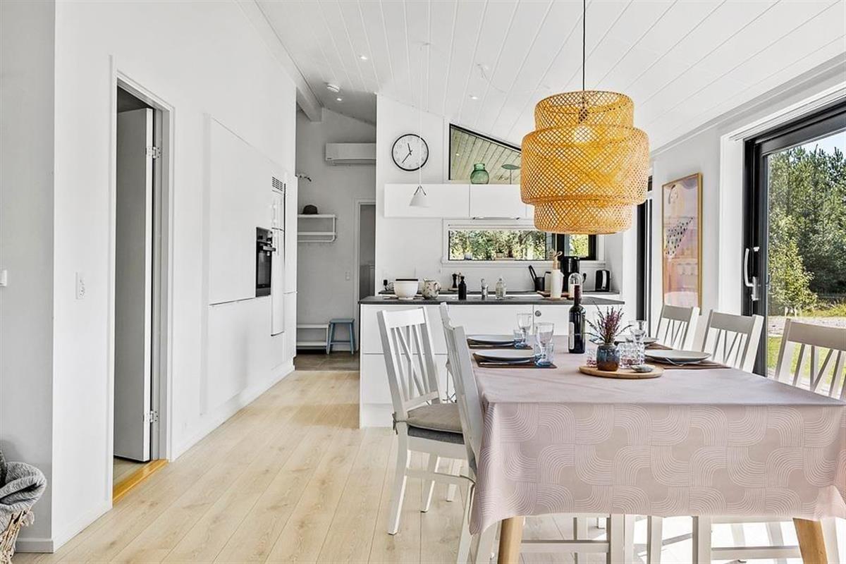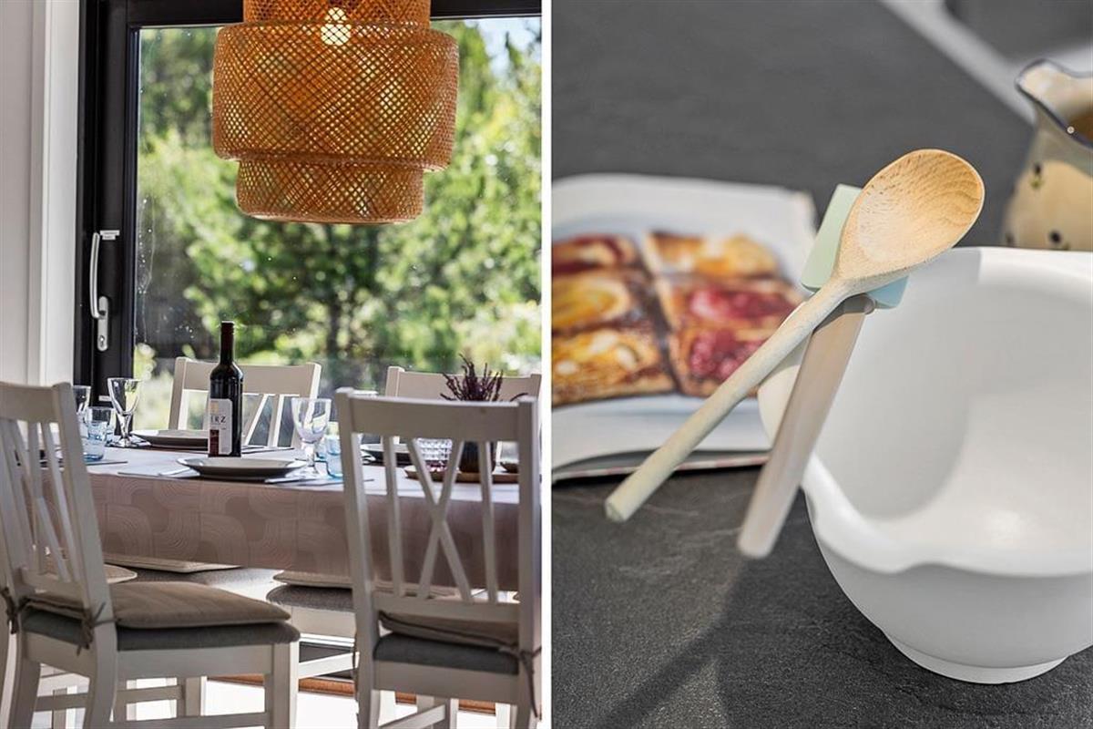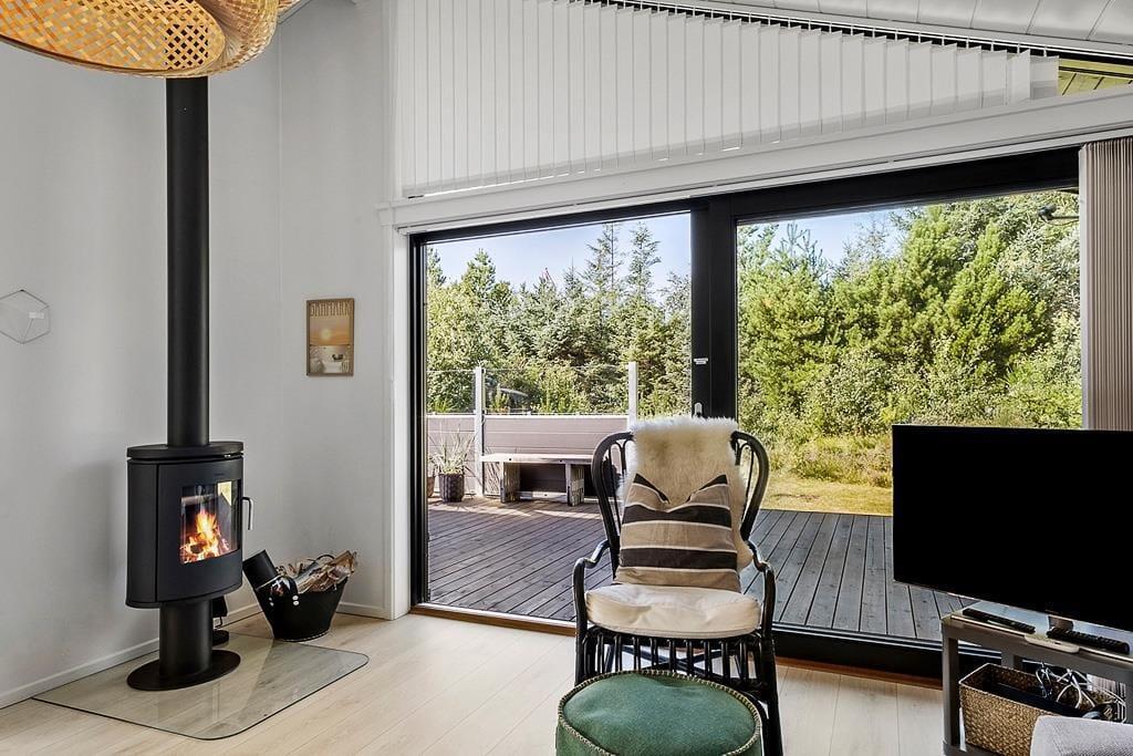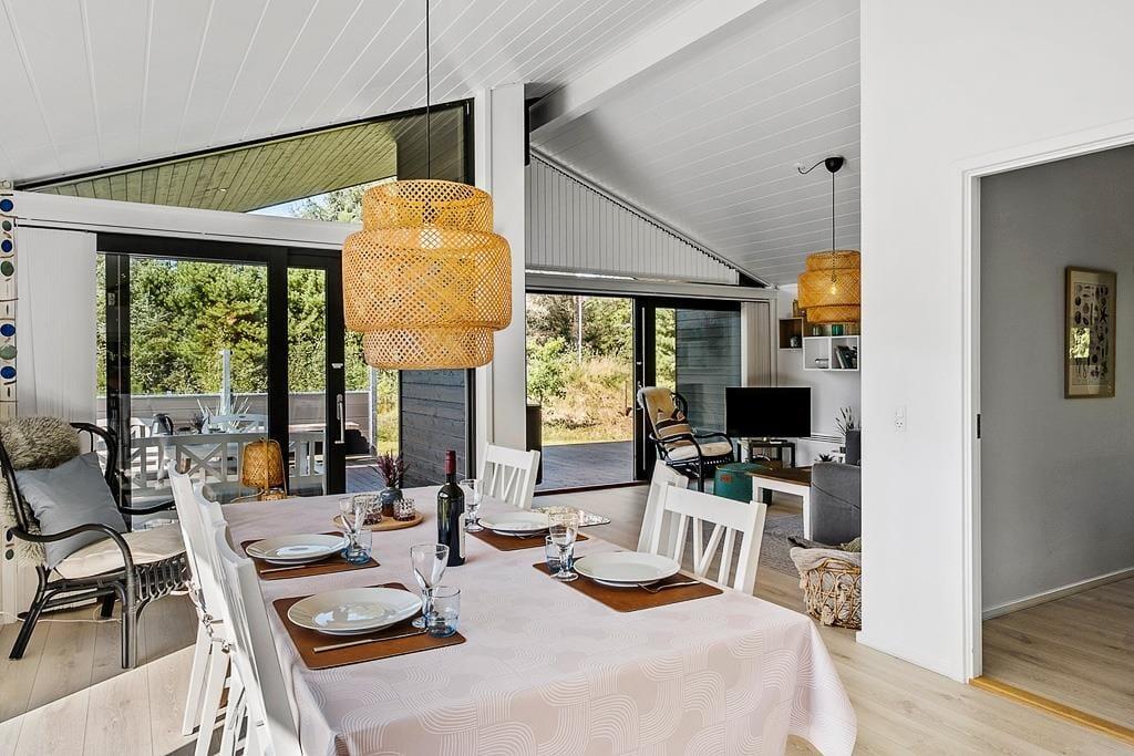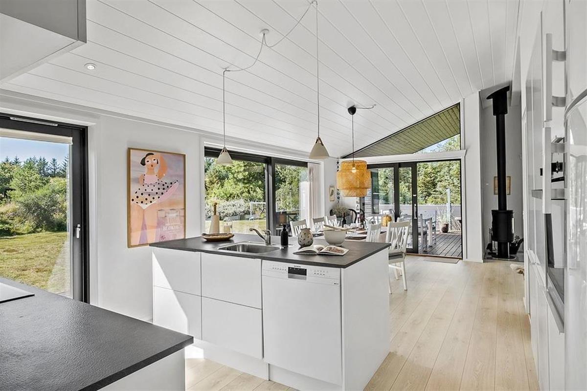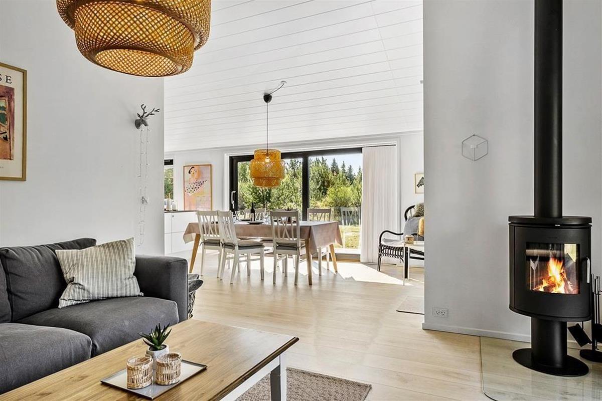 Das Haus wurde erst 2018 gebaut und es wurden nur die besten Materialien dafür verwendet. Es ist eine Freude im Haus zu bleiben - nicht zuletzt im Wohnbereich, der ein herrlicher Raum mit hohen Decken und großen Fensterfronten im Süden, Osten und Westen hat. Die Fenster lassen natürlich eine Menge Tageslicht hinein und geben gleichzeitig die Sicht auf die Kiefern frei, die das Naturgrundstück umgeben. An dem einen Ende des Raumes befindet sich eine gut ausgestattete Küche. In der Mitte steht der Esstisch, während in der Nähe des Kaminofens eine weiche Sofagruppe steht. Kurz gesagt können hier alle gemeinsamen Urlaubsaktivitäten stattfinden. Außerdem gibt es drei Schlafzimmer, eine Gästetoilette und ein Badezimmer, die alle elegant, stilvoll und komfortabel eingerichtet sind.