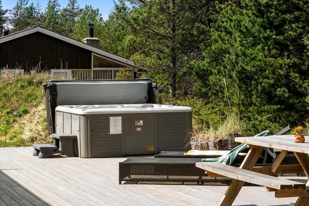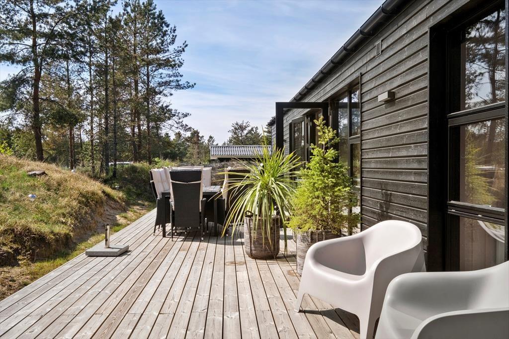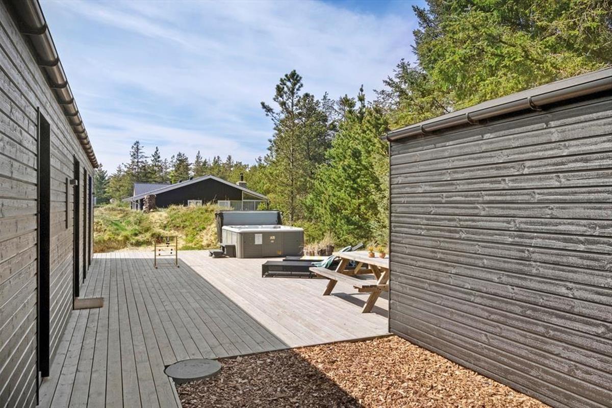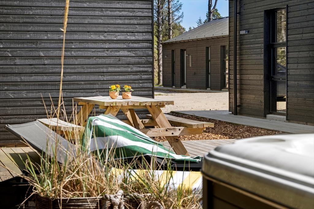Das herrliche Ferienleben kann sich auch außerhalb auf den großen Holzterrassen abspielen, die sich rund um das Ferienhaus erstrecken. Hier können Sie im Sonnenschein für den Lunch eindecken oder Sie machen eine Siesta im Schatten des Sonnenschirms und die kleineren Kinder können im Sandkasten spielen. An einem stillen Spätsommerabend ist es reiner Luxus im Außen-Whirlpool auf dem ruhigen Naturgrundstück zu sitzen, während die Dunkelheit sich langsam über das Kryle Klit senkt.