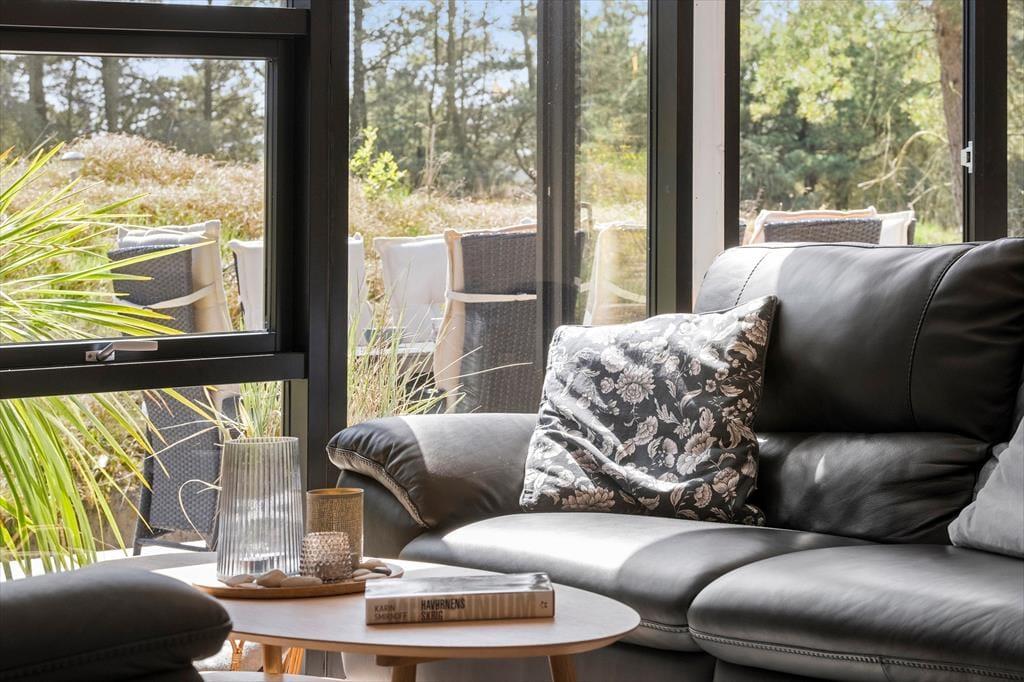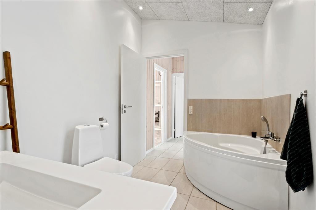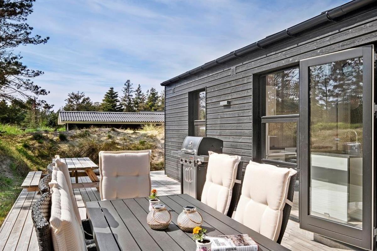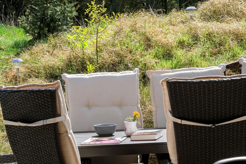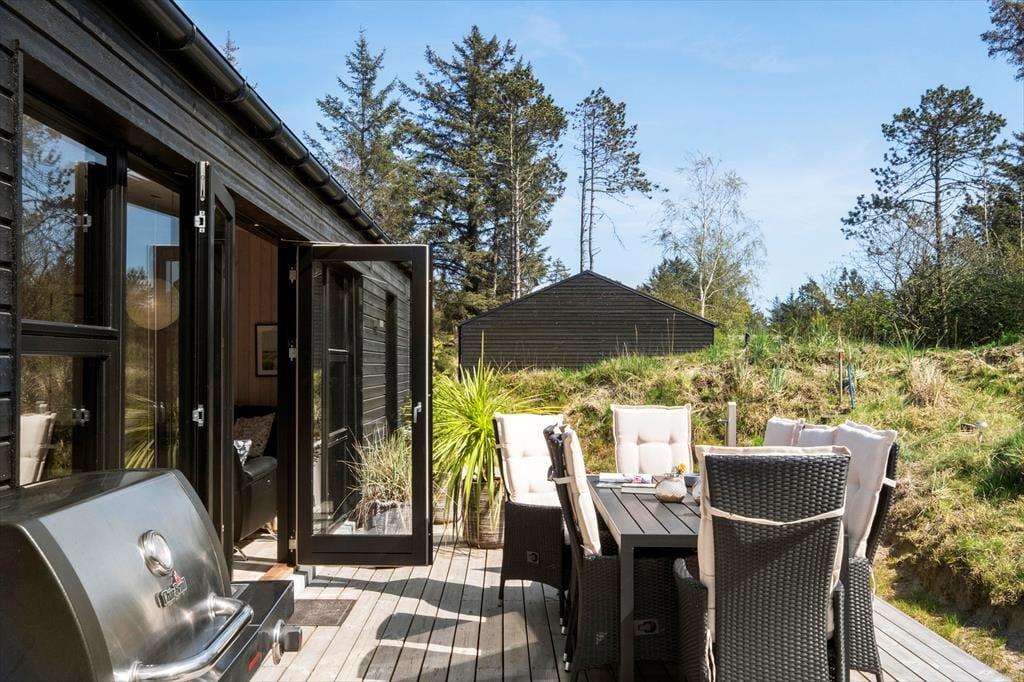 Das herrliche Ferienleben kann sich auch außerhalb auf den großen Holzterrassen abspielen, die sich rund um das Ferienhaus erstrecken. Hier können Sie im Sonnenschein für den Lunch eindecken oder Sie machen eine Siesta im Schatten des Sonnenschirms und die kleineren Kinder können im Sandkasten spielen. An einem stillen Spätsommerabend ist es reiner Luxus im Außen-Whirlpool auf dem ruhigen Naturgrundstück zu sitzen, während die Dunkelheit sich langsam über das Kryle Klit senkt.